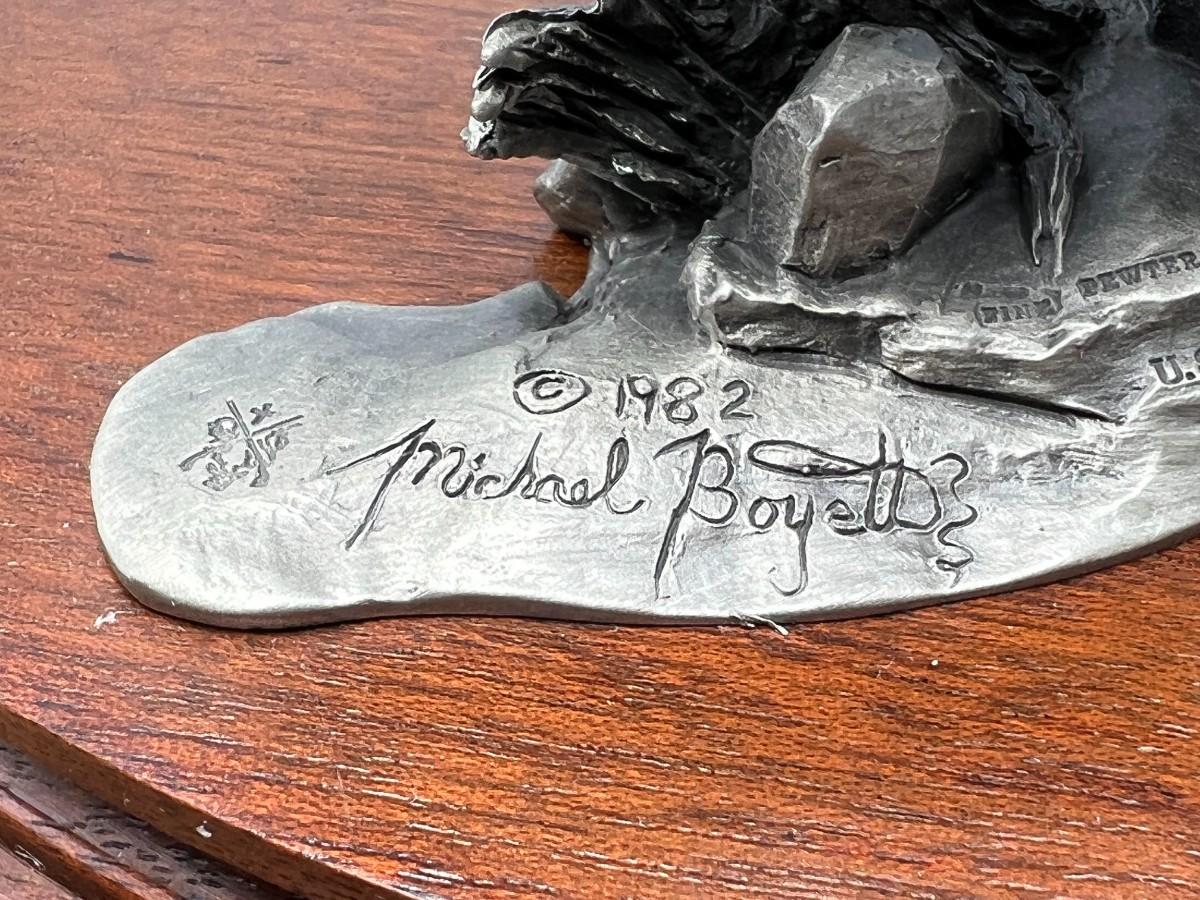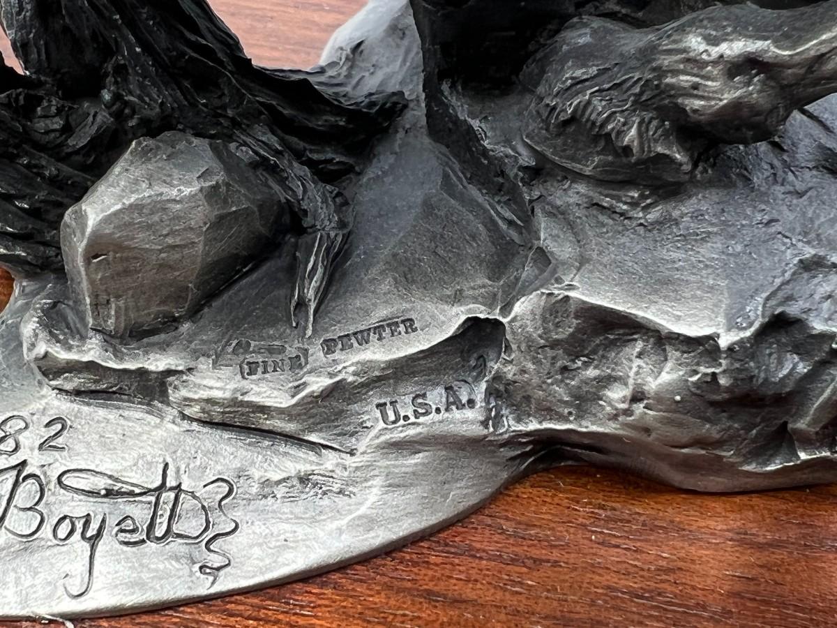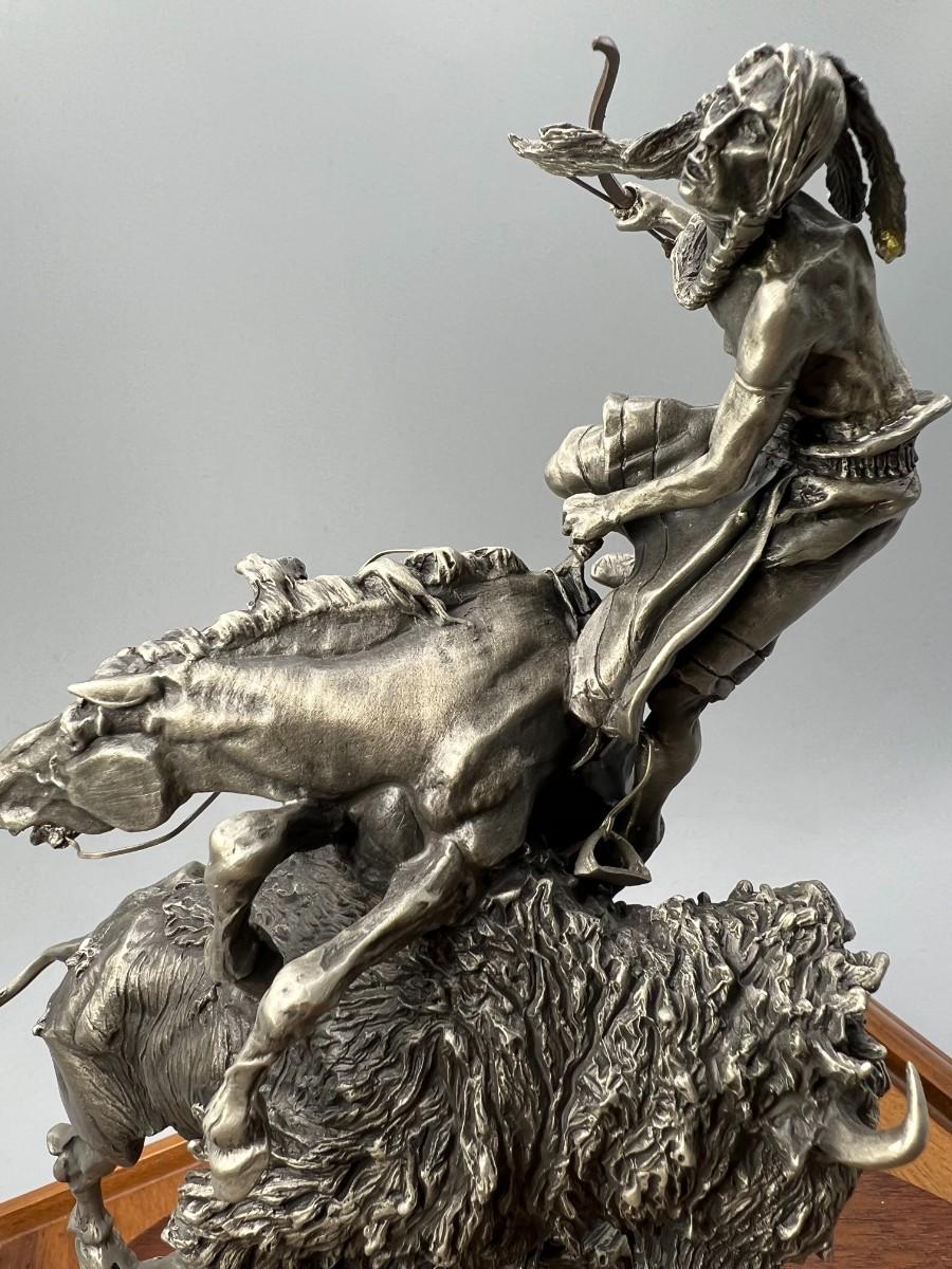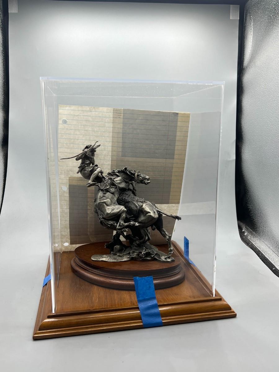 Bison's Fury Pewter Statuette Limited Edition with COA and Display Case. In good condition. Has a plexiglass display cover and wood base. Sculpted by Michael Boyett. Statue is about 7"size, under 12" with cover.