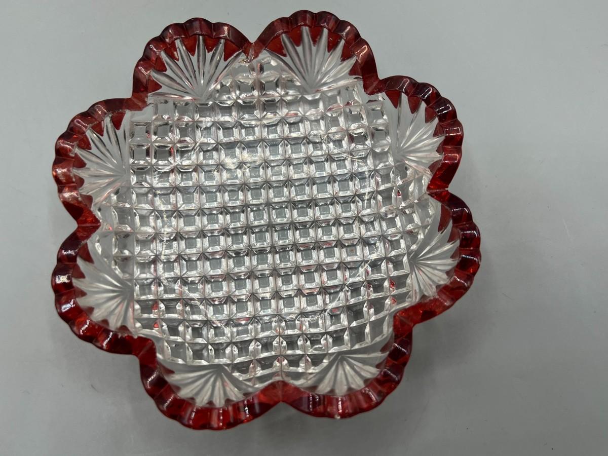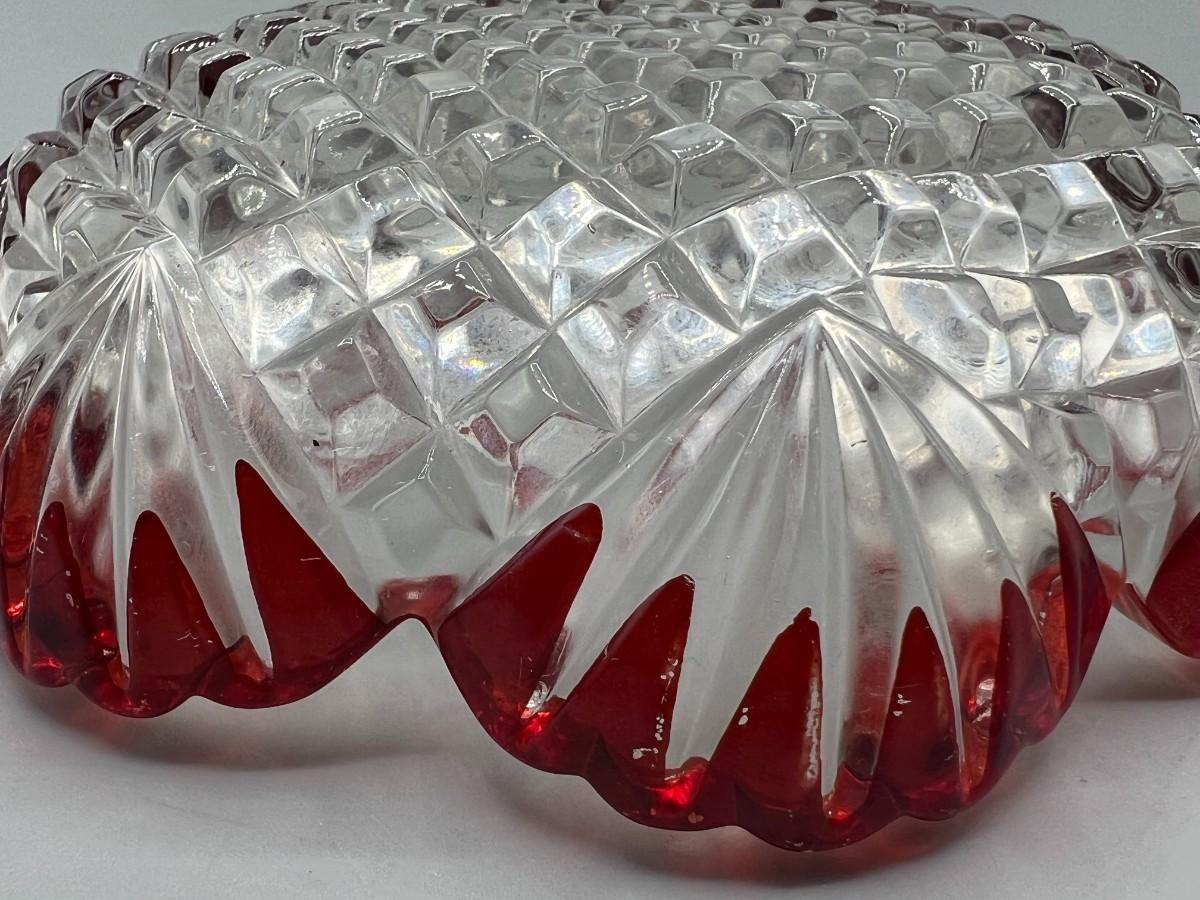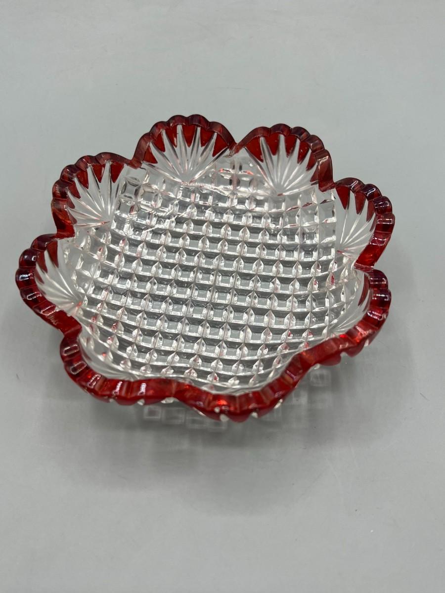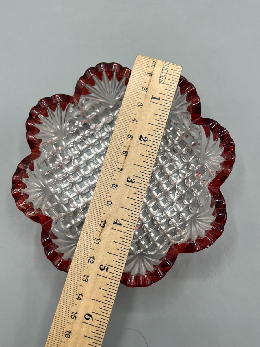 Vintage Ruby Red Scalloped Edge Pressed Glass Crystal Dish. In good condition. Edge looks painted more than red cut to clear. 5" diameter.