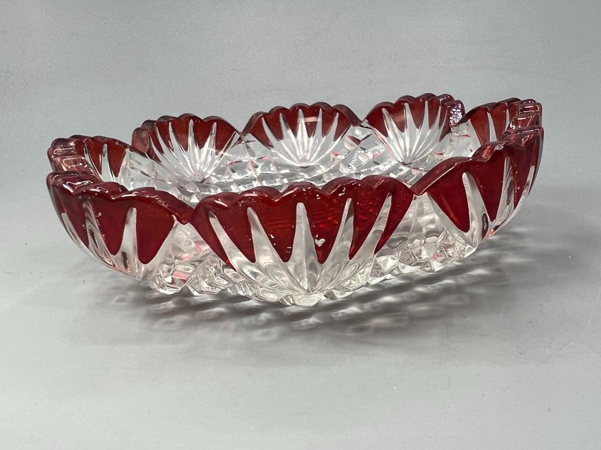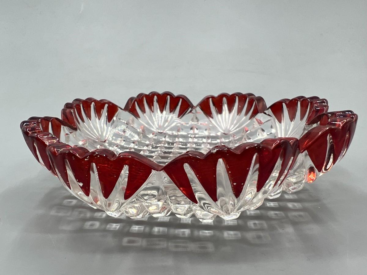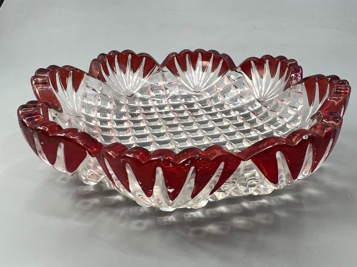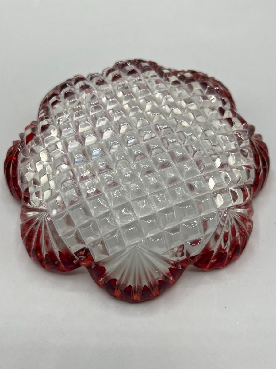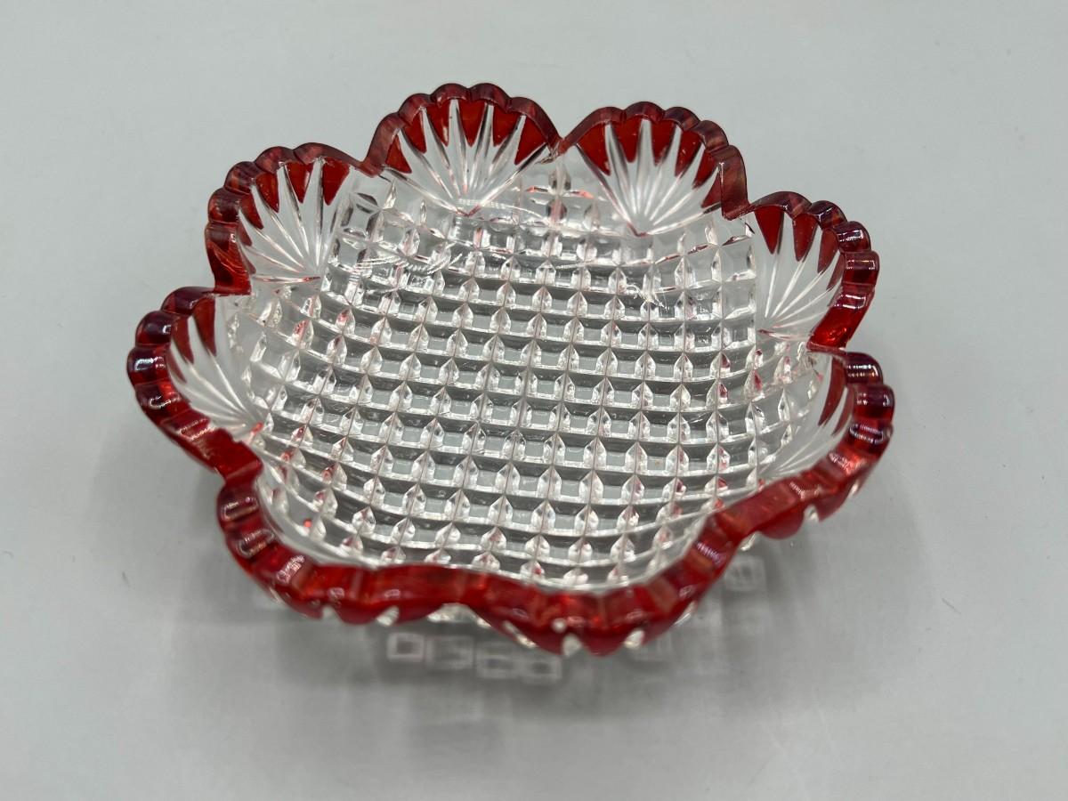 Vintage Ruby Red Scalloped Edge Pressed Glass Crystal Dish. In good condition. Edge looks painted more than red cut to clear. 5" diameter.