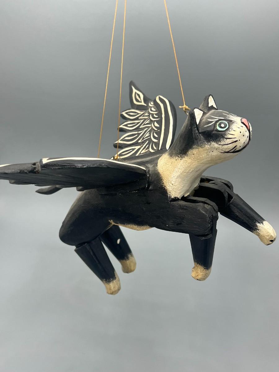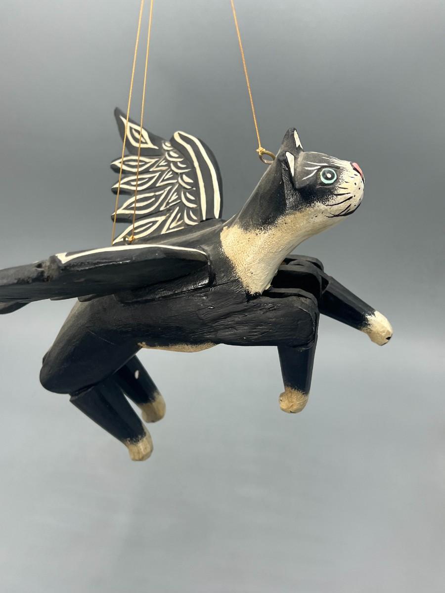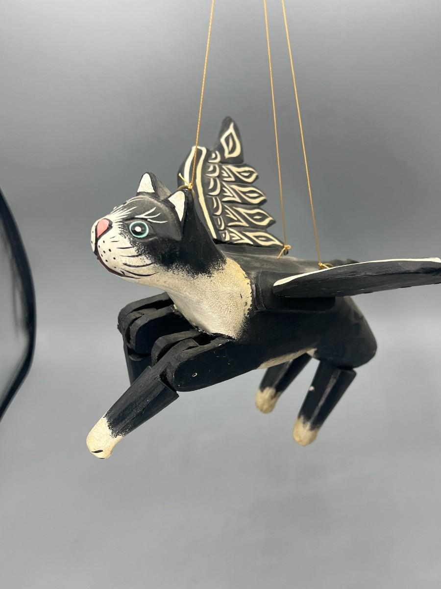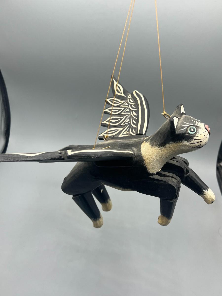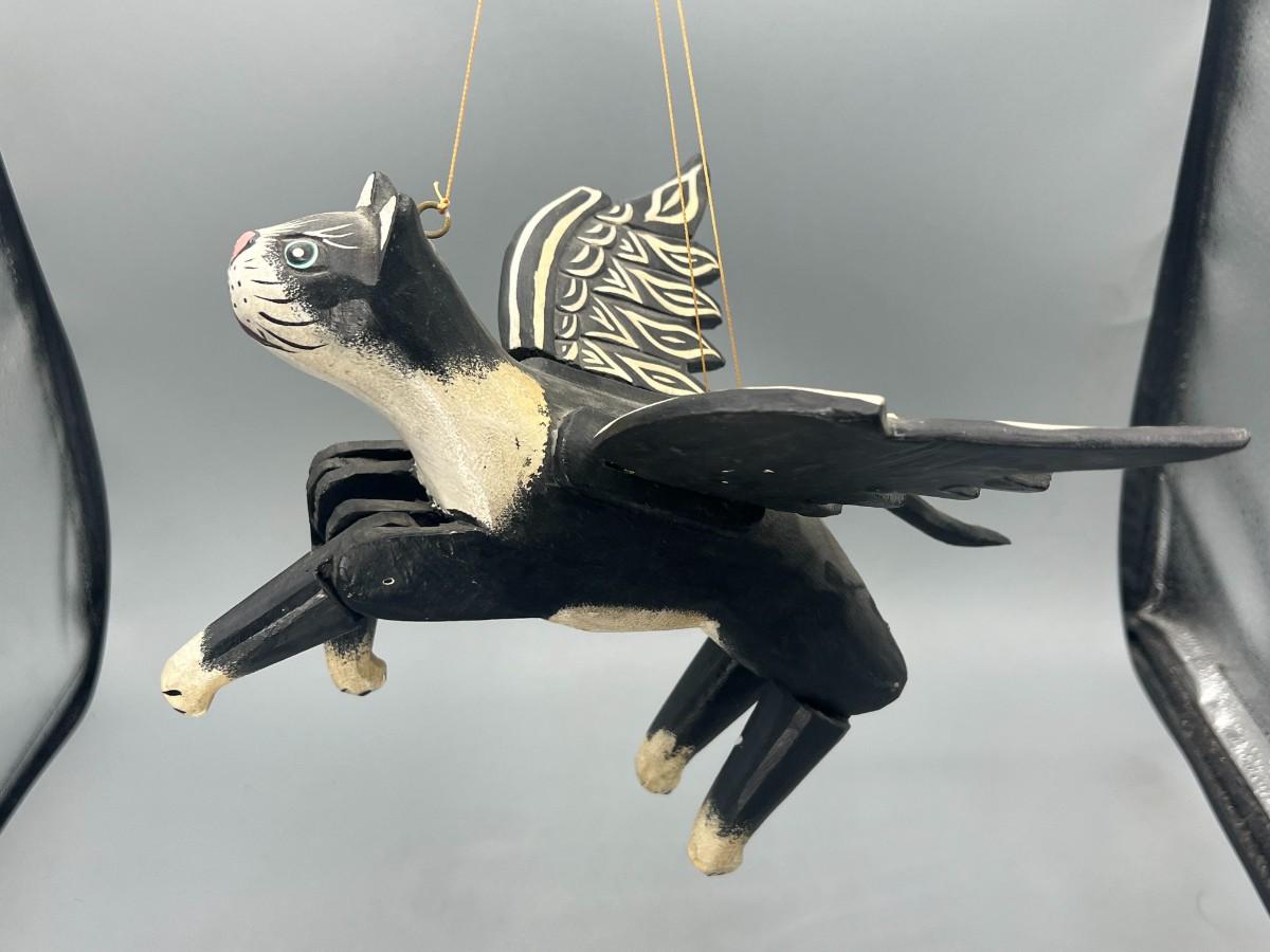 Retro Wooden Painted Black & White Hanging Decor Winged Flying Angel Cat