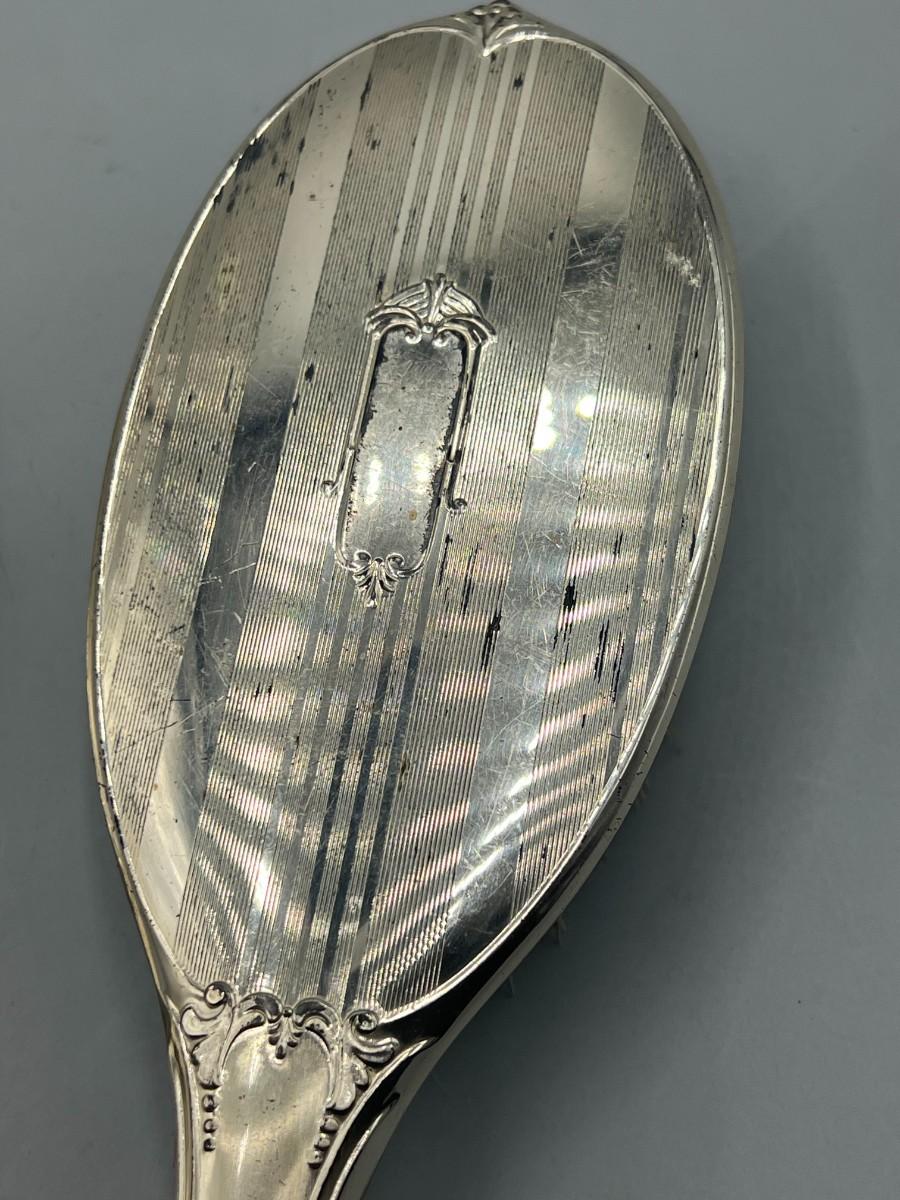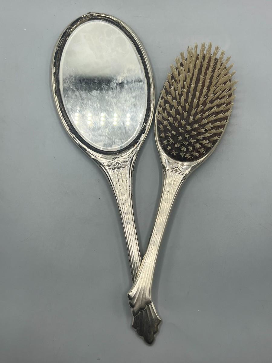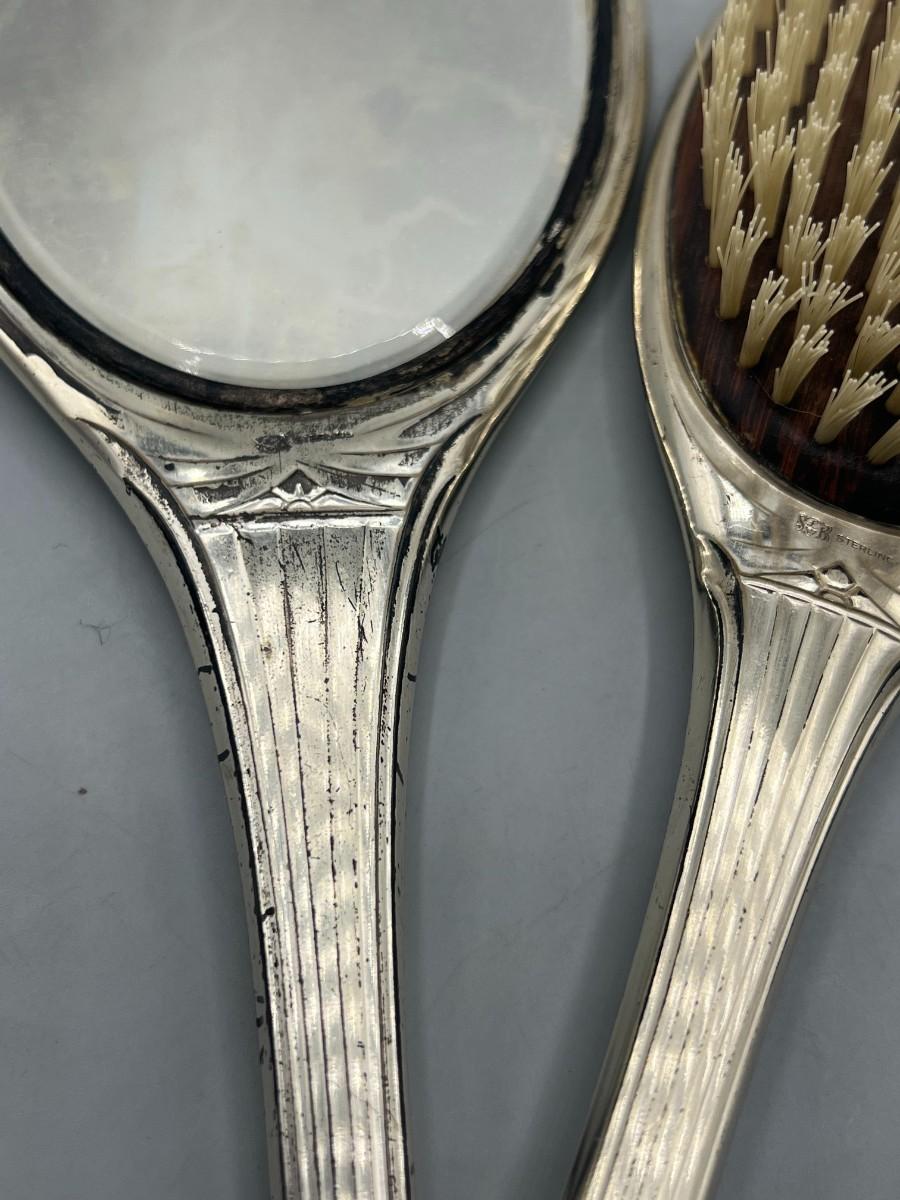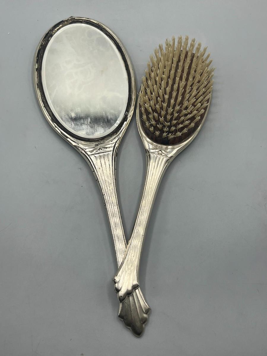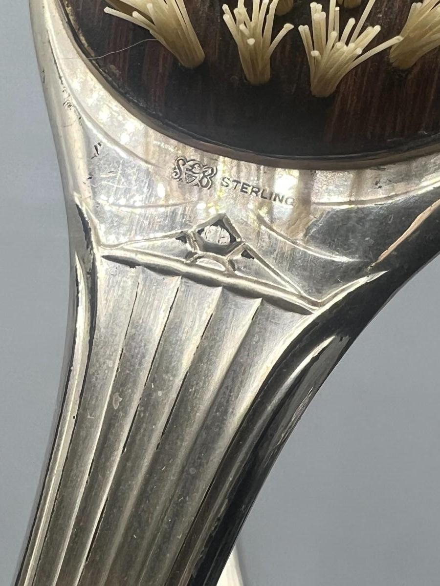Vintage SLB Sterling Silver Art Deco Mid Century Makeup Hand Mirror & Brush