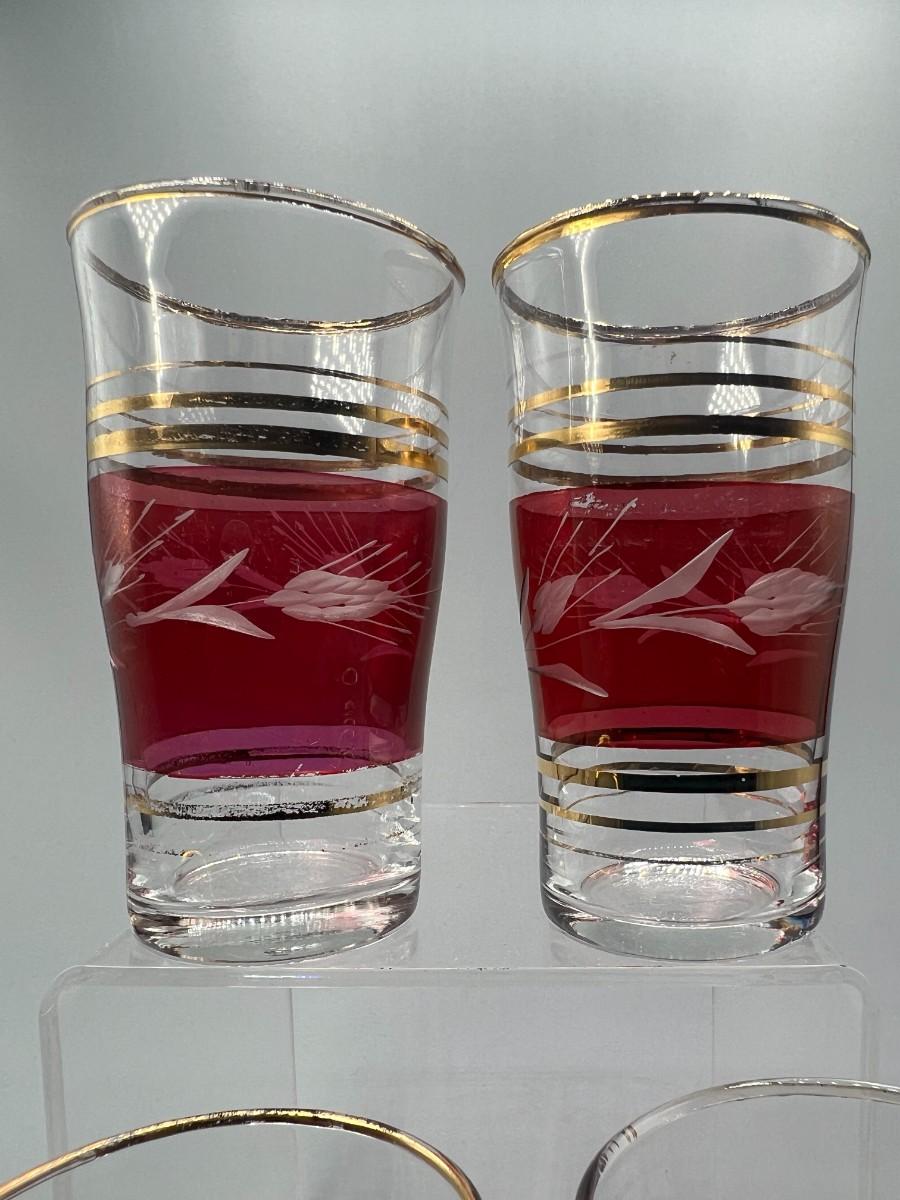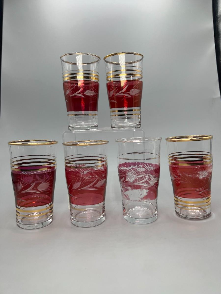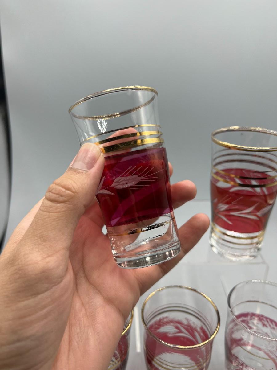 Lot of Vintage Gold Rim Clear Glass Ruby Red Leaf Printed Design Art Deco Small Shot Glasses