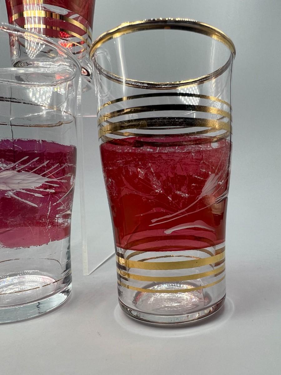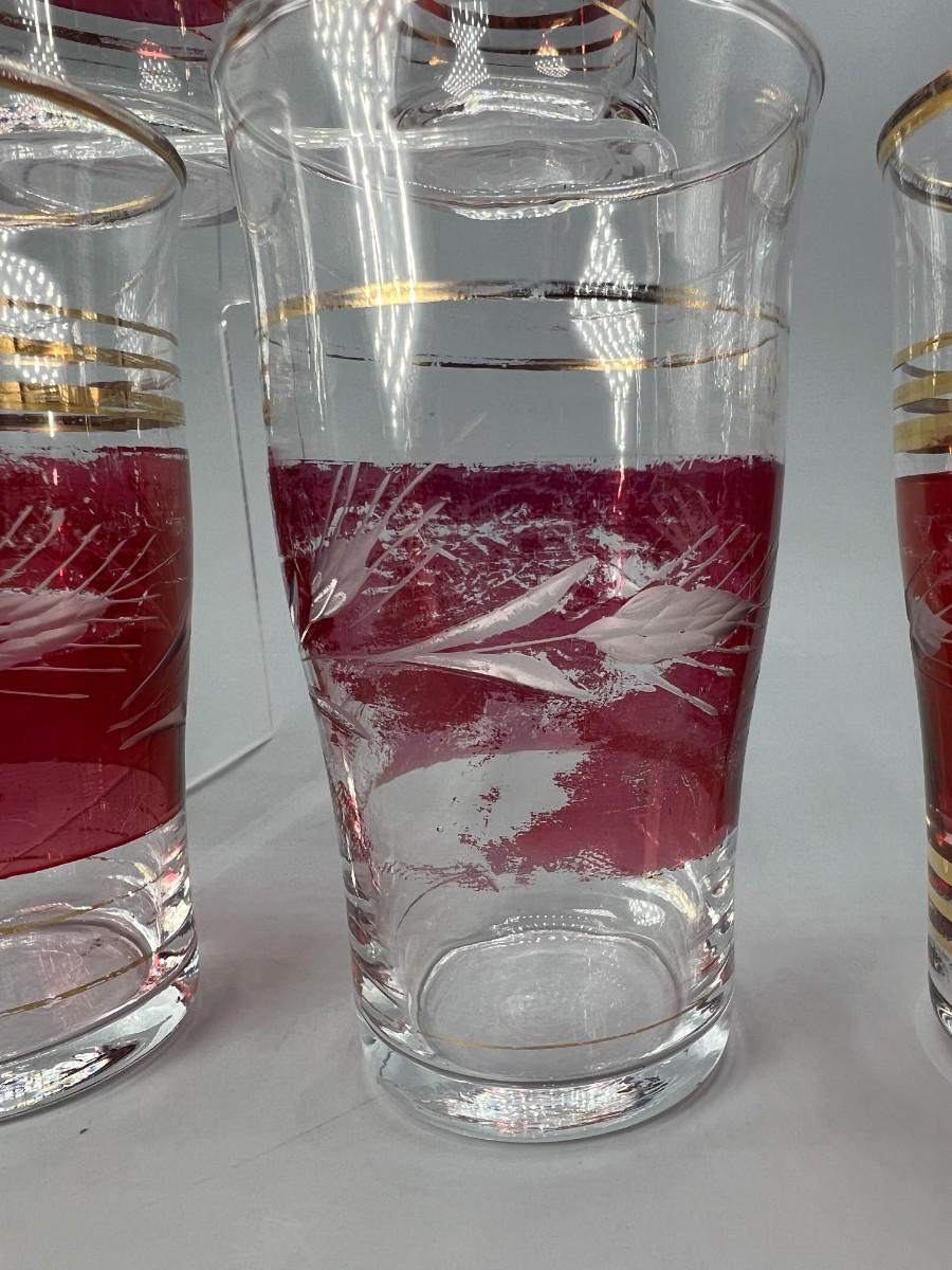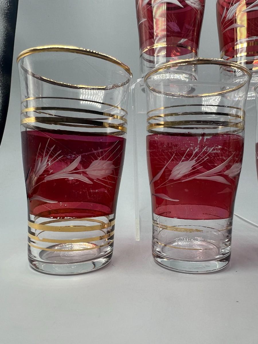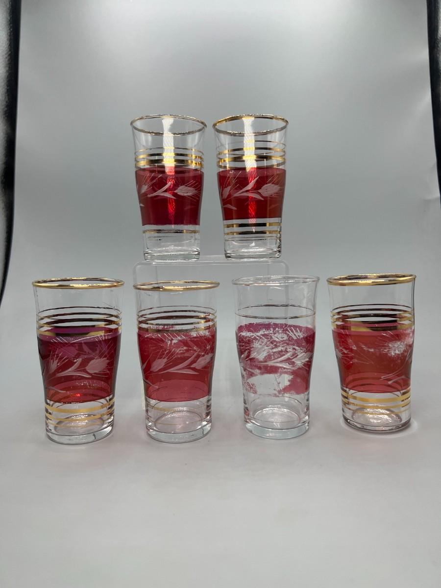 Lot of Vintage Gold Rim Clear Glass Ruby Red Leaf Printed Design Art Deco Small Shot Glasses