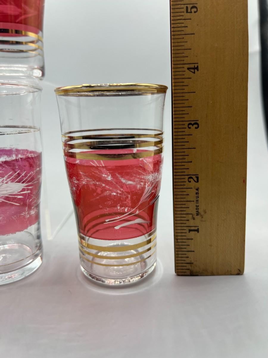 There is noticeable wear to the red designs on some of the glasses in the lot, but there is no significant cracks or chips and is in overall good collectible or useable condition. Check pictures for more details and for sizing.