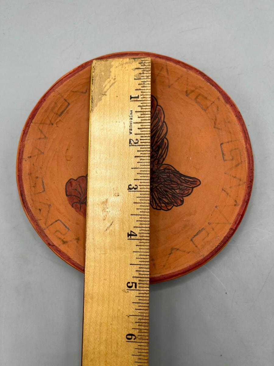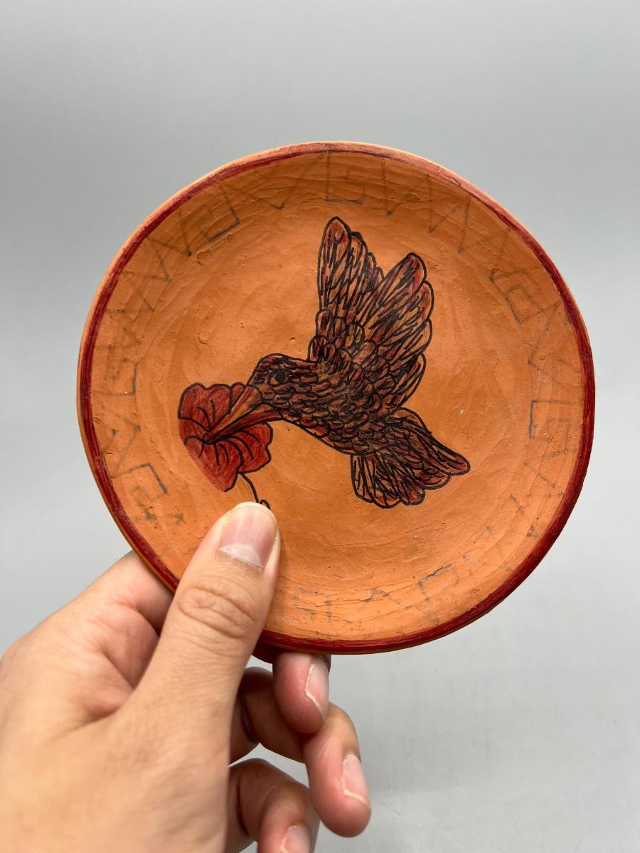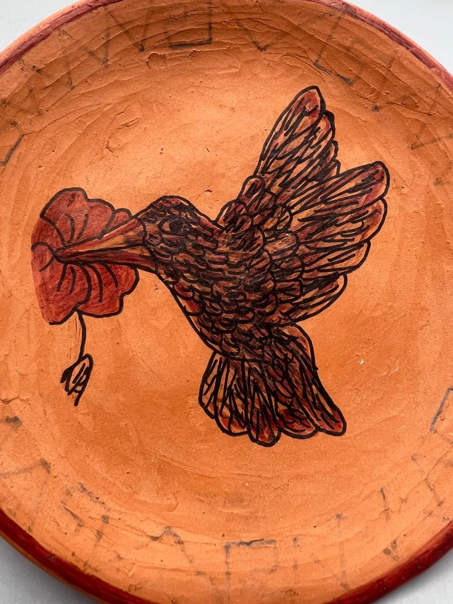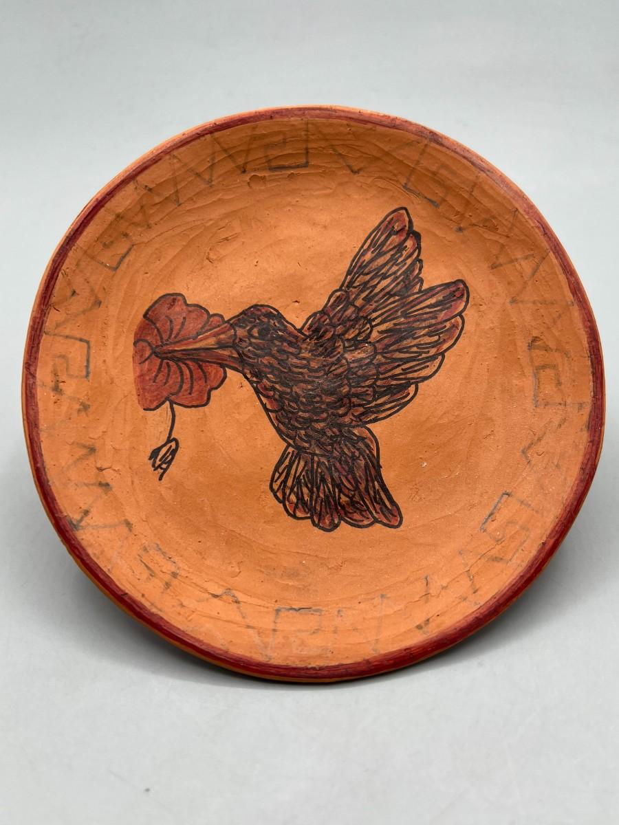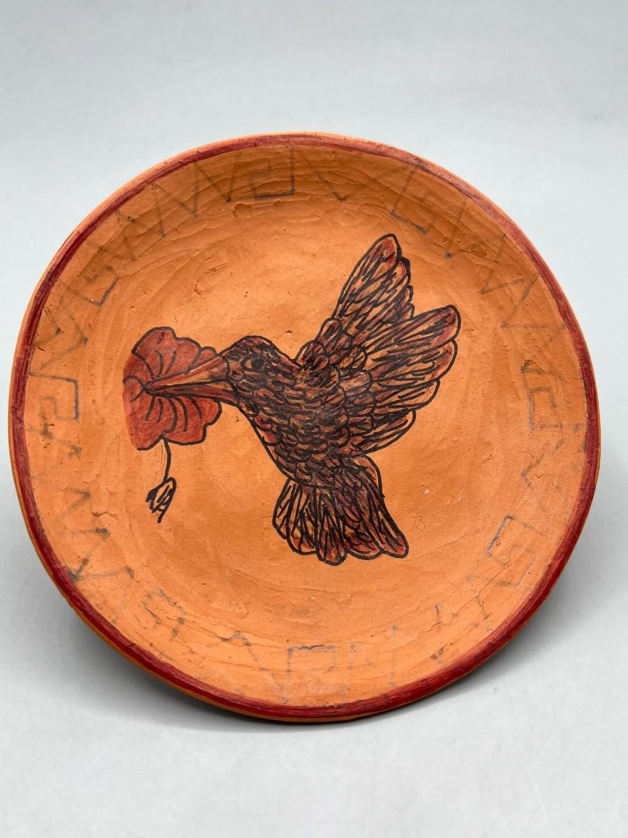 Small Vintage Terracotta Pottery Folk Art Tribal Design Hummingbird with Hibiscus Hanging Plate