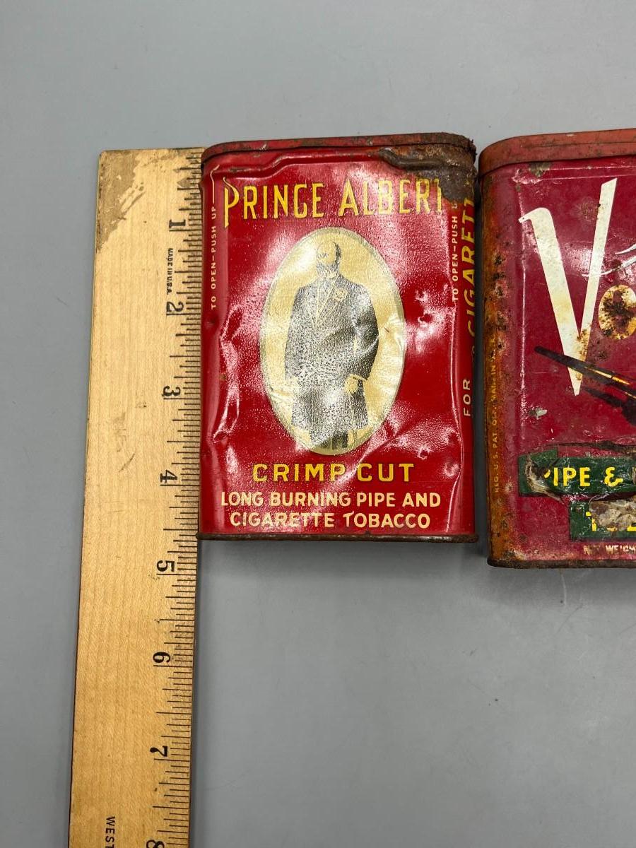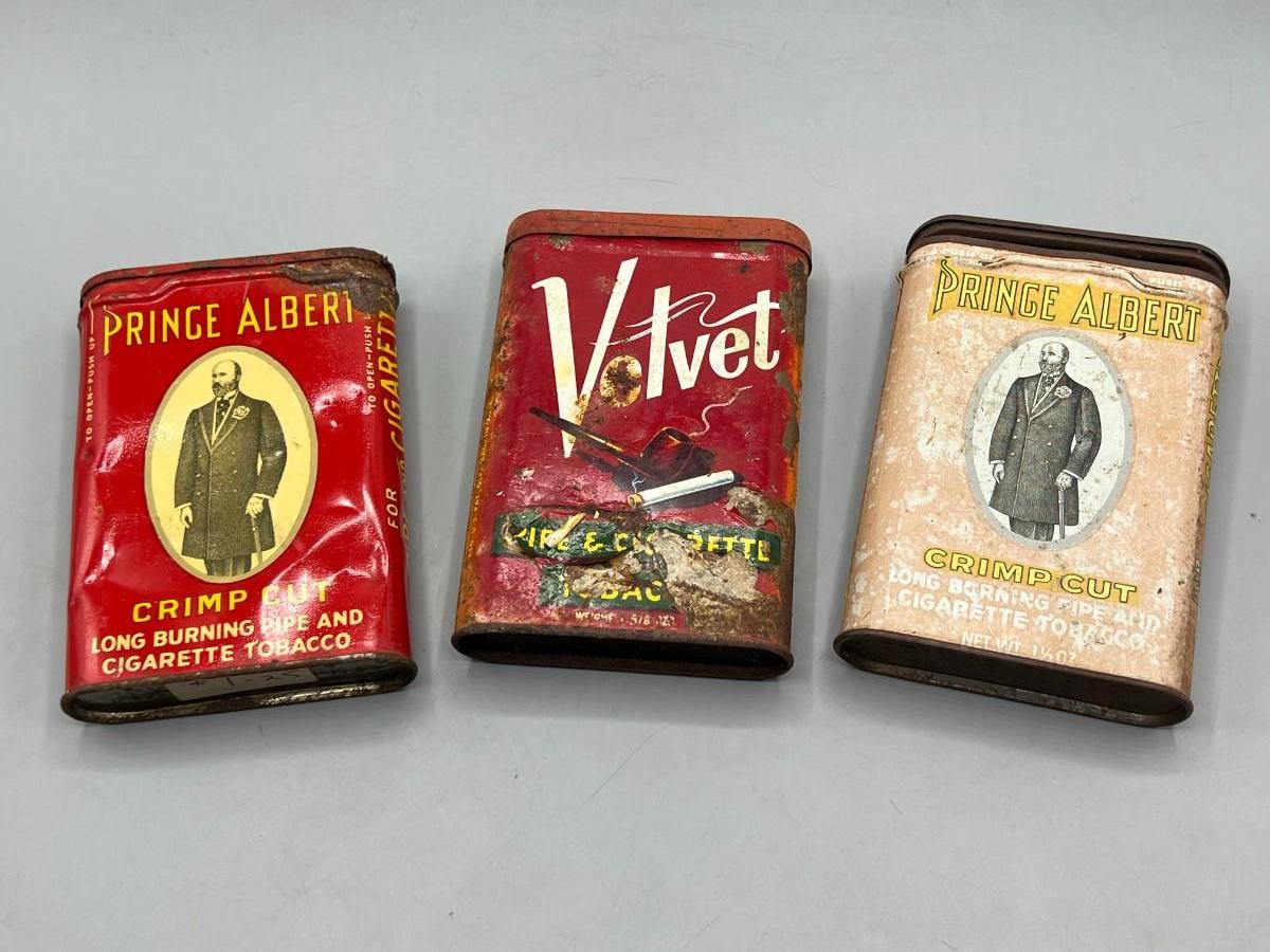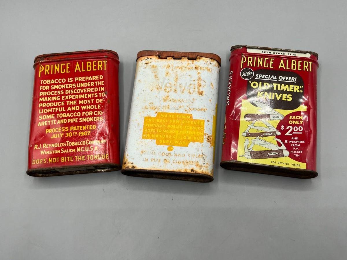 Vintage Lot of Metal Cigarette Tins Prince Albert Crimp Cut Tobacco & Velvet Tobacco