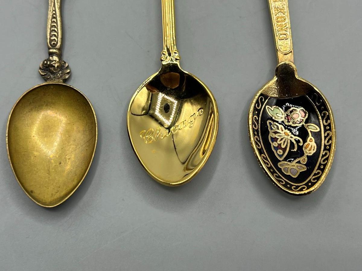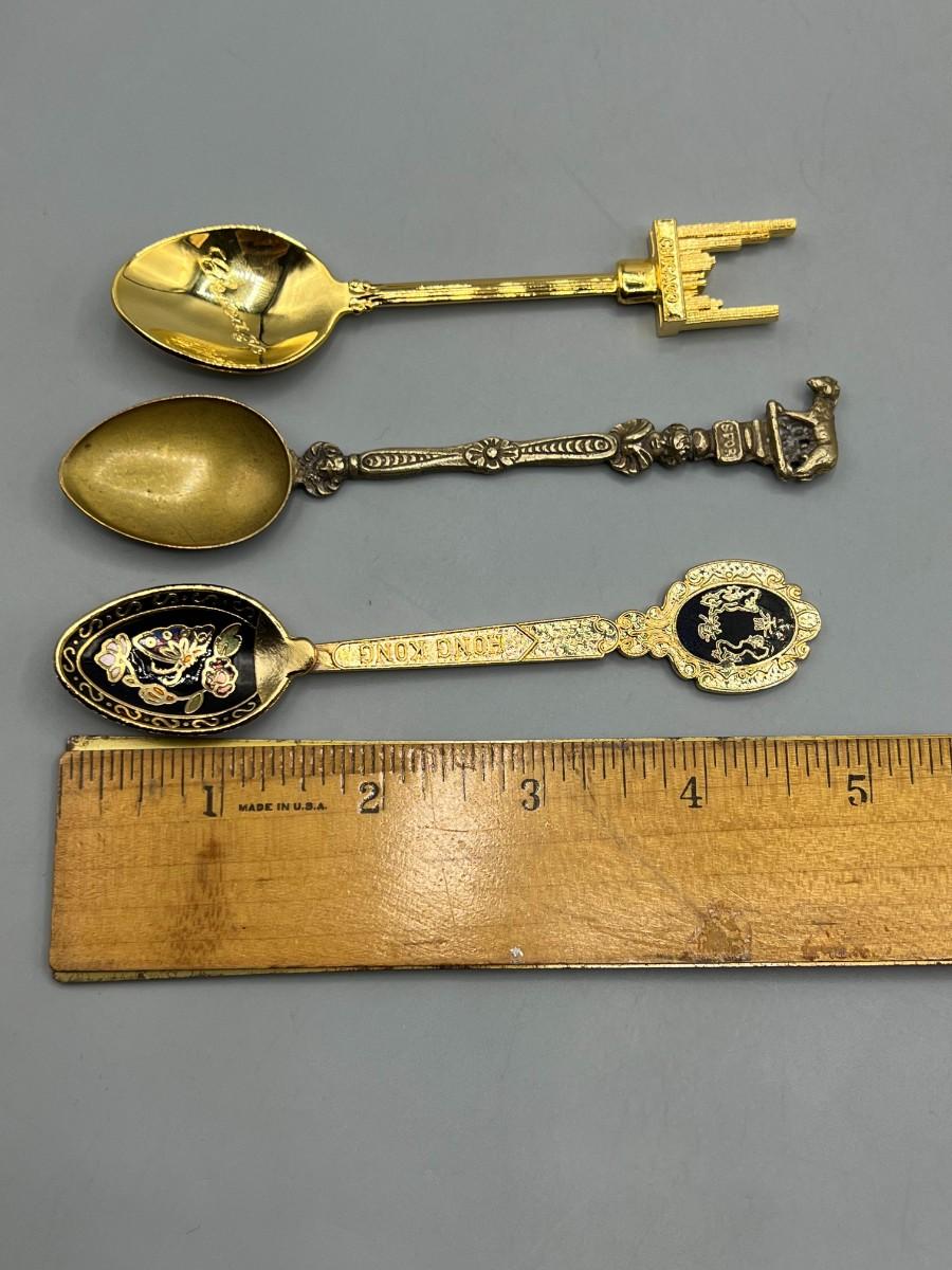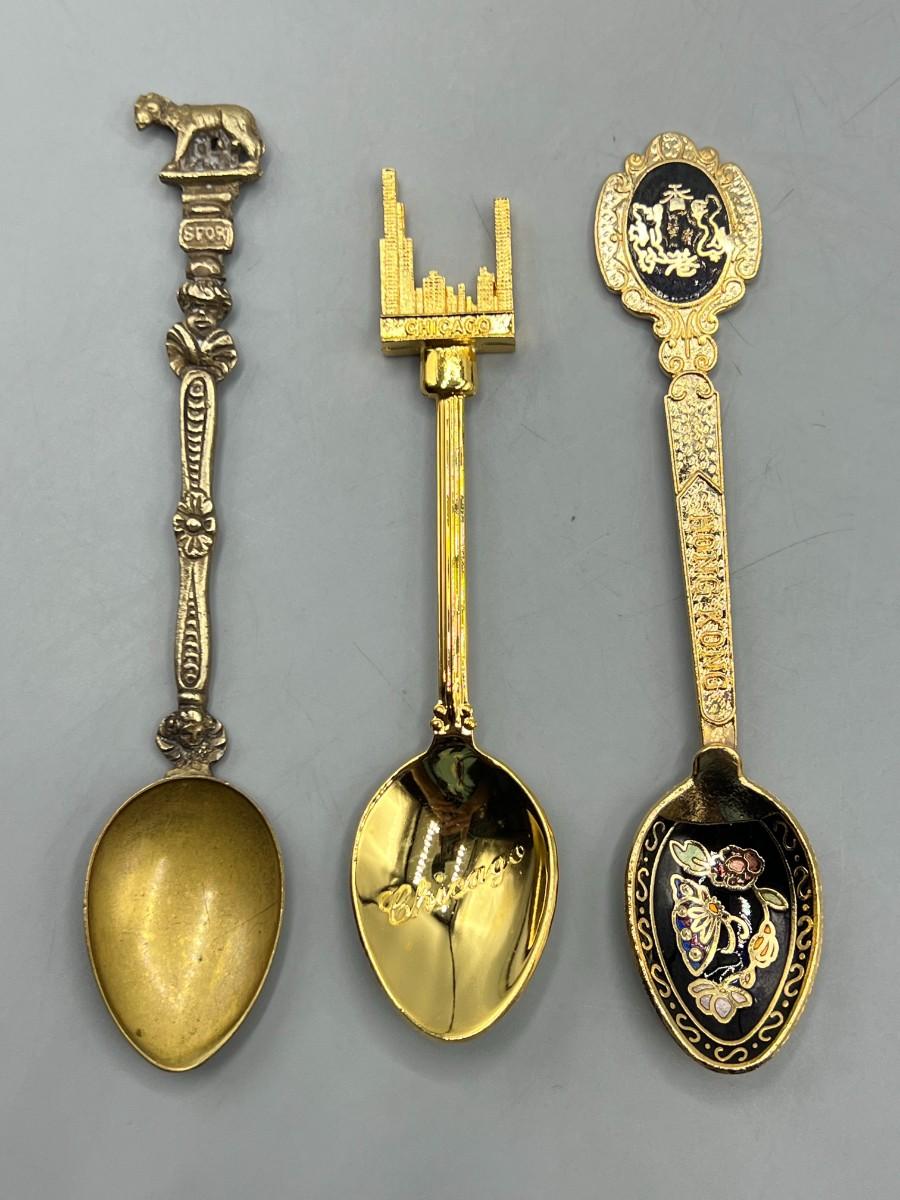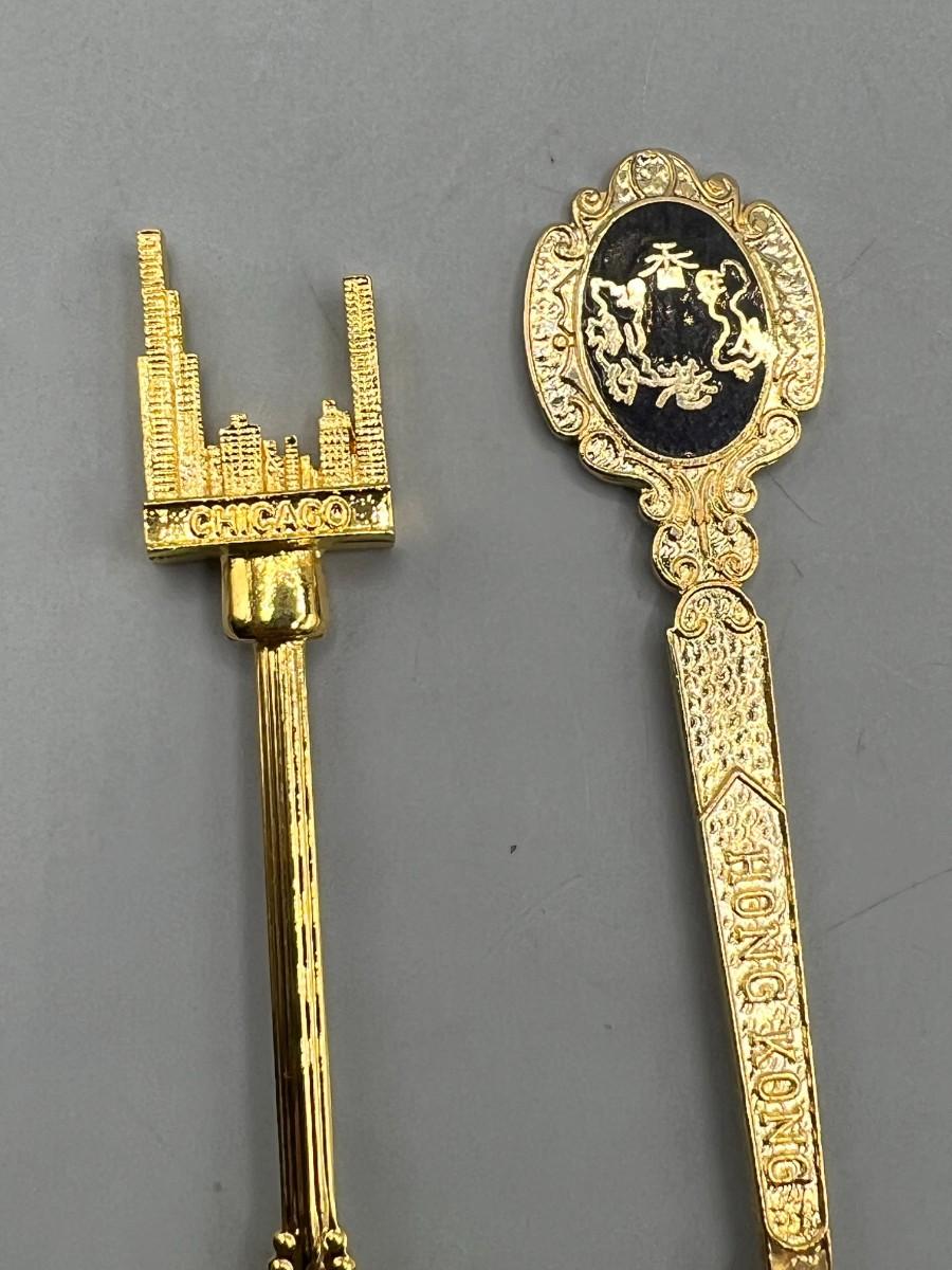Lot of Vintage Retro Collector Souvenir Spoons 22ct Gold Plated Finish Hong Kong, Chicago, & Rome Italy