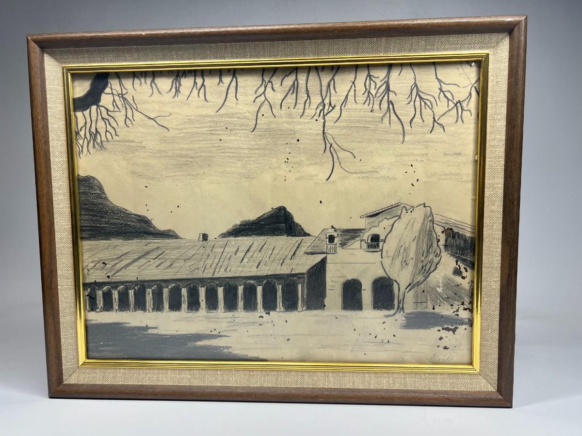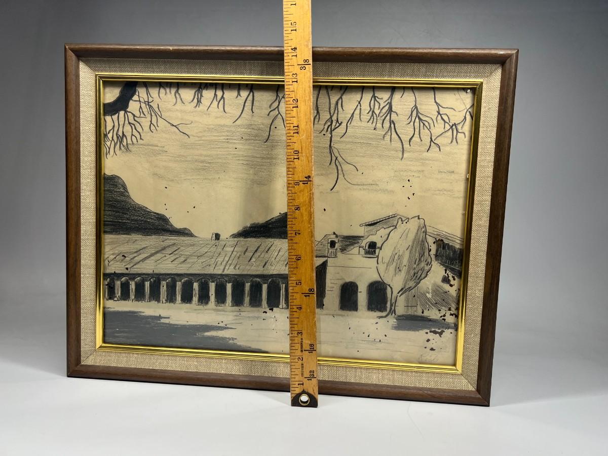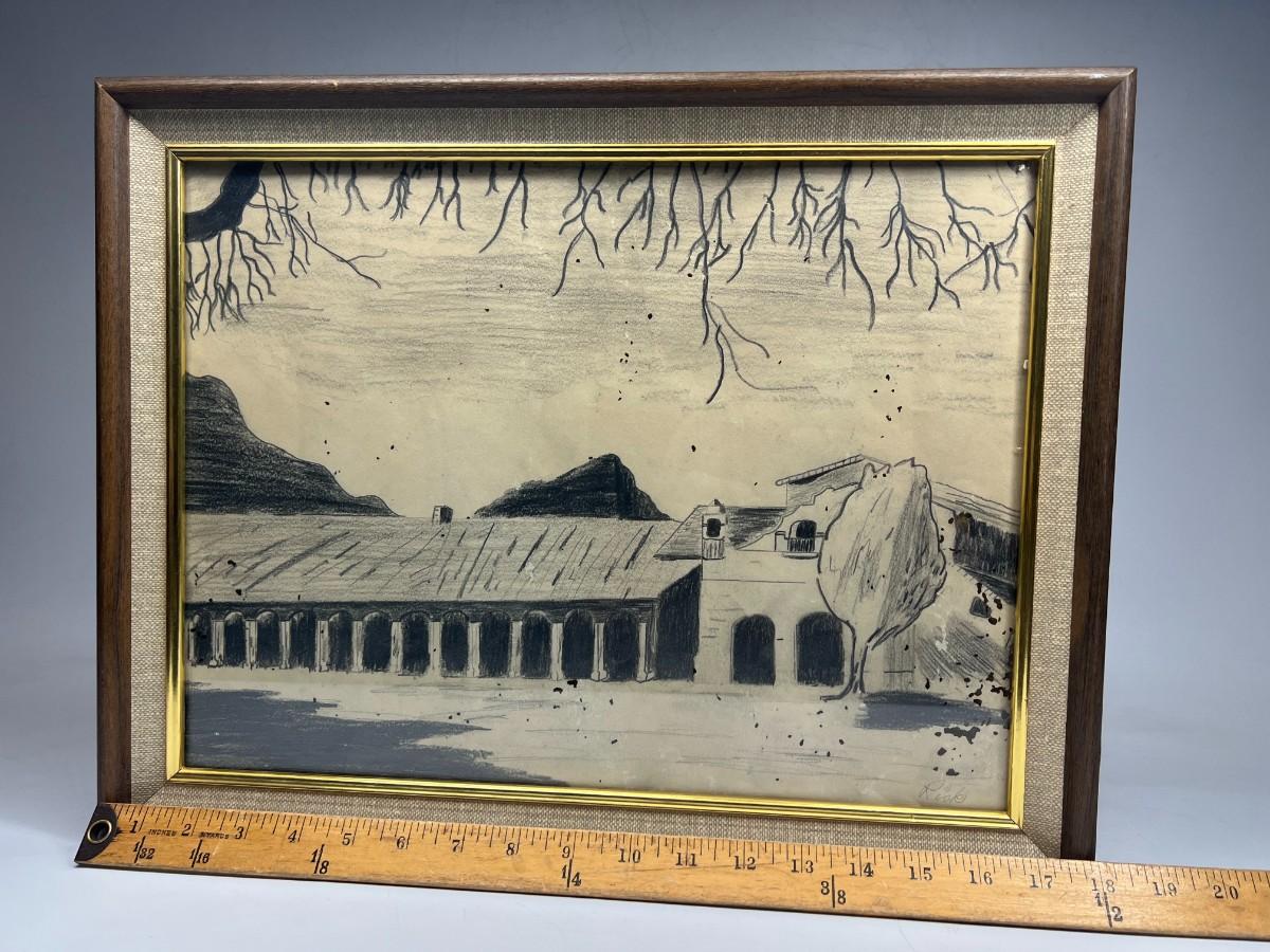 Vintage Amateur Artist Pencil California Mission Building Sketch Drawing Framed Art