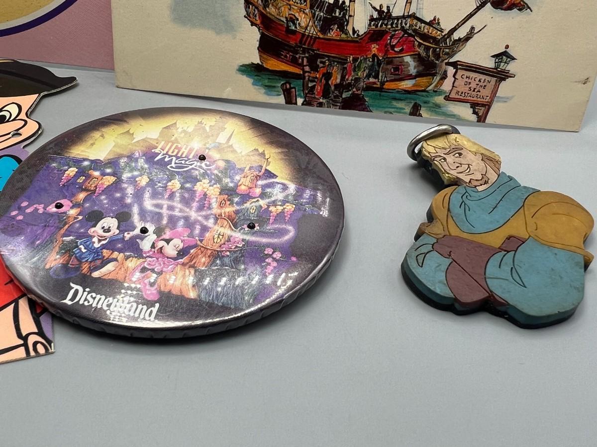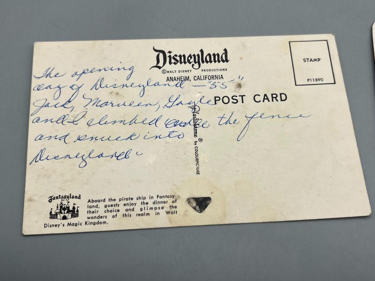 Rare Vintage Opening Day Disneyland Postcard 1955 with fence jumper statement plus other Disney items button ticket keychain