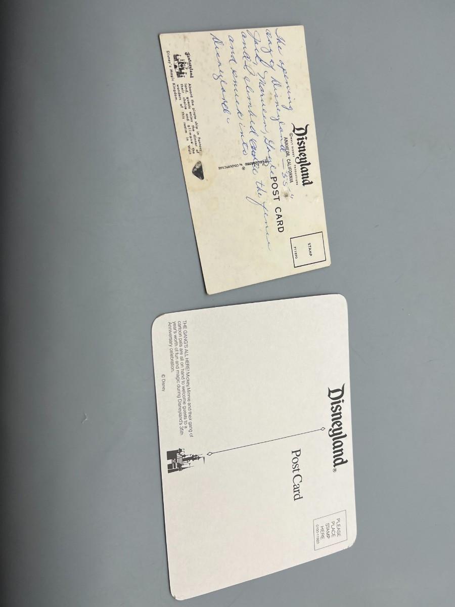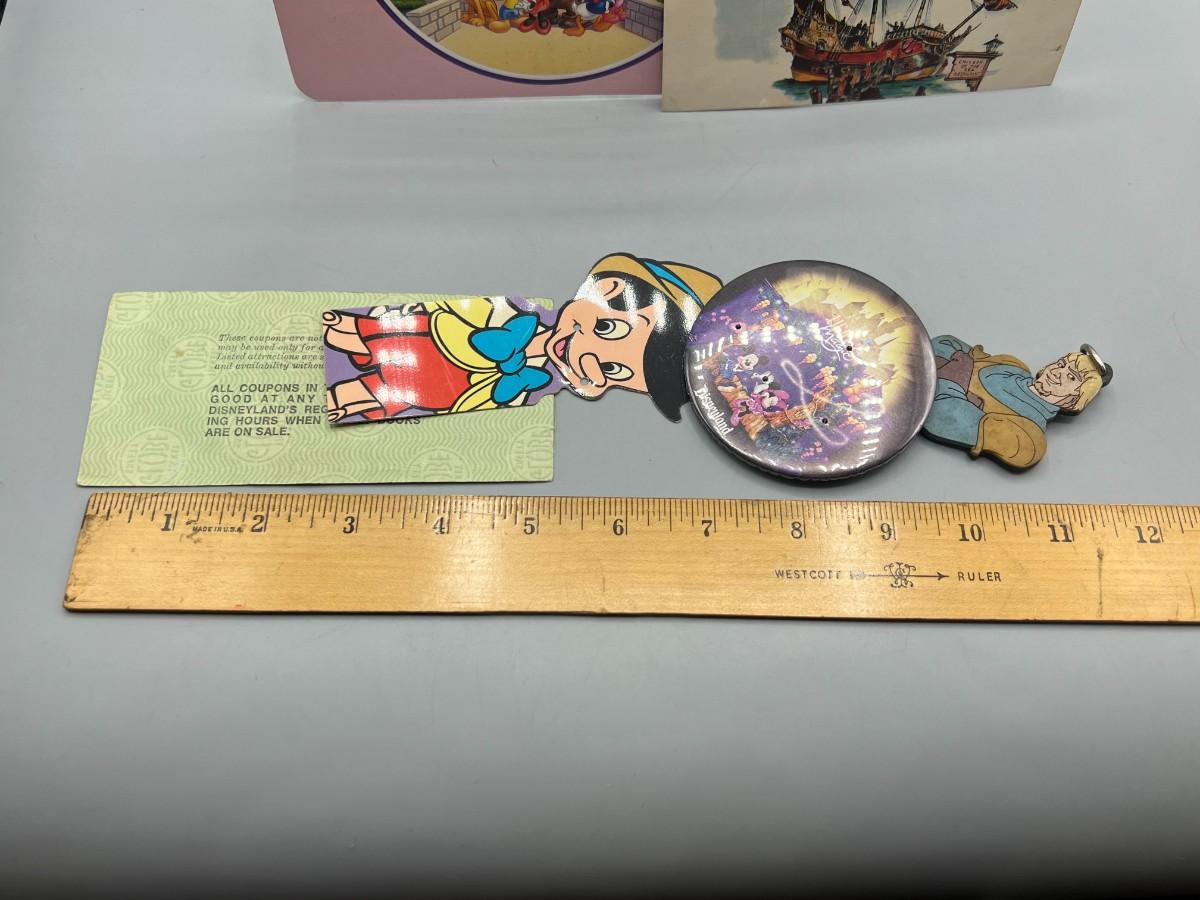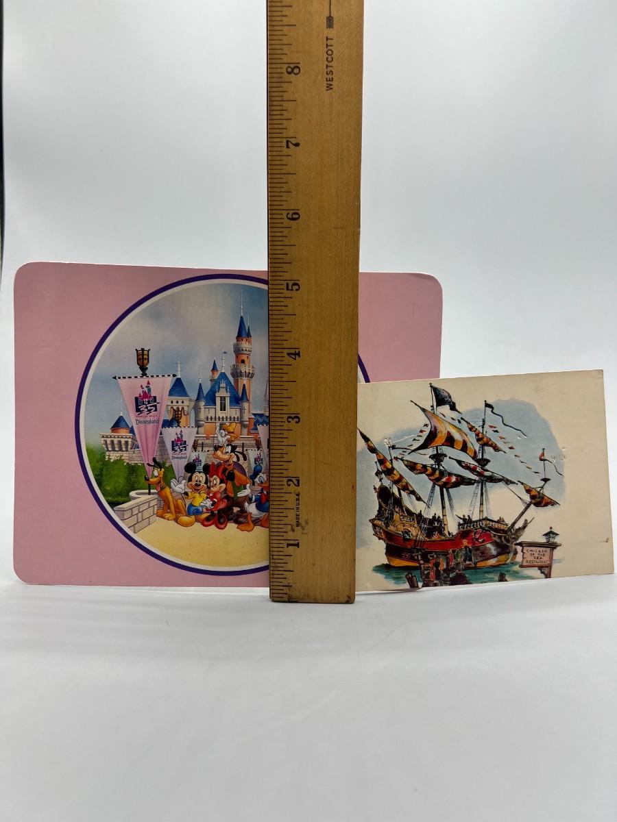 There is some of yellowing from age, but no significant damage. The Chicken of the Sea postcard has been written on and is from Disneyland's opening day according to the note on it naming 3 people who snuck into the park. The light up pin does not work, check pictures for more details and for sizing.