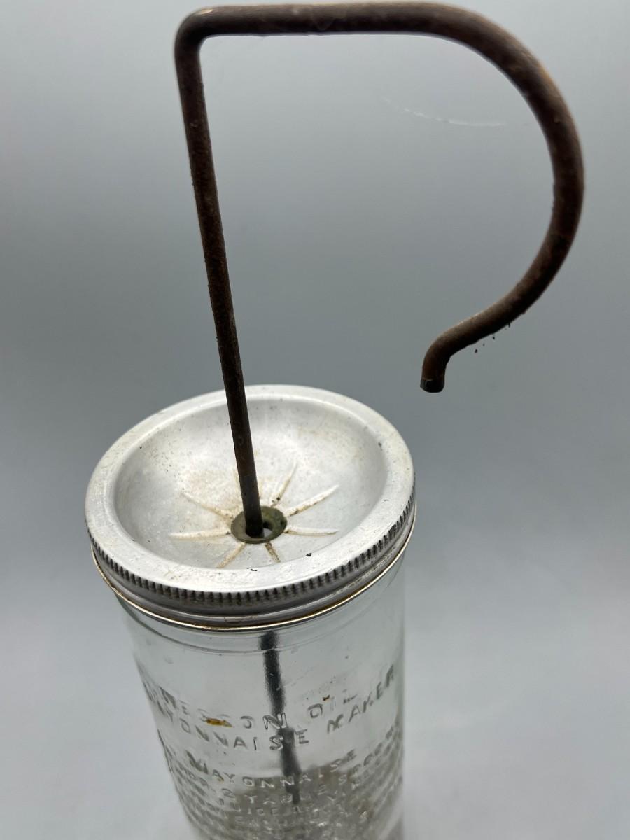 The embossed writing on the jar is a mayonnaise recipe, there is no significant cracks or chips to the glass and is in overall good collectible or useable condition. Check pictures for more details and for sizing.