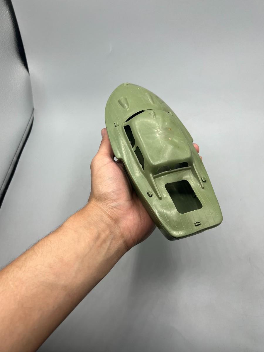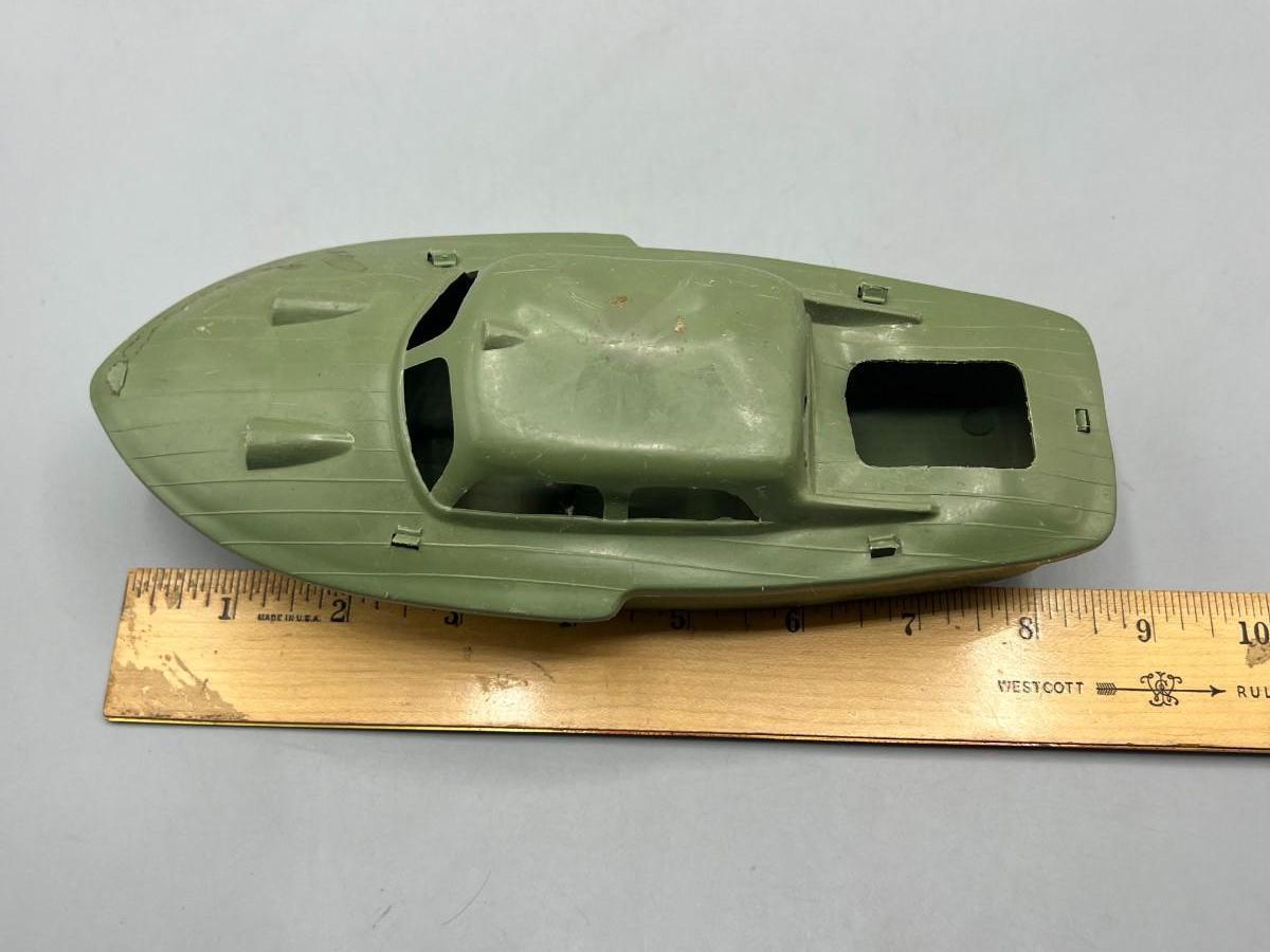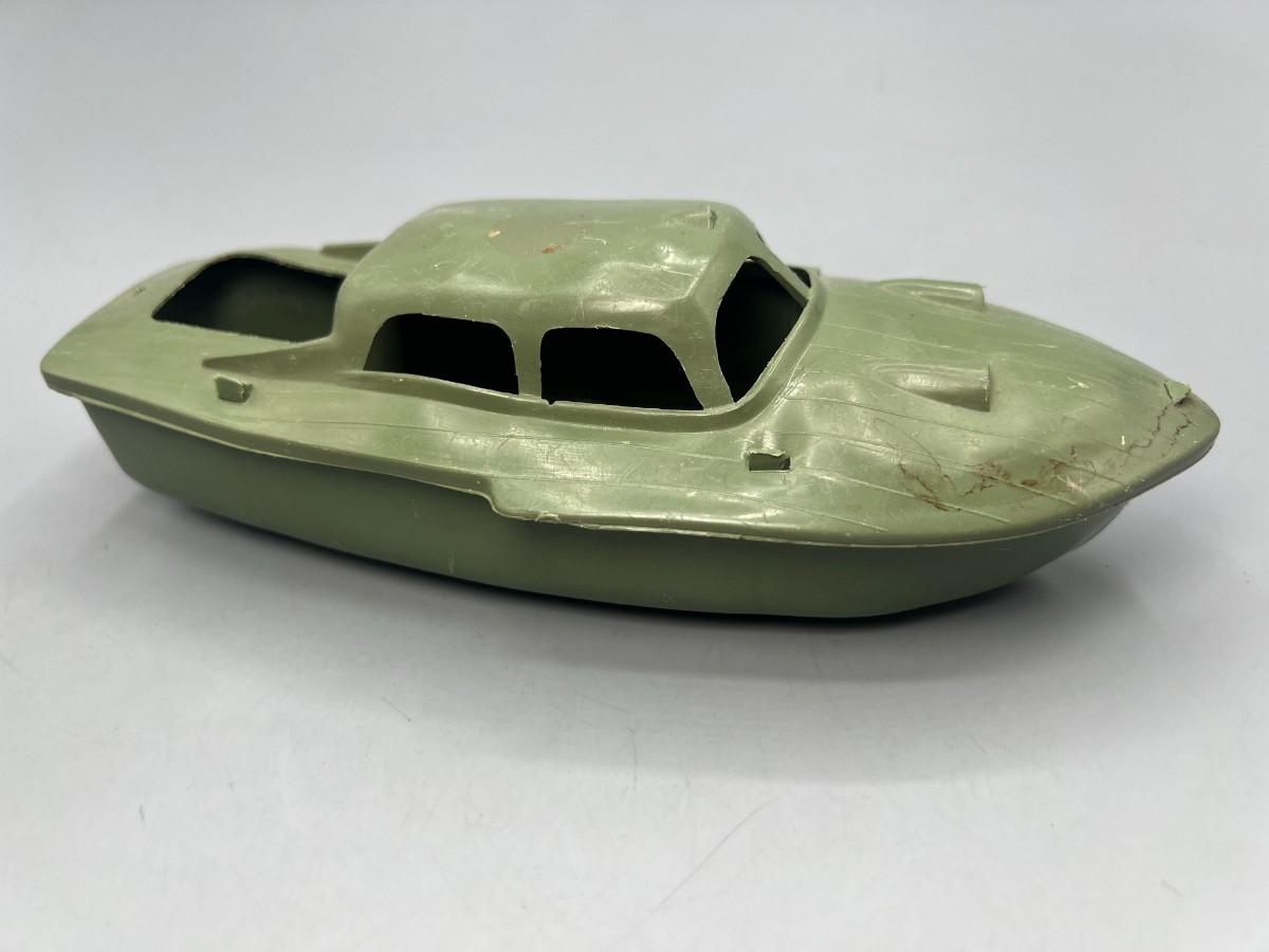 The manufacturer stamp is on the bottom and is illegible. There are signs of wear to the boat, but there is no significant damage.