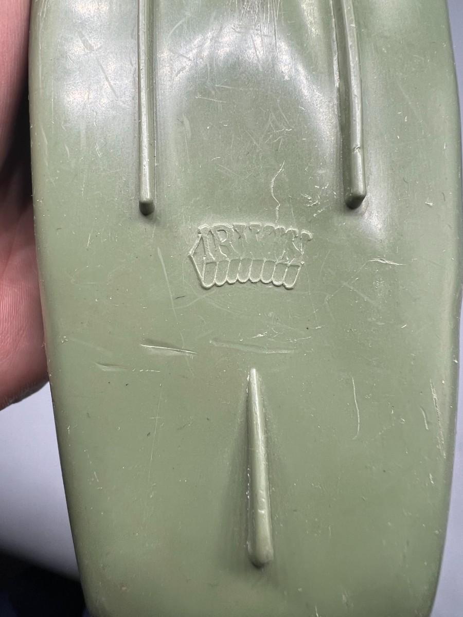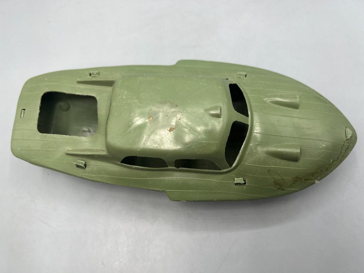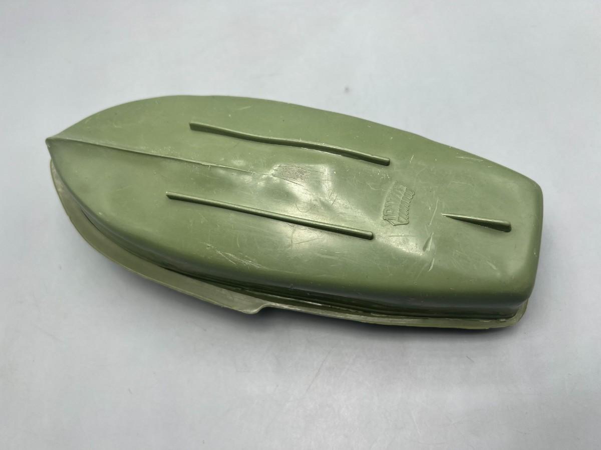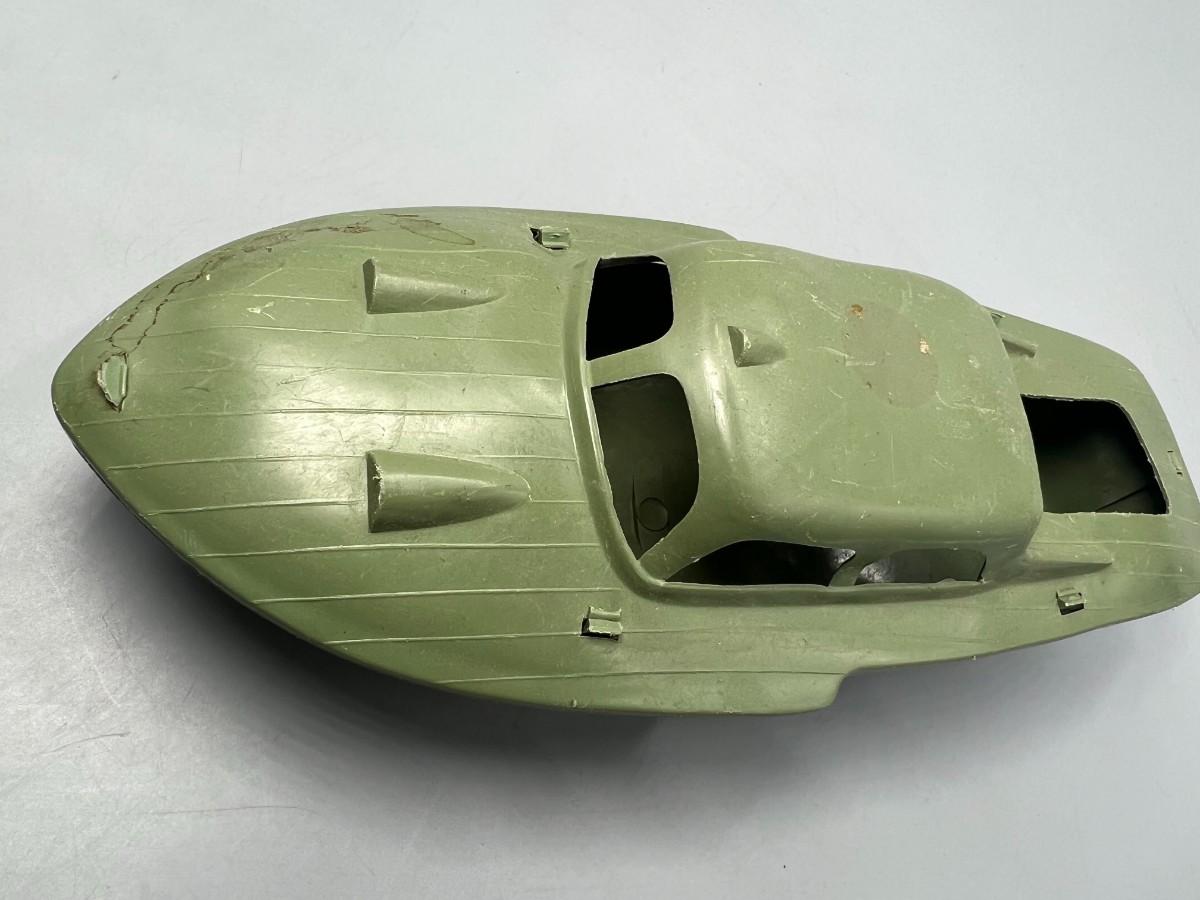 The manufacturer stamp is on the bottom and is illegible. There are signs of wear to the boat, but there is no significant damage.