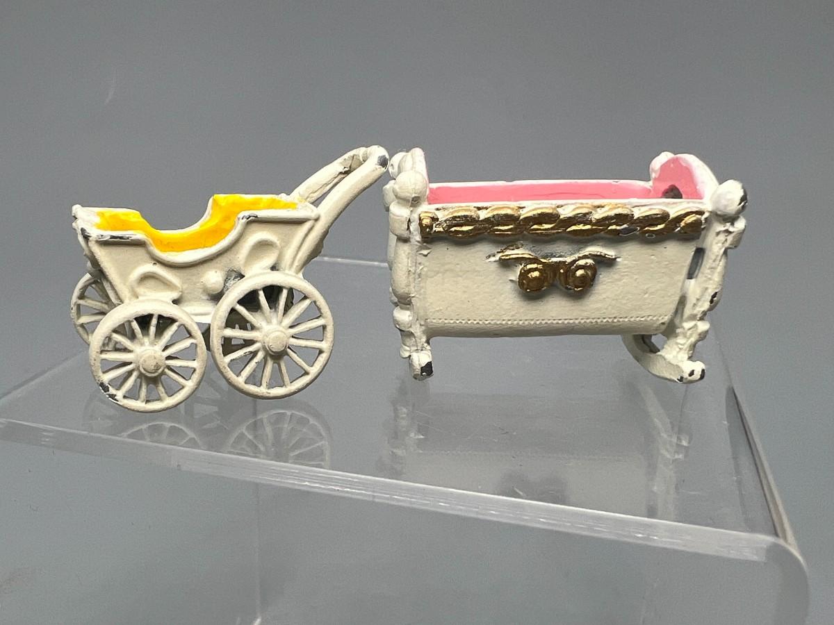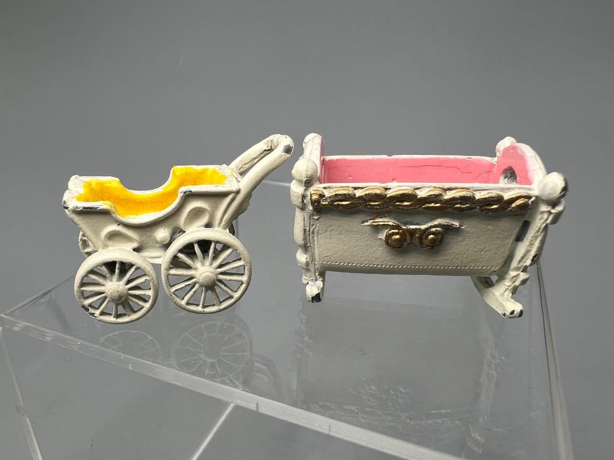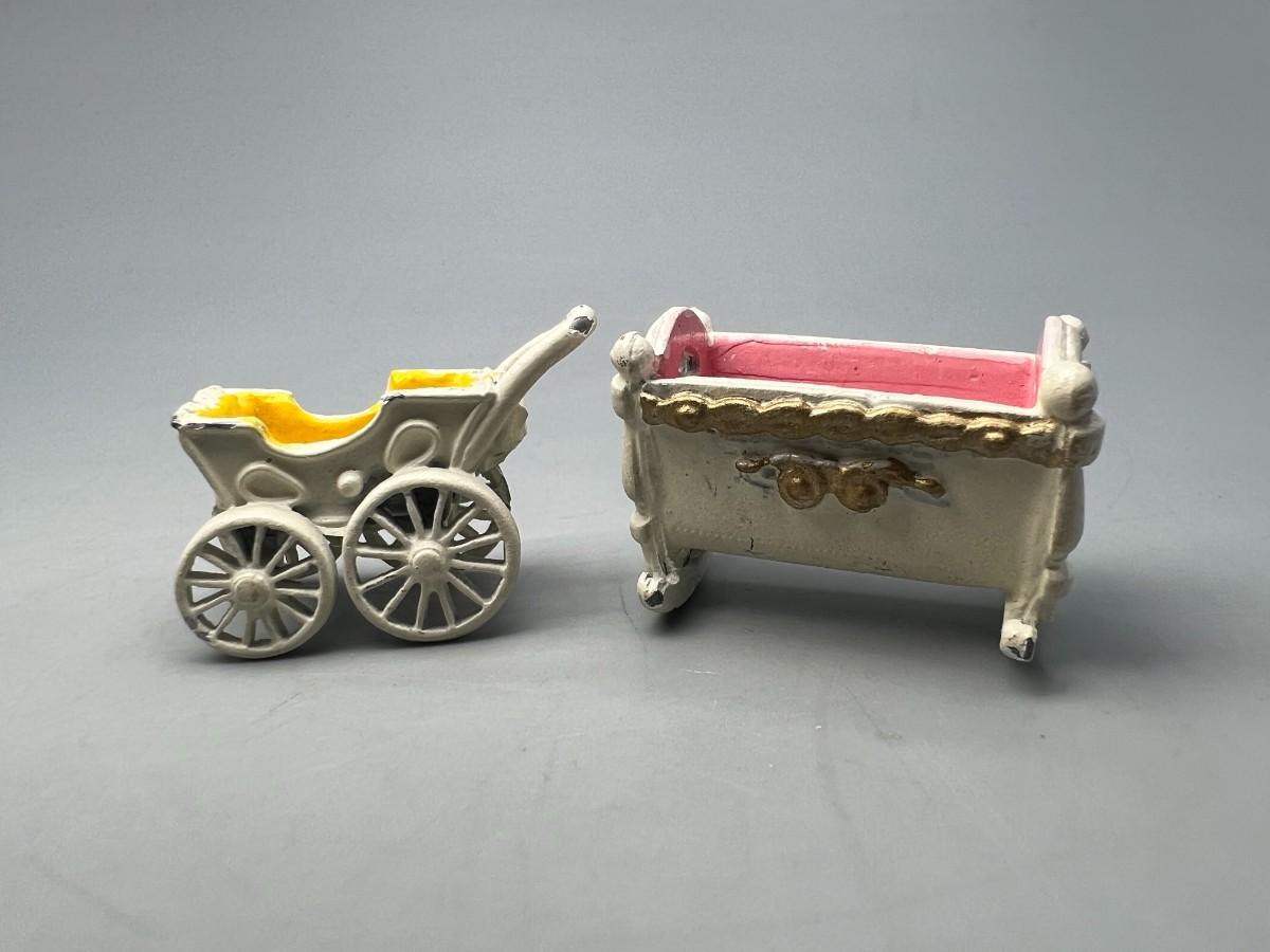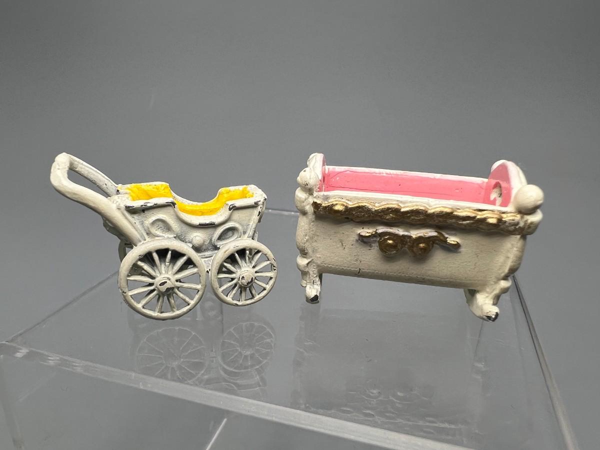 Small Vintage Painted Metal Iron Trinket Figurines Baby Carriage & Crib Rocker Dollhouse furniture