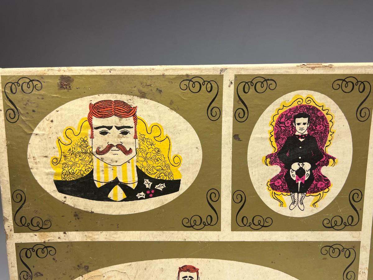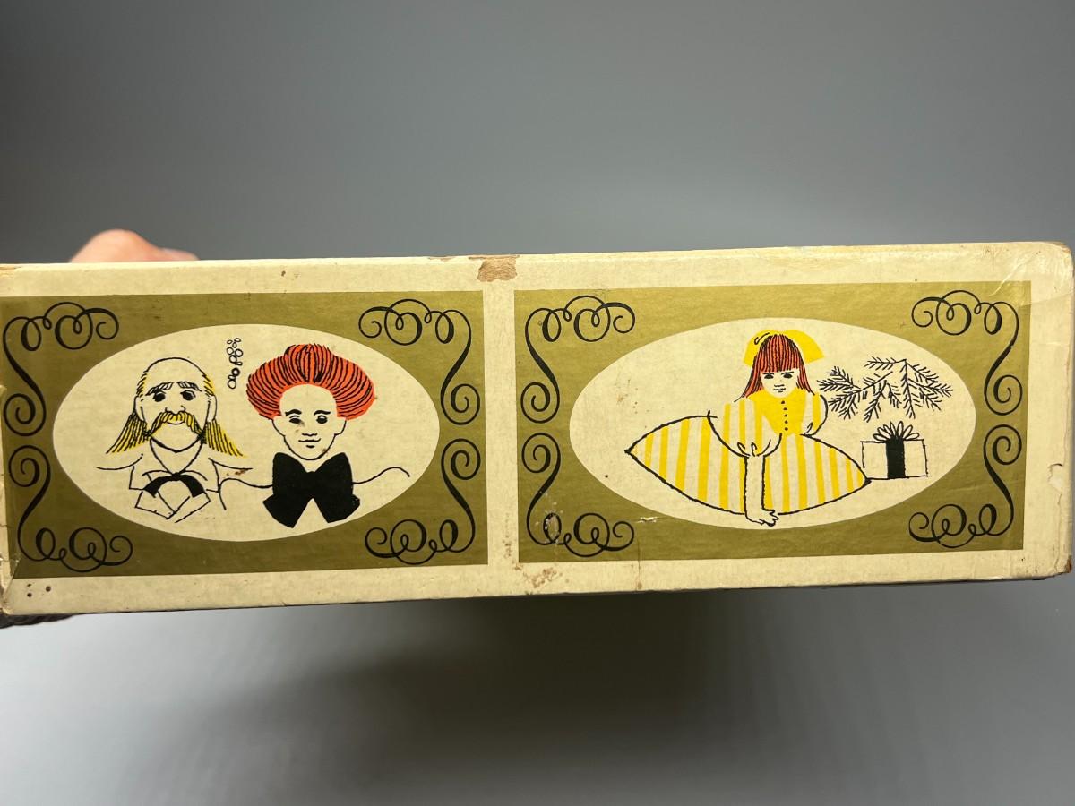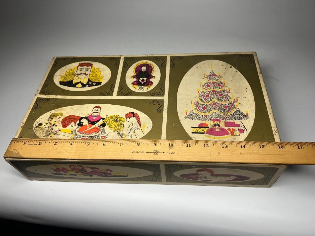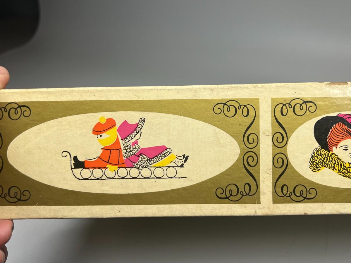 The box has interesting & cute graphics, but there are signs of vintage wear. Check pcitures for more details and for sizing.
