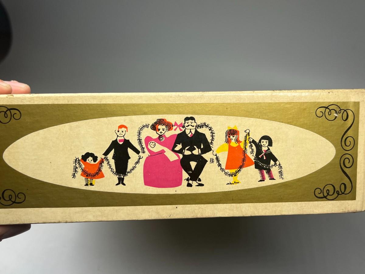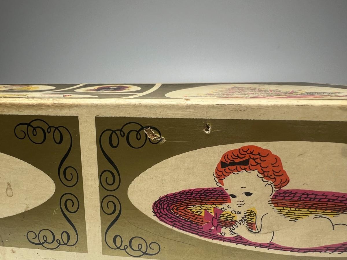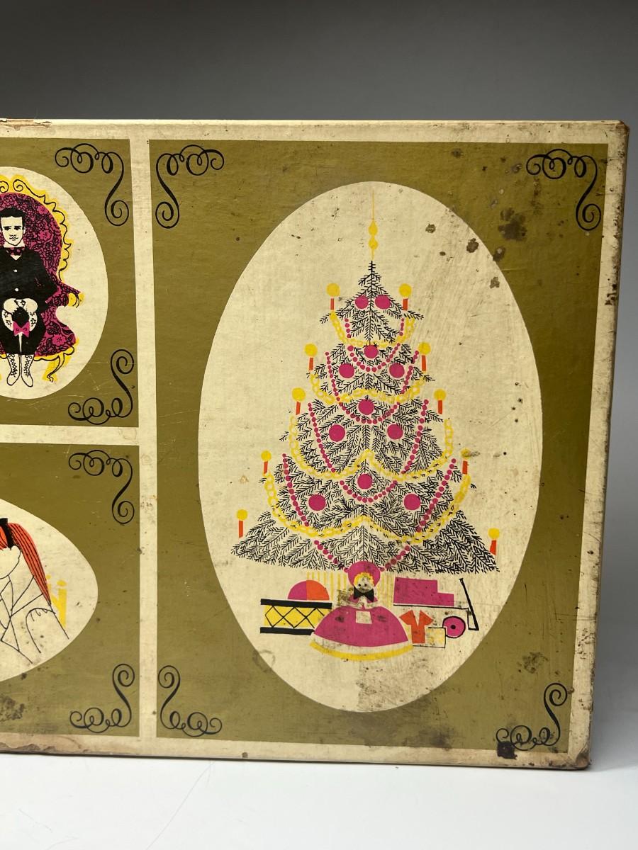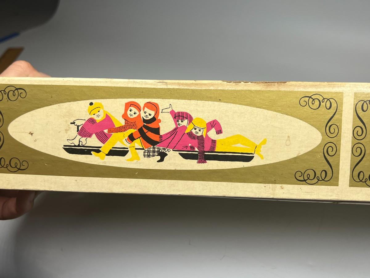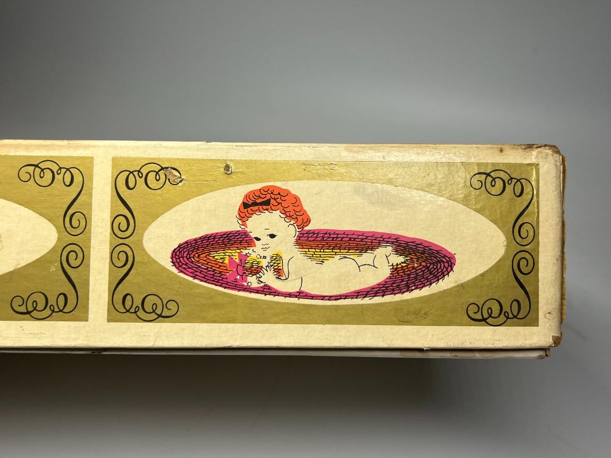 The box has interesting & cute graphics, but there are signs of vintage wear. Check pcitures for more details and for sizing.