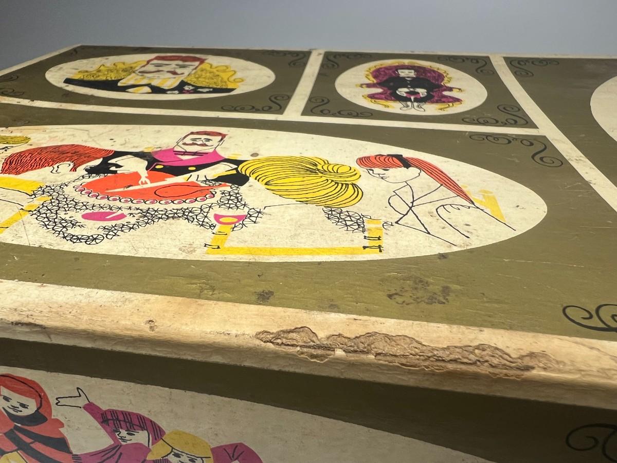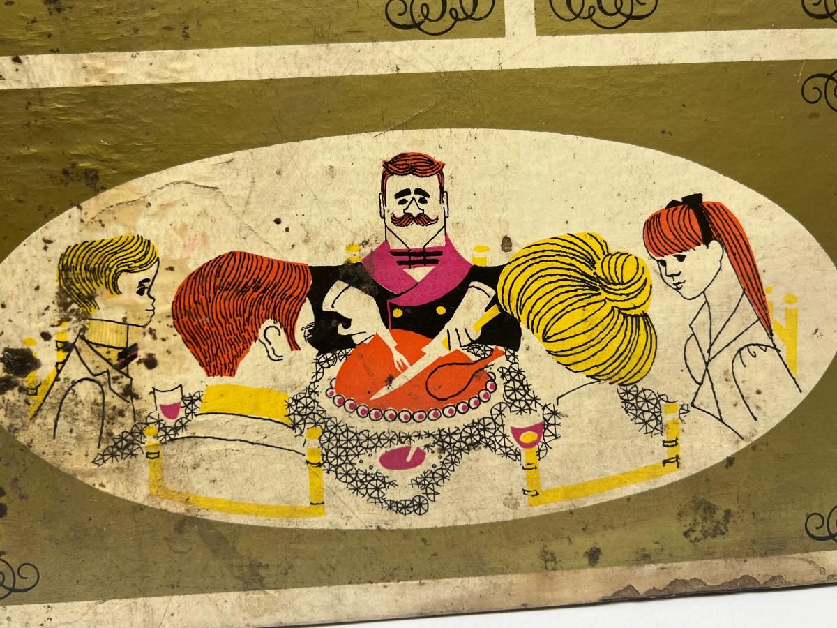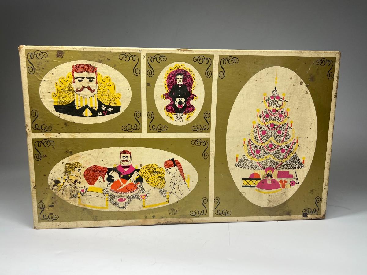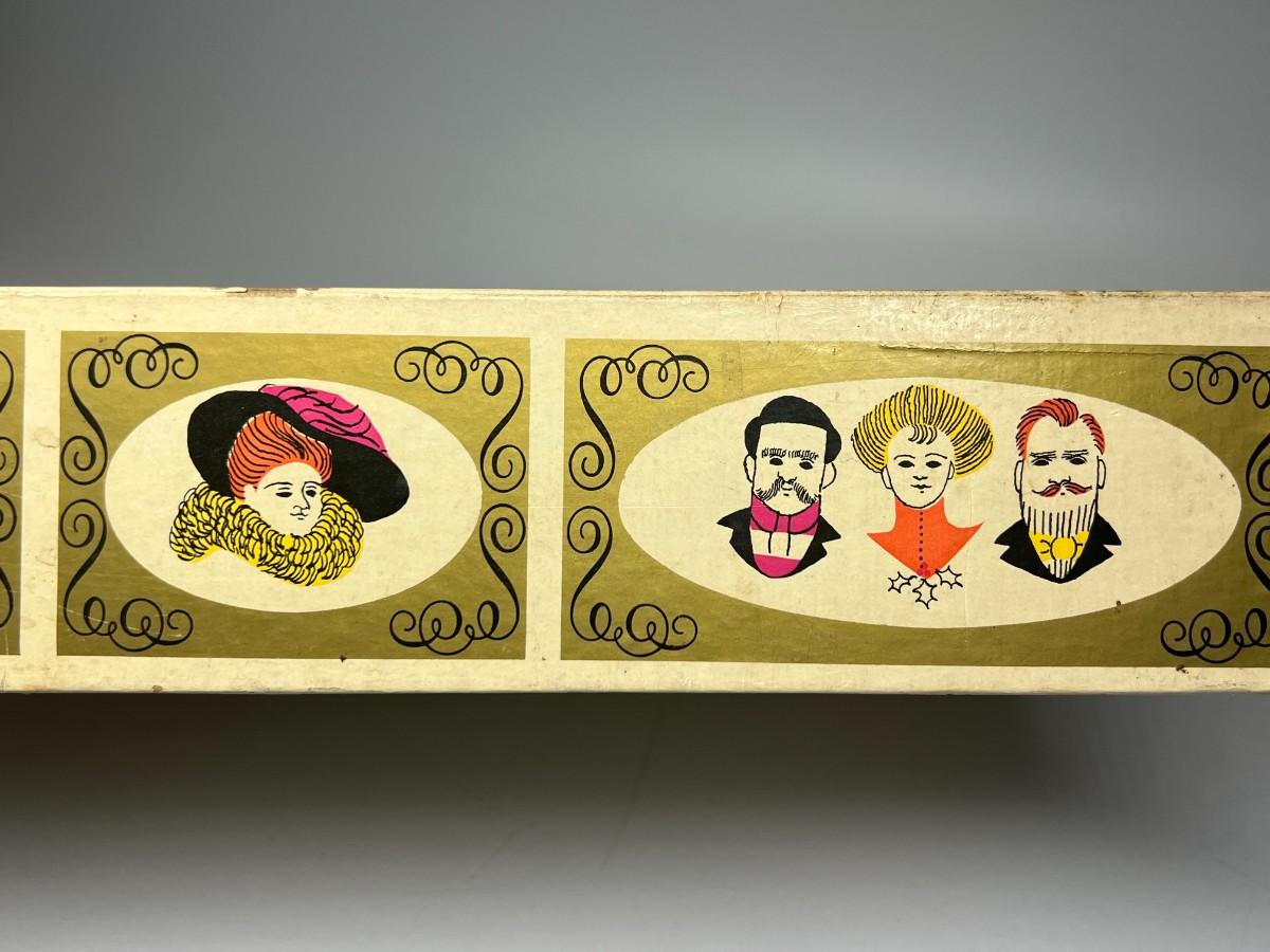 The box has interesting & cute graphics, but there are signs of vintage wear. Check pcitures for more details and for sizing.