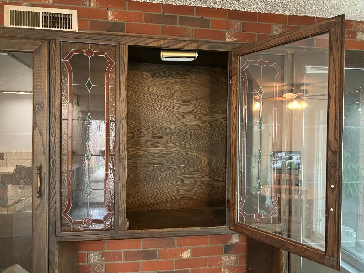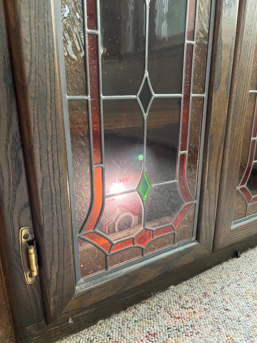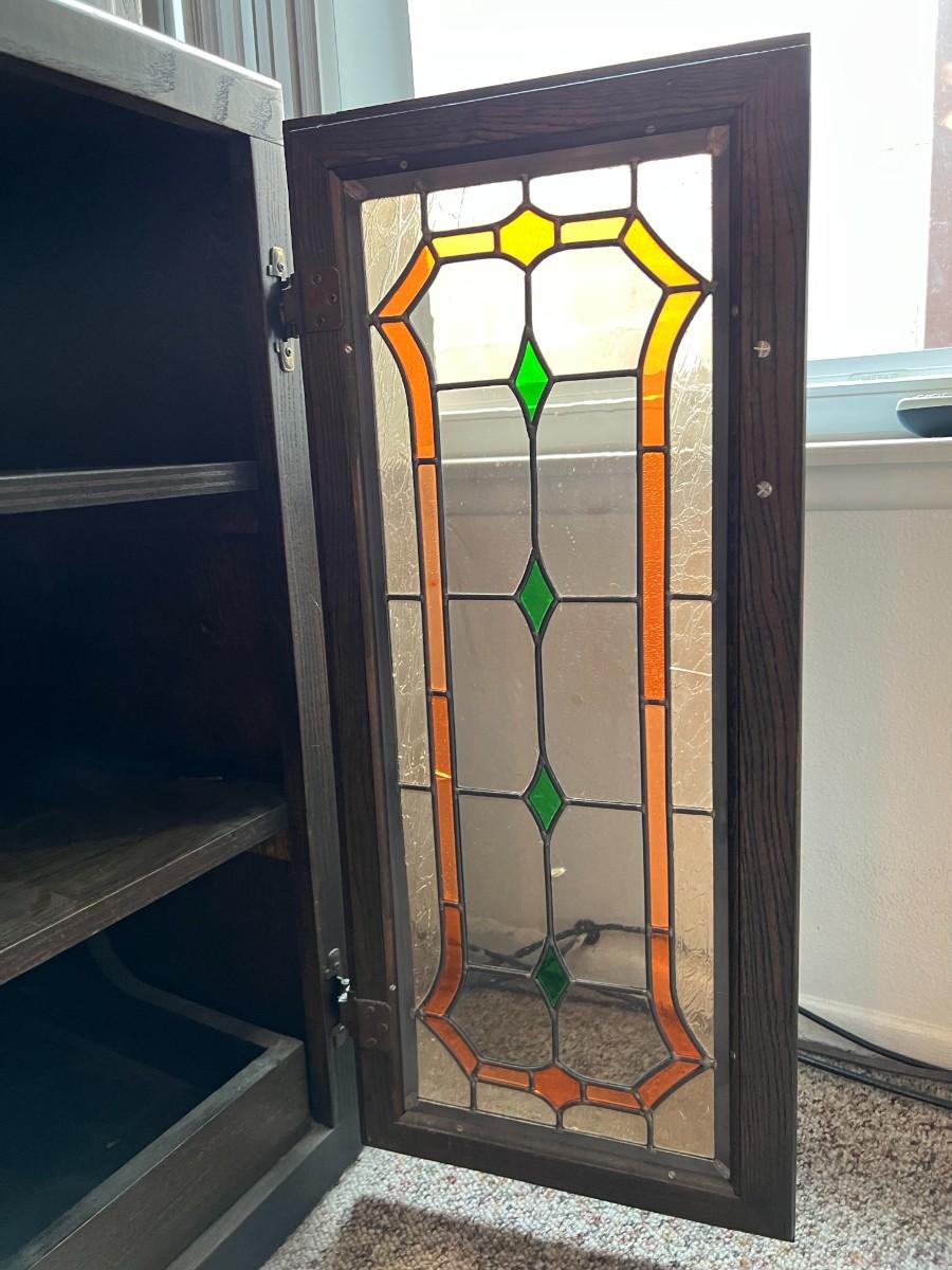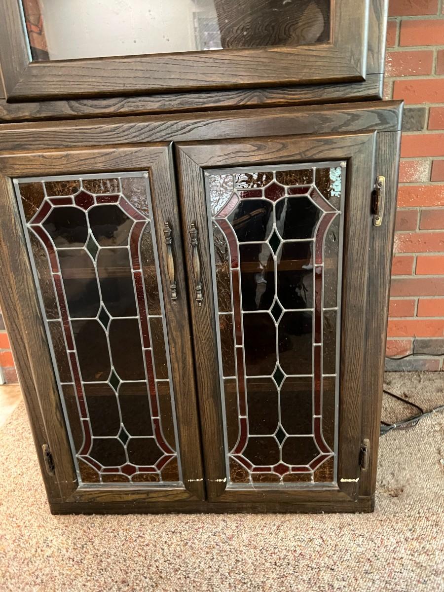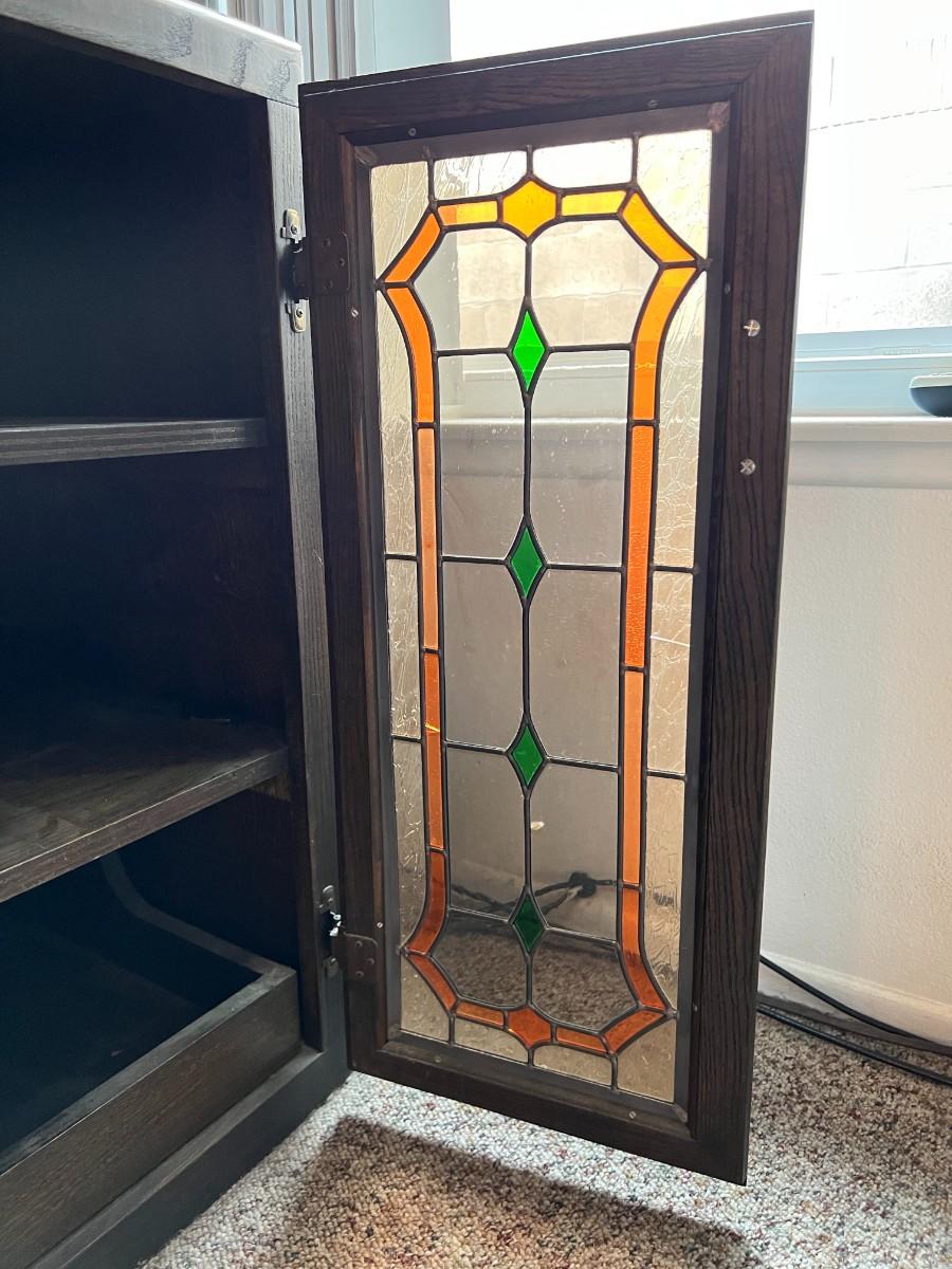 Large Dark Wood Leaded Stained-Glass Door Panels Lit Entertainment Display Cabinet