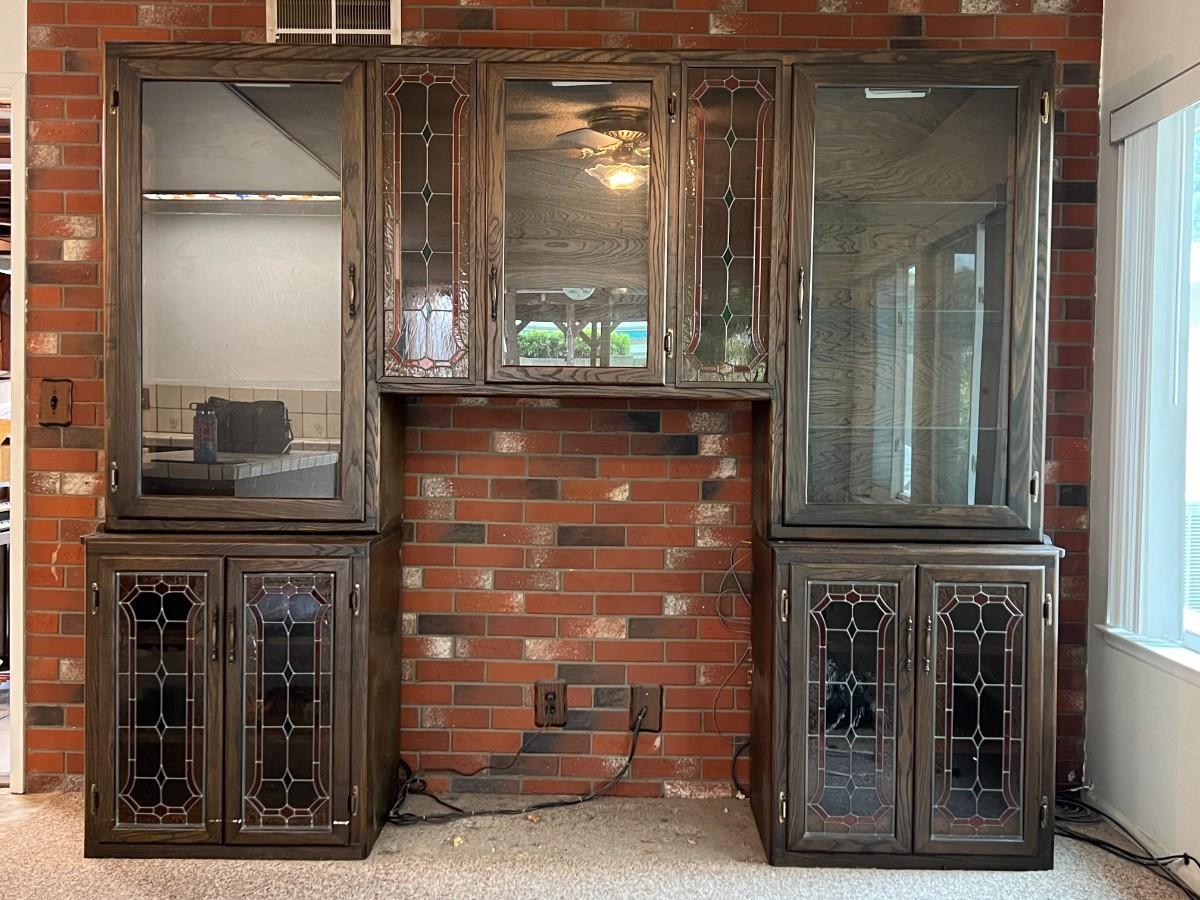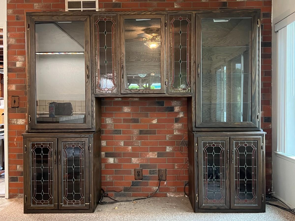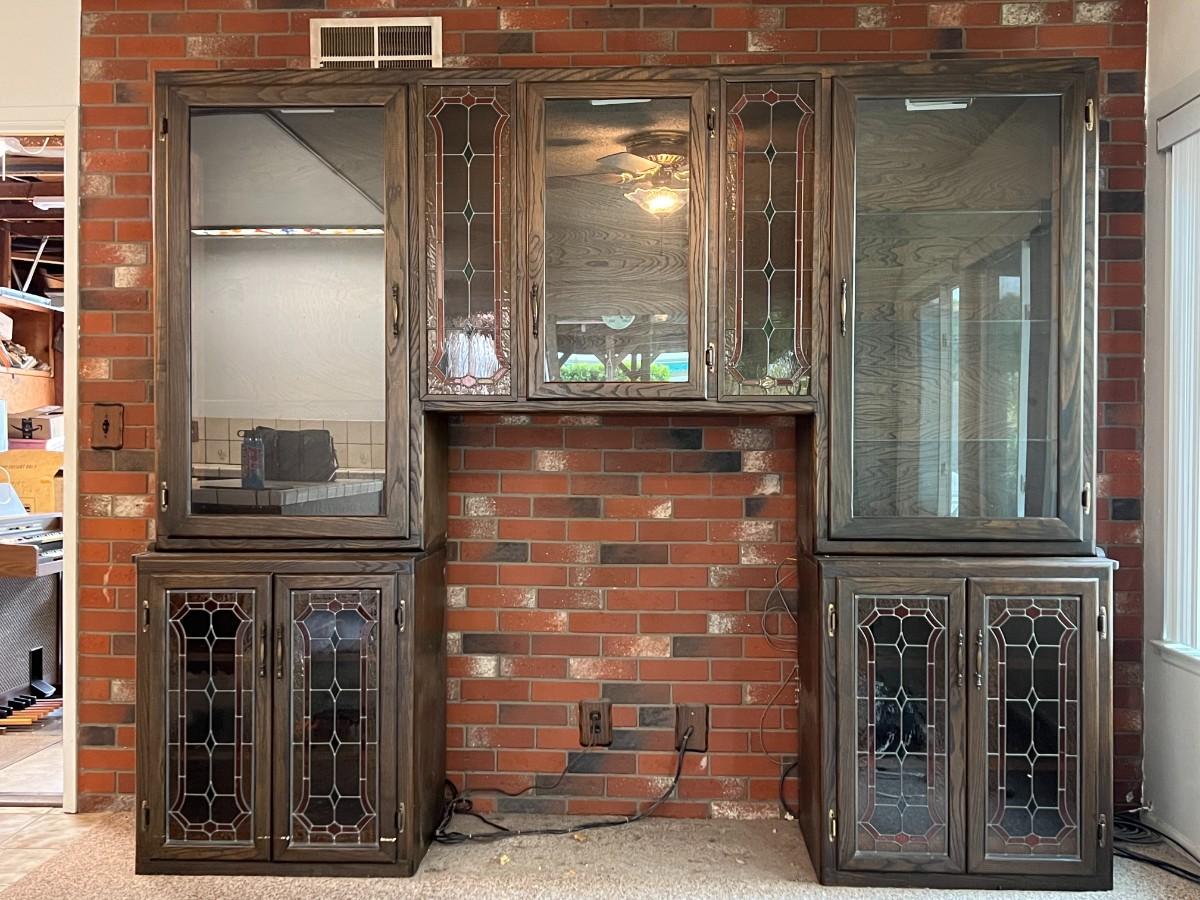 Large Dark Wood Leaded Stained-Glass Door Panels Lit Entertainment Display Cabinet. Stained glass panels in orange and green. Glass shelves in upper side cabinets. About 98" across and 82" tall. Previous owner did put media cable holes in the back for stereo and other electronics.
