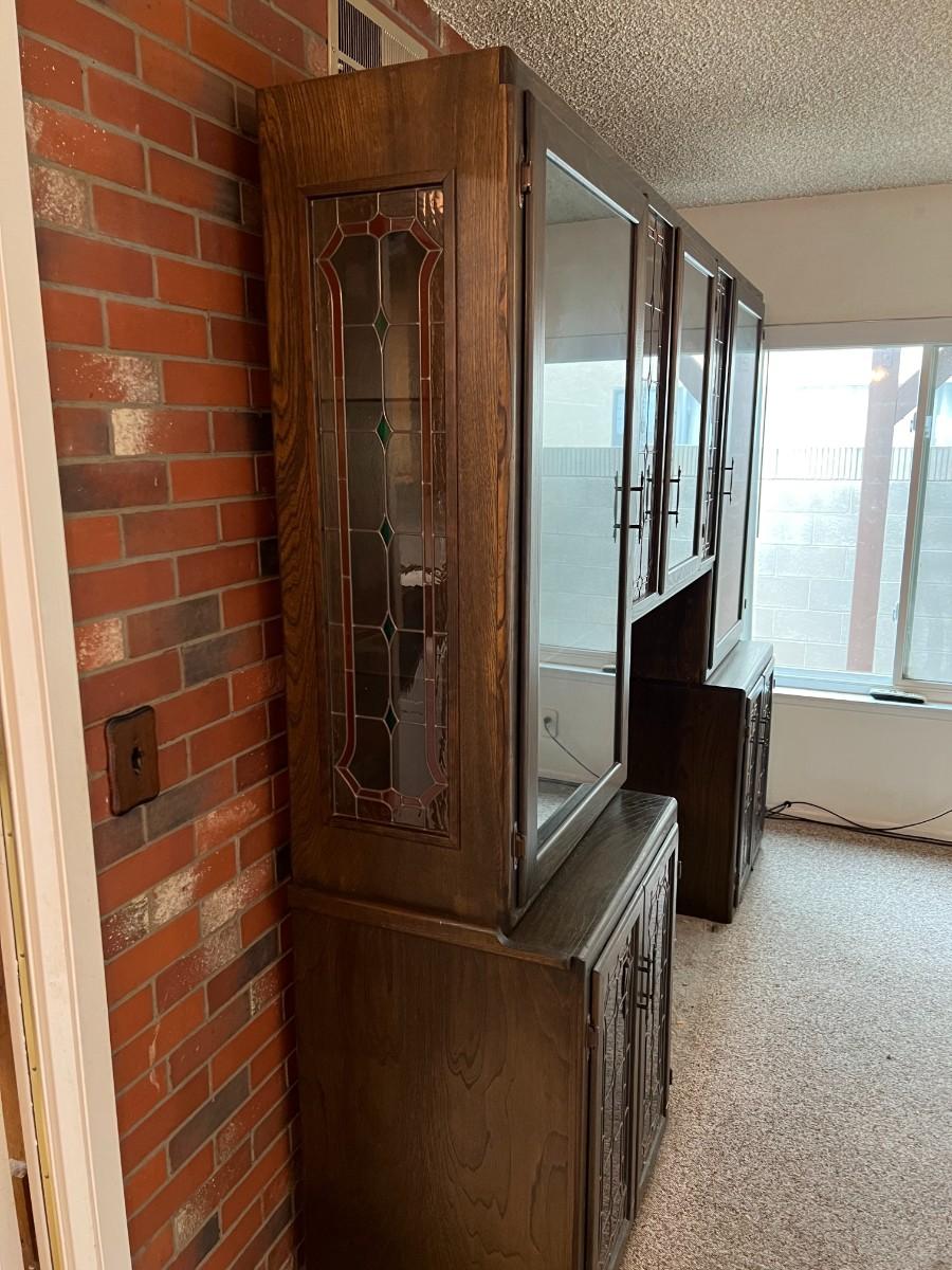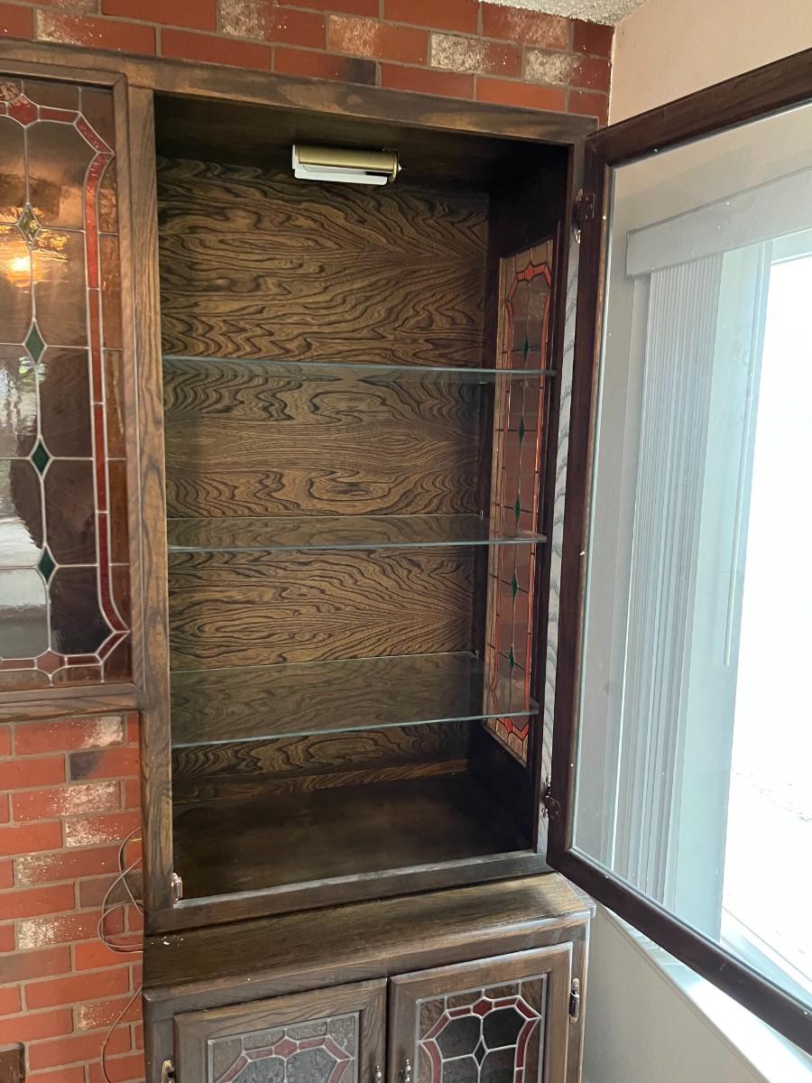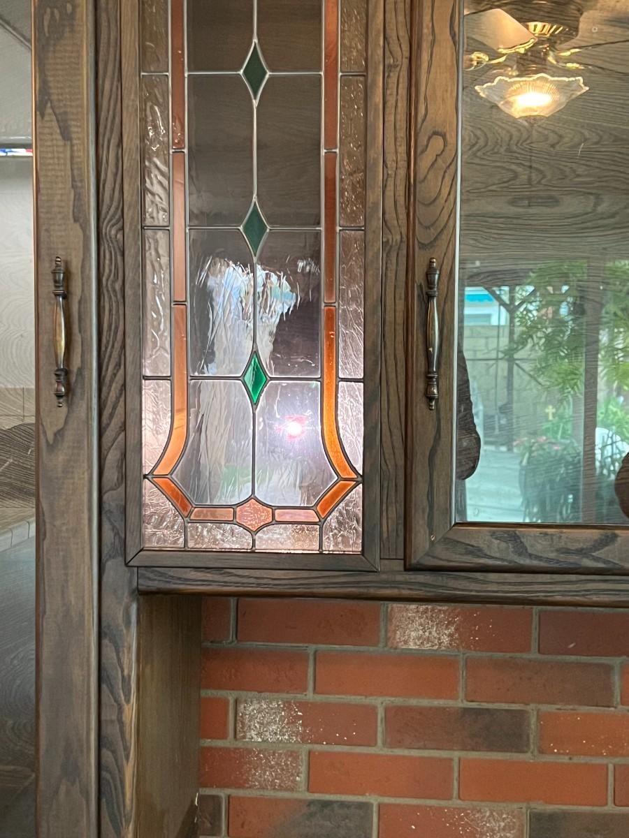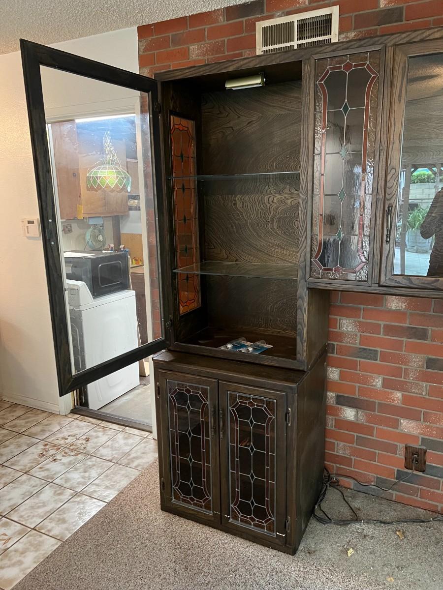 Large Dark Wood Leaded Stained-Glass Door Panels Lit Entertainment Display Cabinet. Stained glass panels in orange and green. Glass shelves in upper side cabinets. About 98" across and 82" tall. Previous owner did put media cable holes in the back for stereo and other electronics.