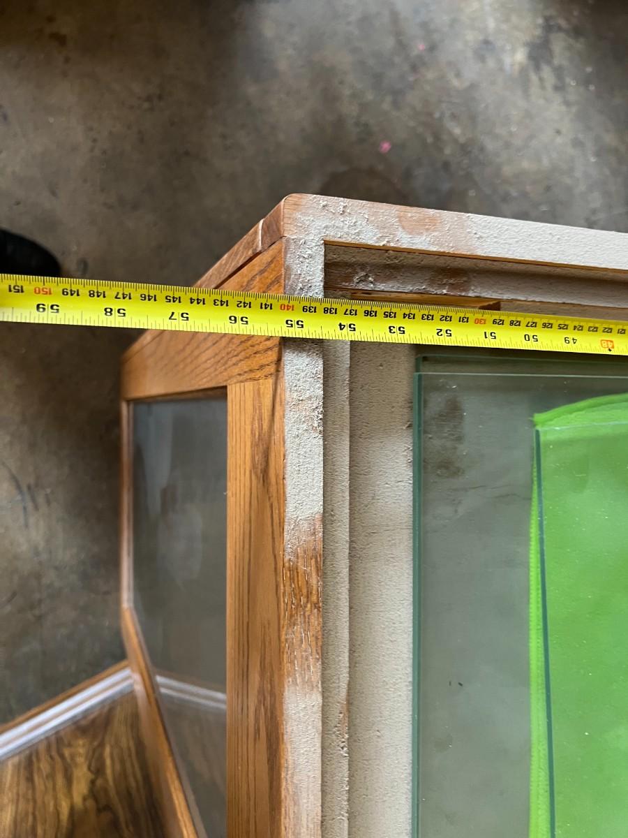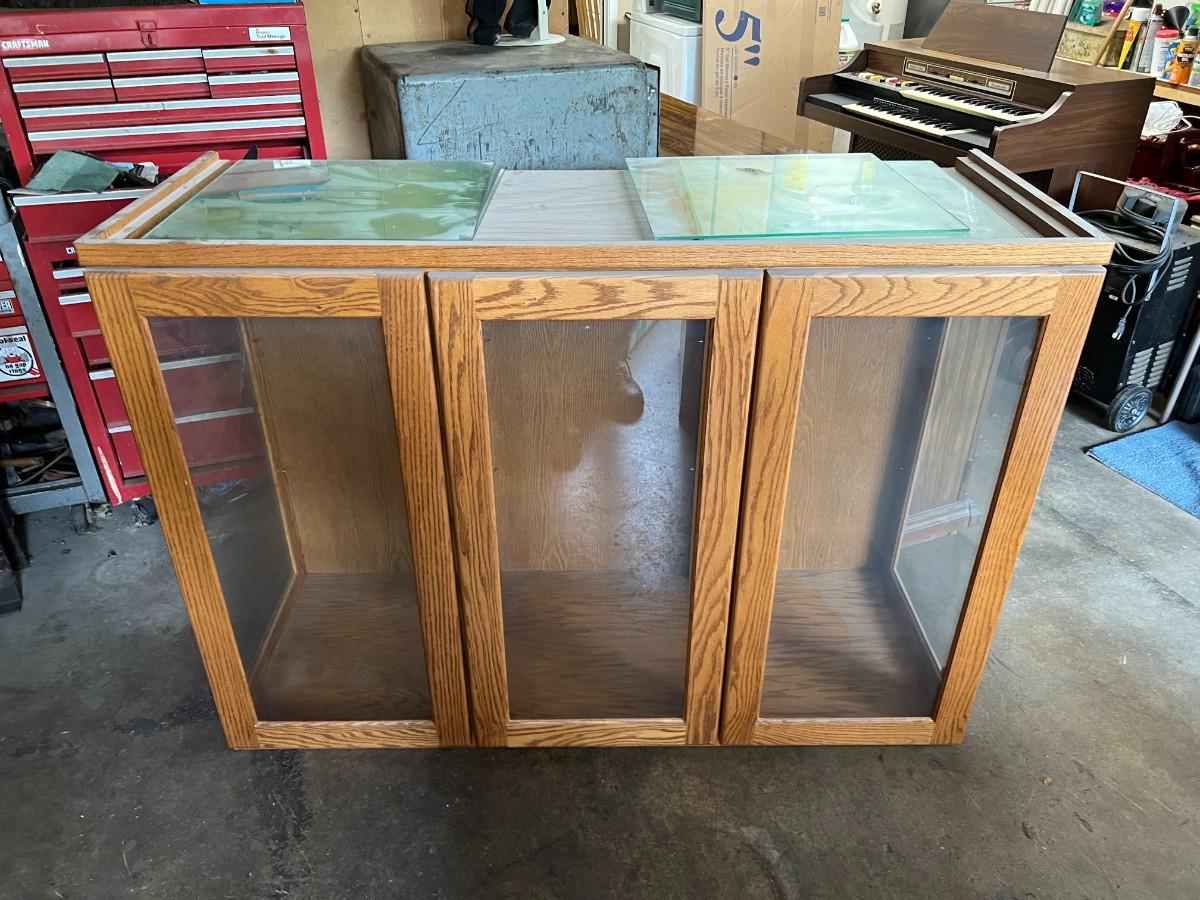 Light Oak Wood & Glass Display Cabinet with Glass Shelves. Good condition. About 55" wide.