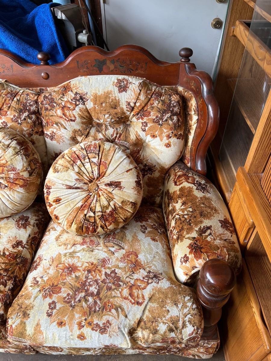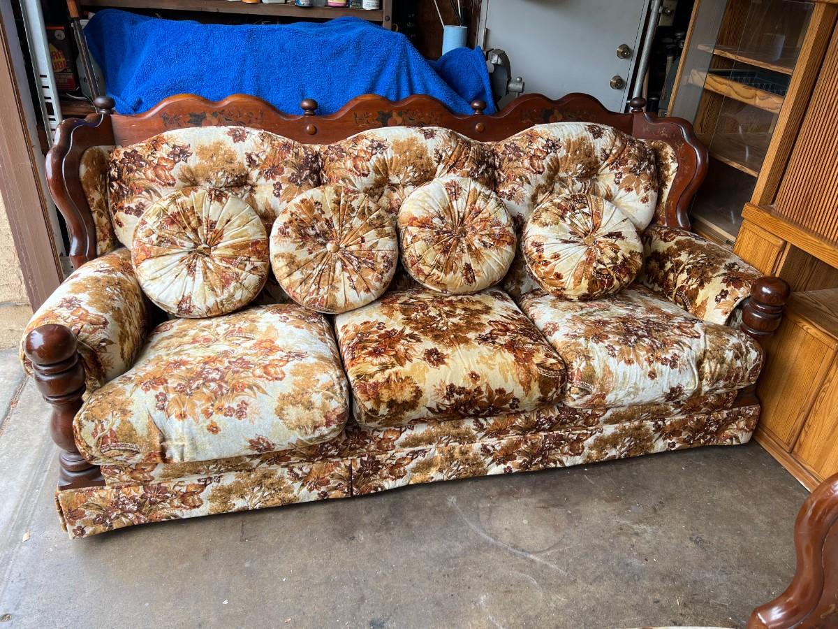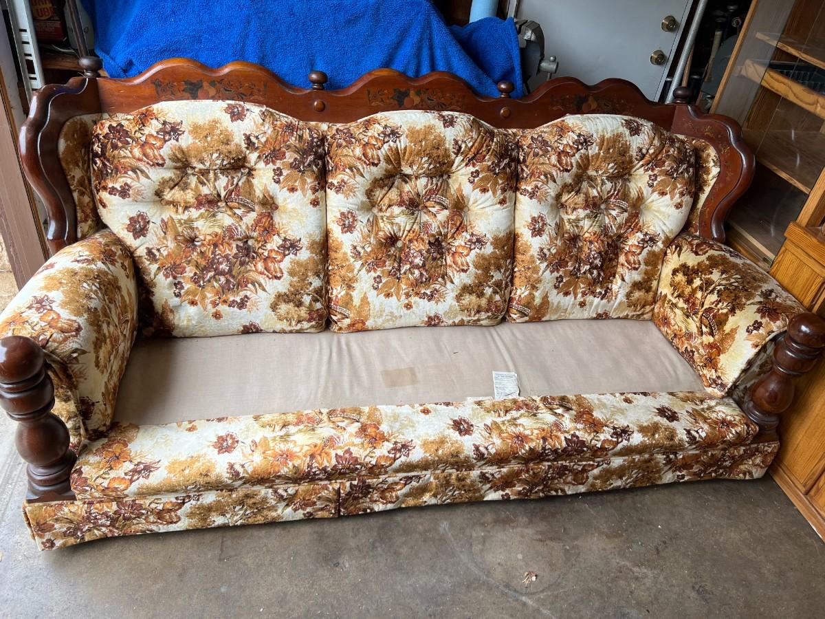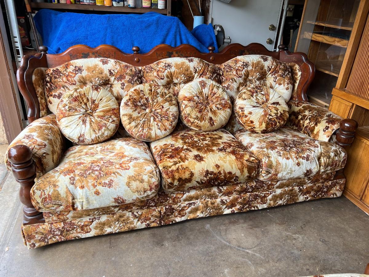 Vintage Retro Three Cushion Wood Framed Country Rustic Couch Sofa. In good vintage condition. may have light signs of use and fade from age.