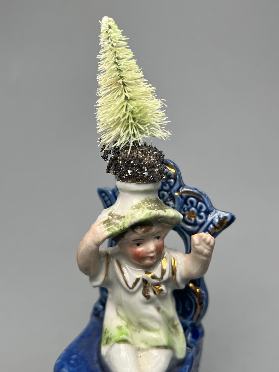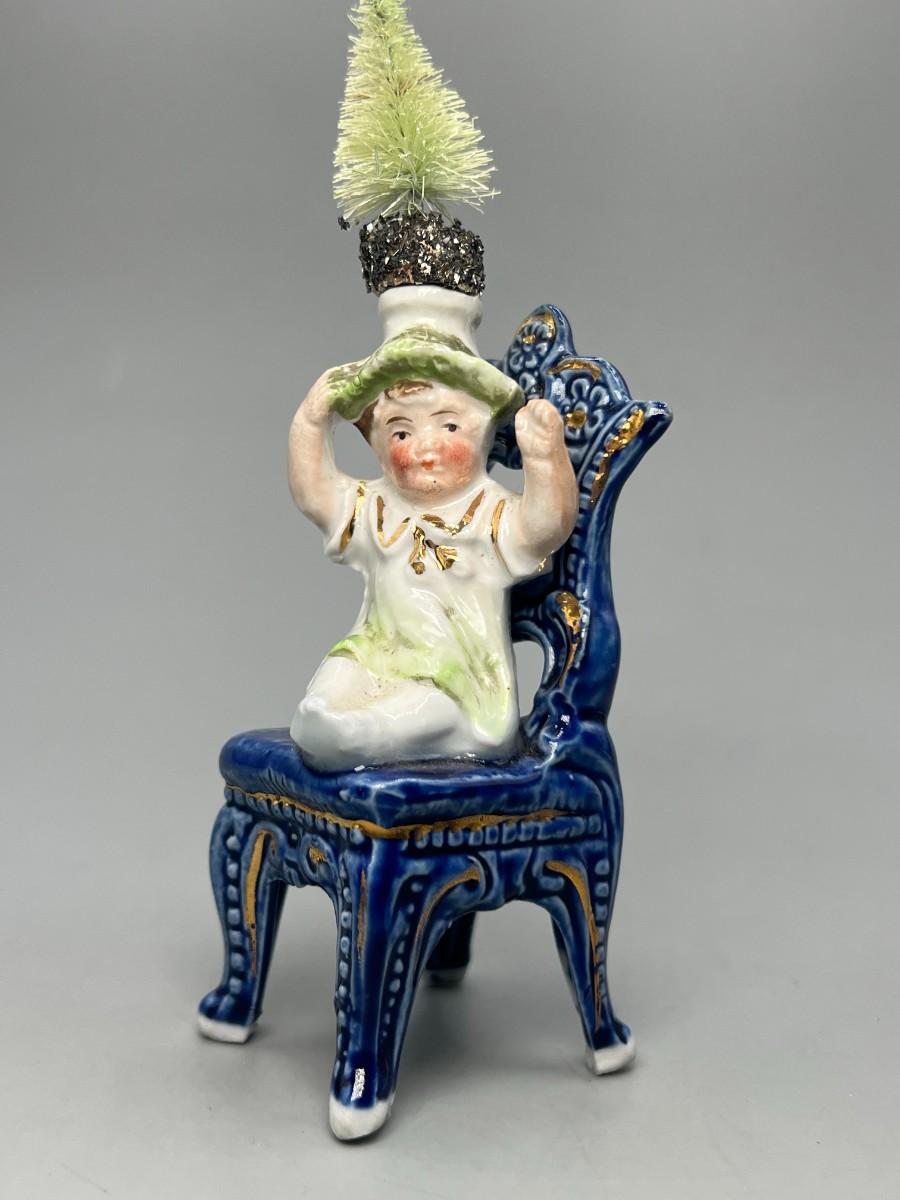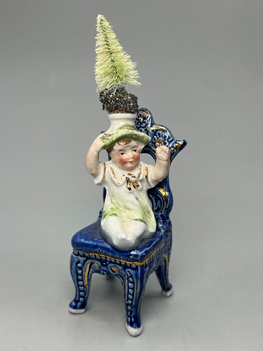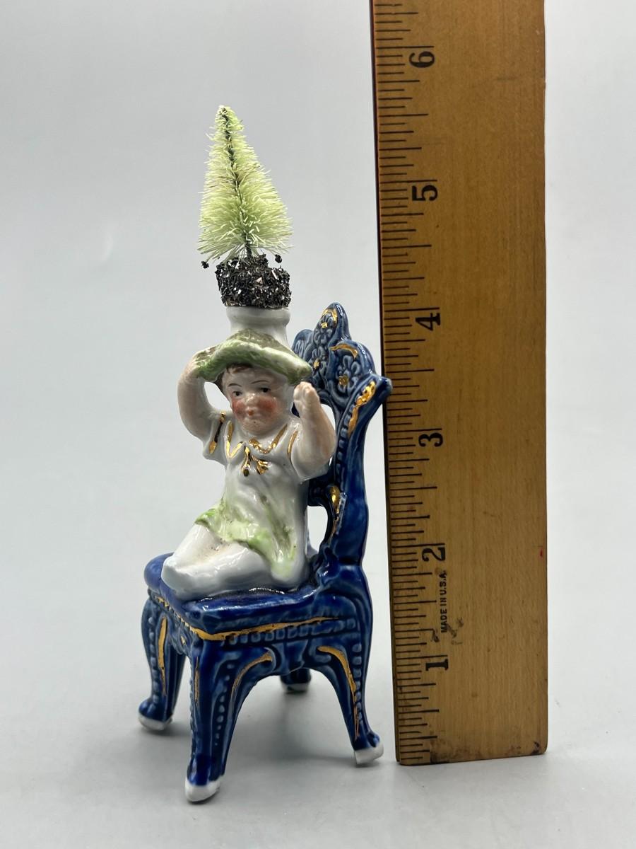 Vintage Child Sitting in Chair Porcelain Figurine with Bottle Brush Tree for Hat
