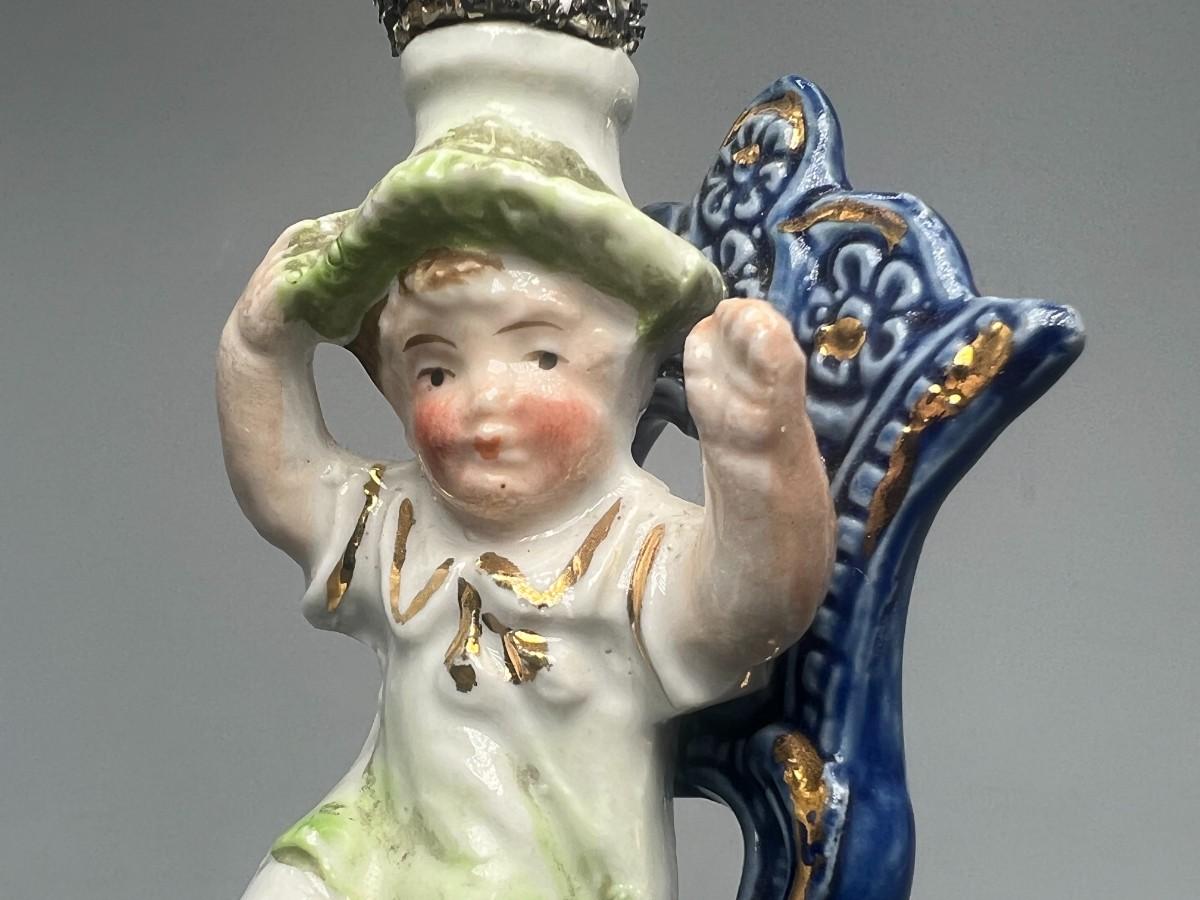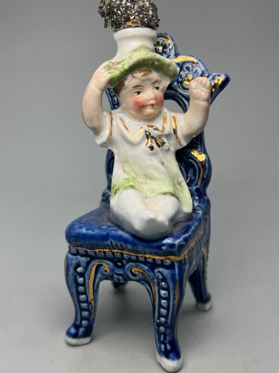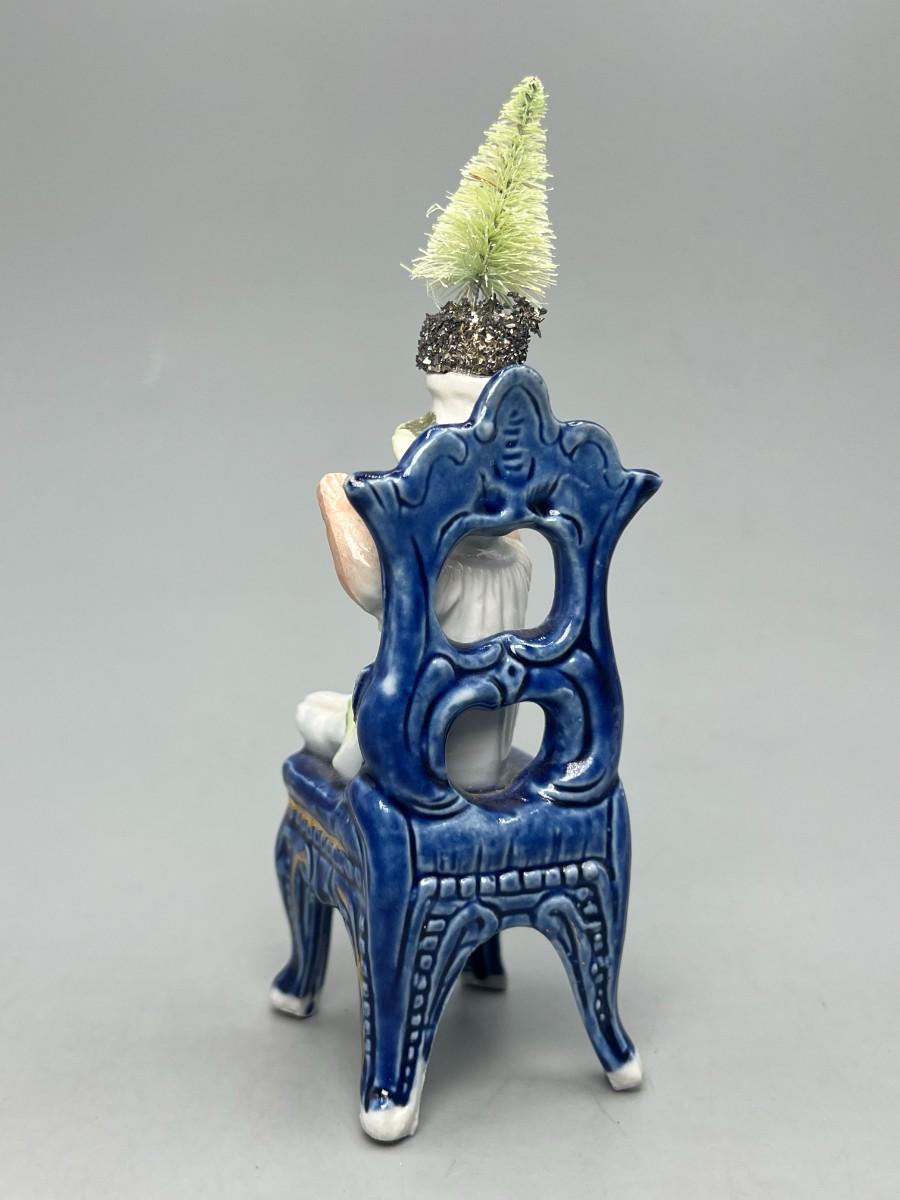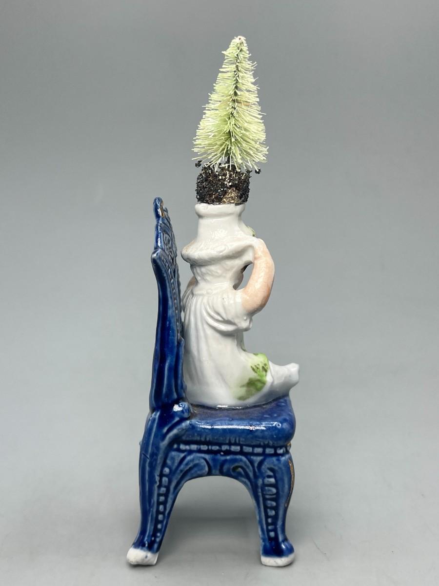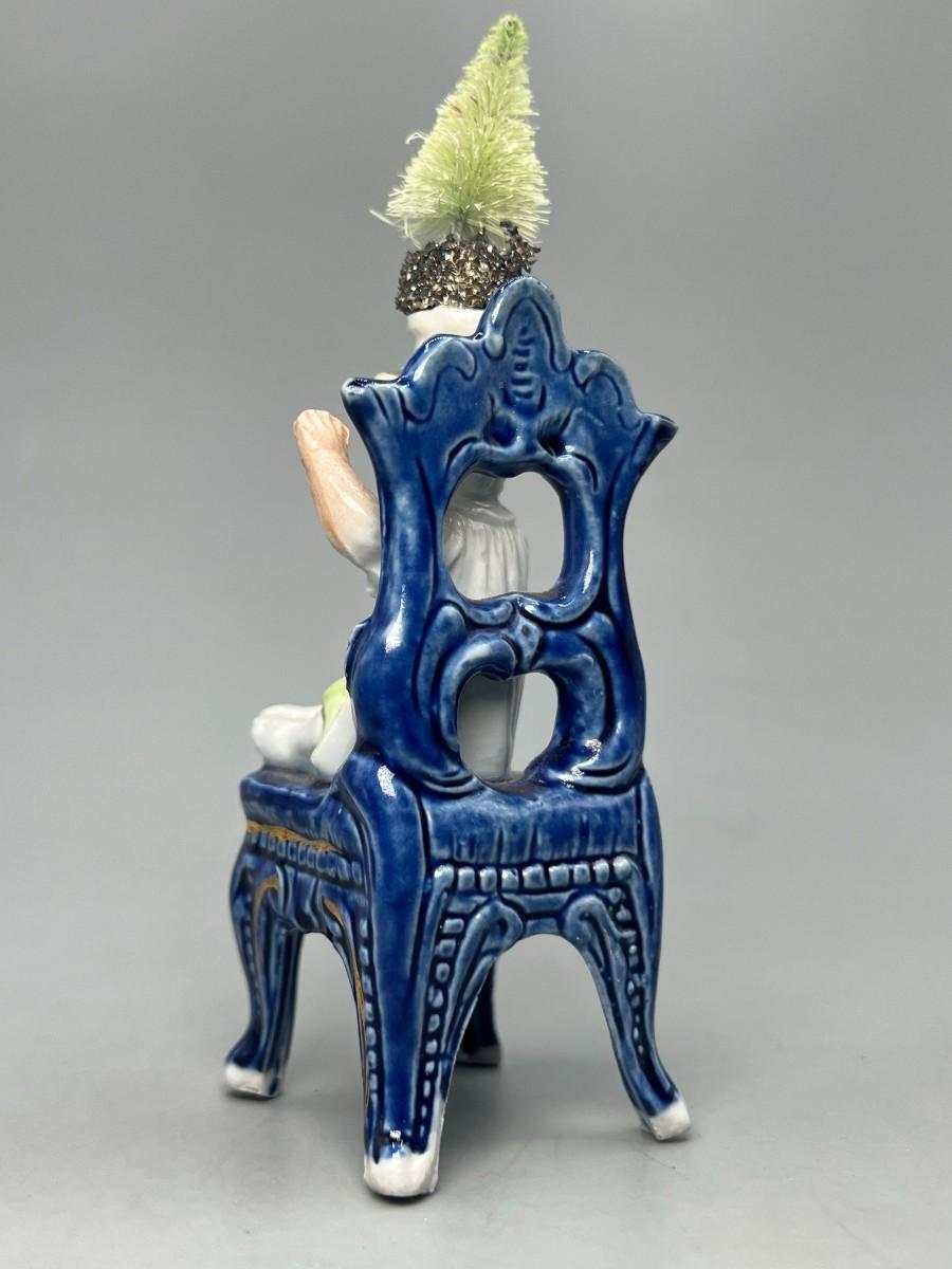 Vintage Child Sitting in Chair Porcelain Figurine with Bottle Brush Tree for Hat