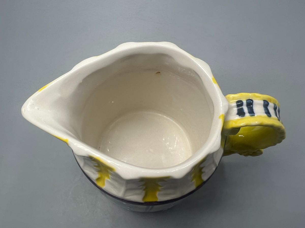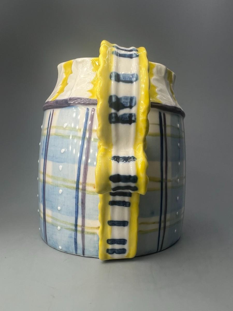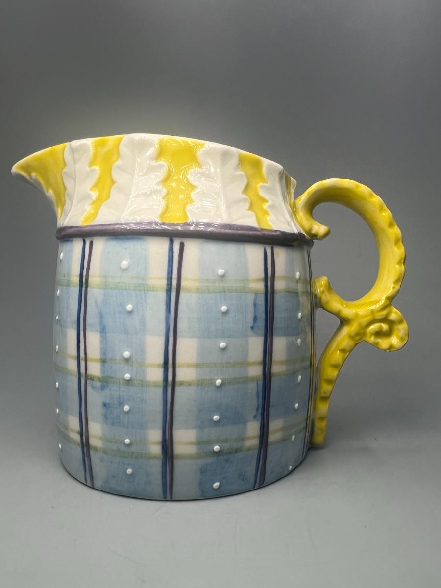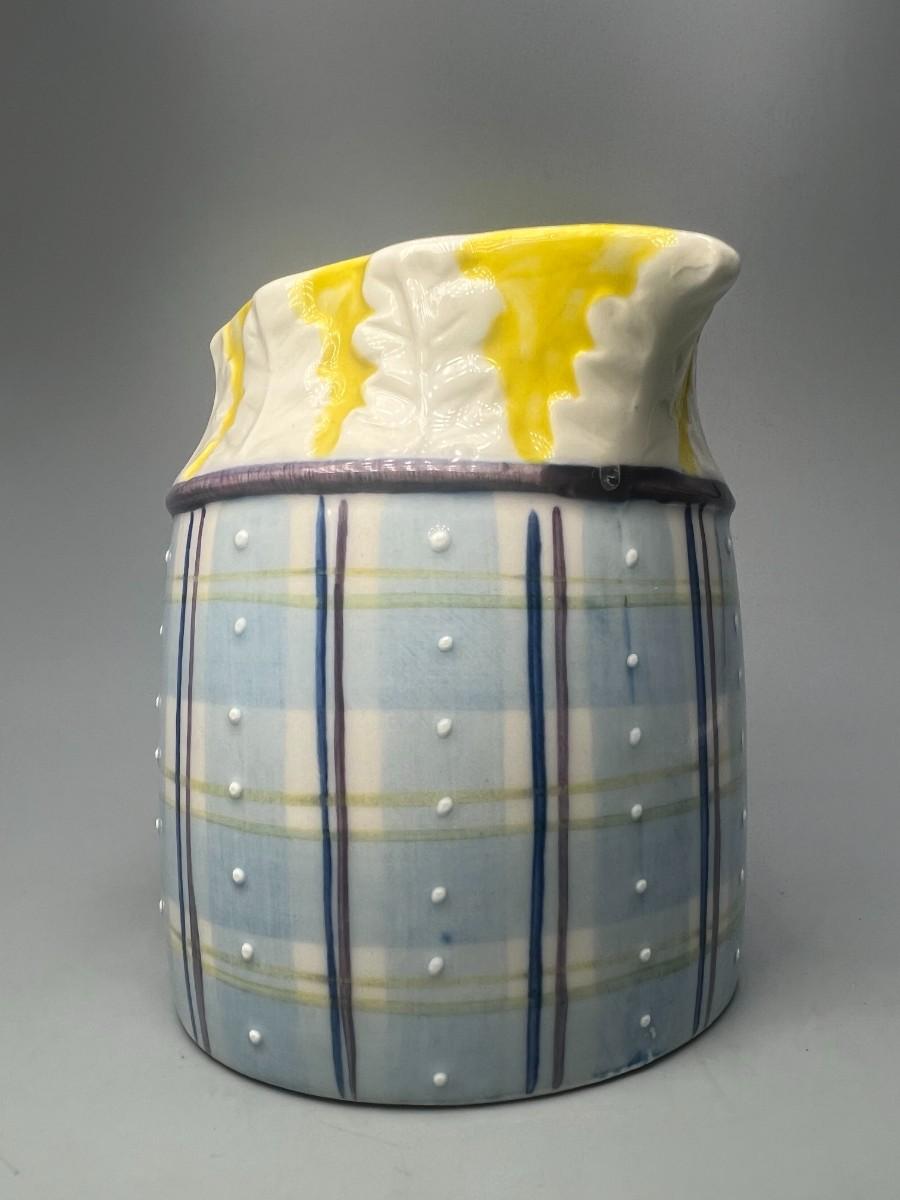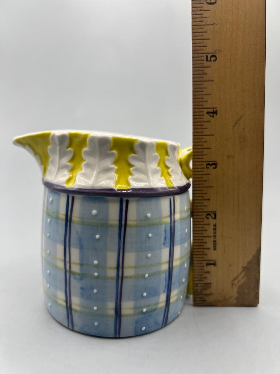 Small Vintage Yellow and Blue Plaid Ceramic Cream Pitcher. In good condition. About 5" size.