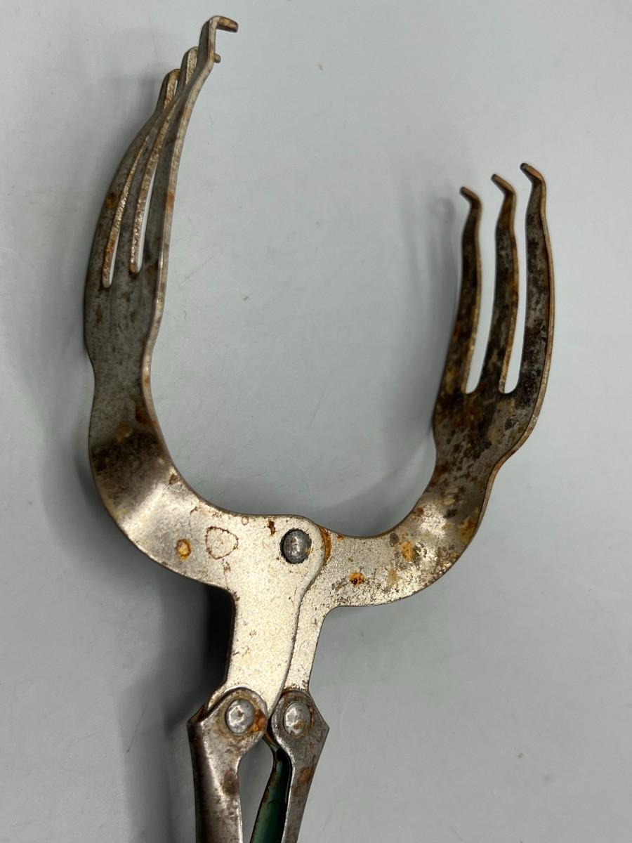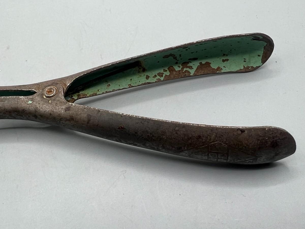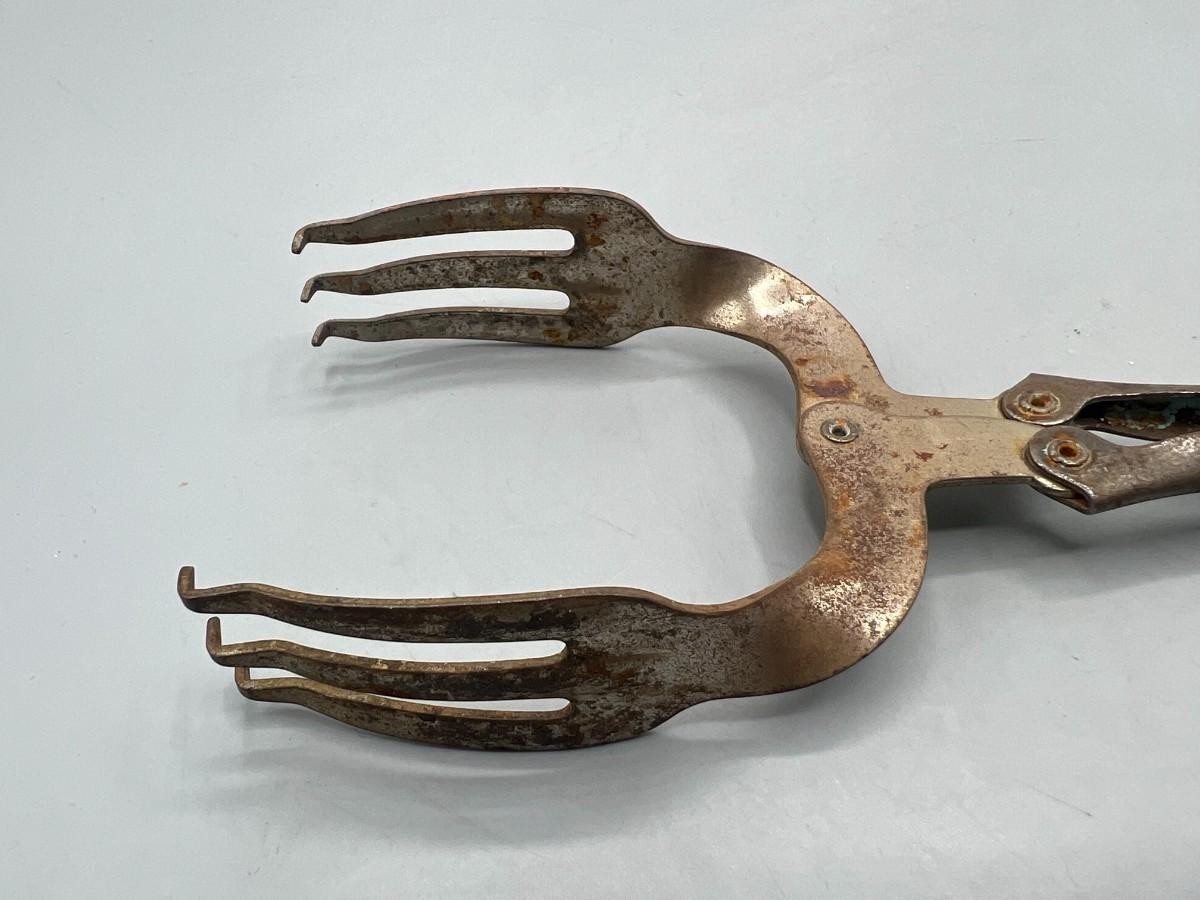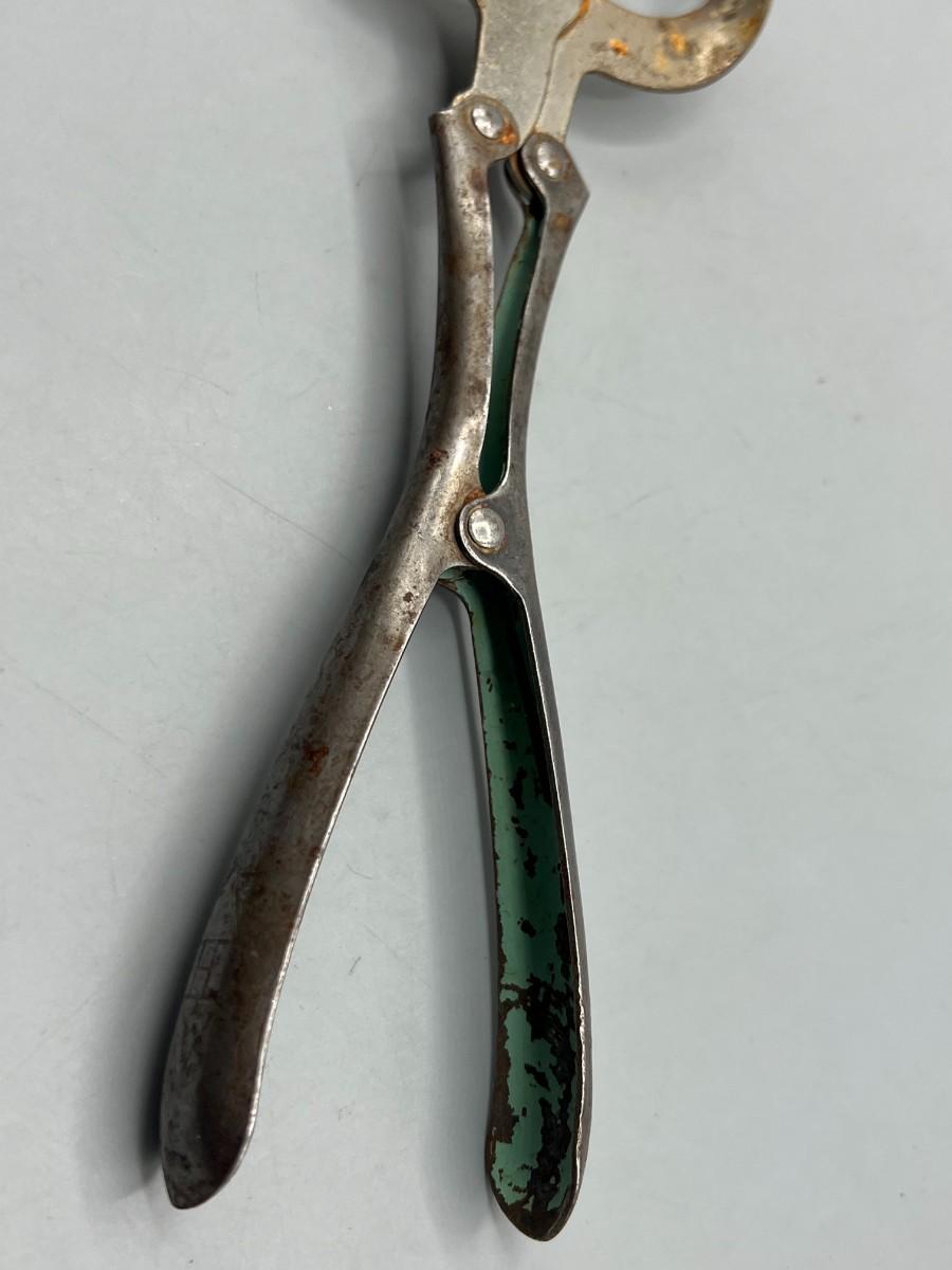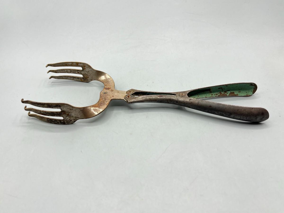 There is noticeable rust and patina to the serving tongs, but there is no significant damage and is in overall good collectible condition. The tongs open and close seamlessly.