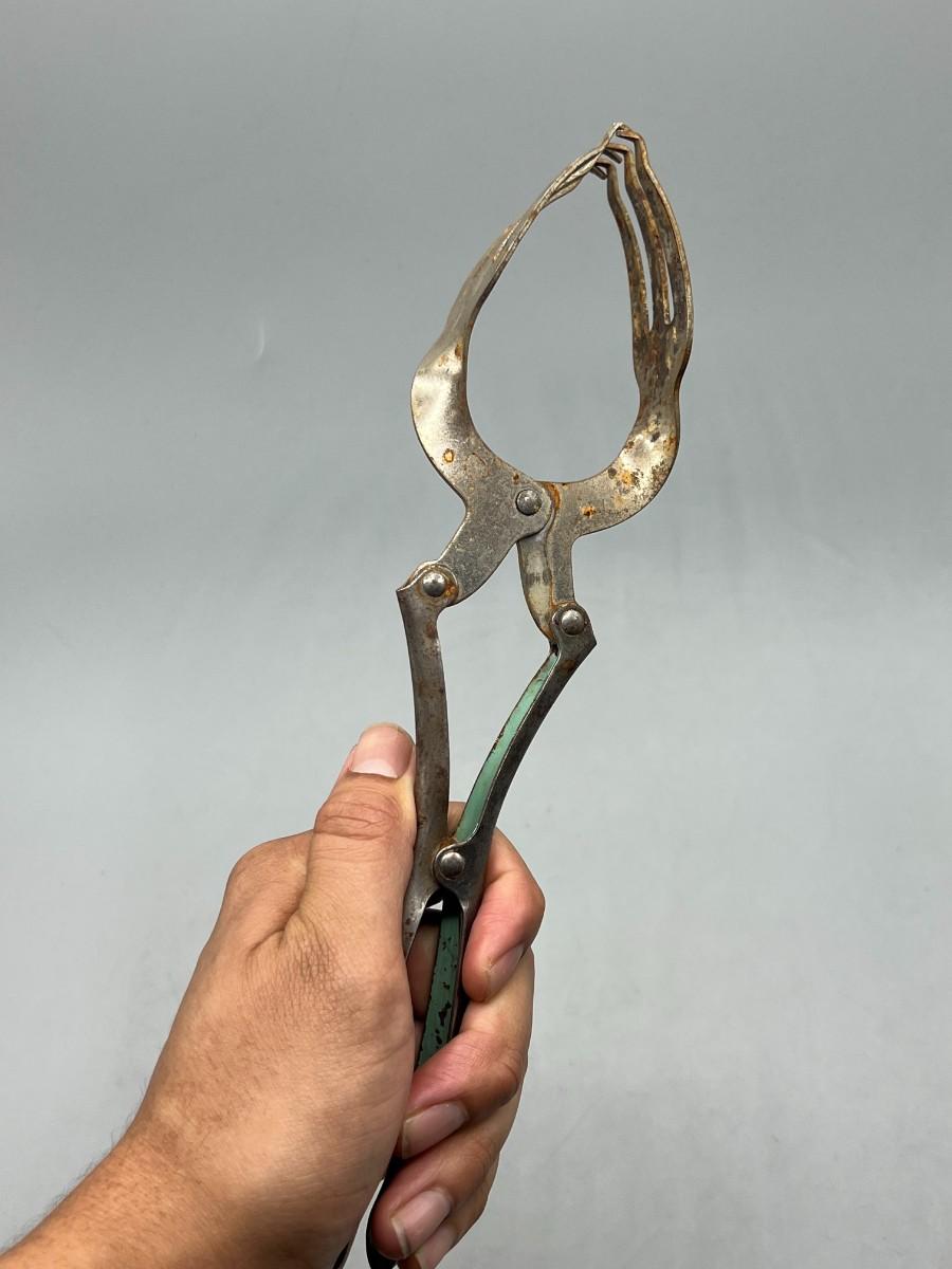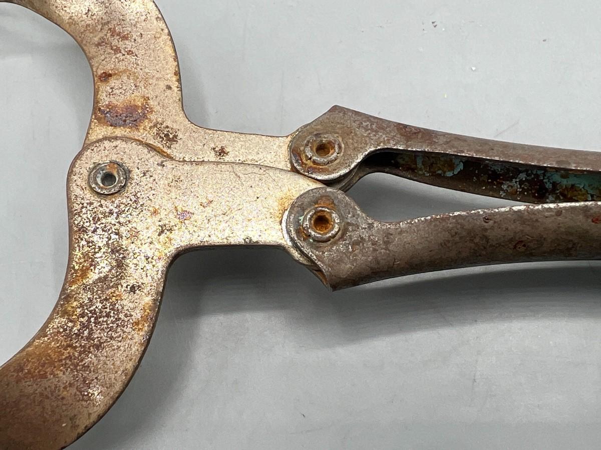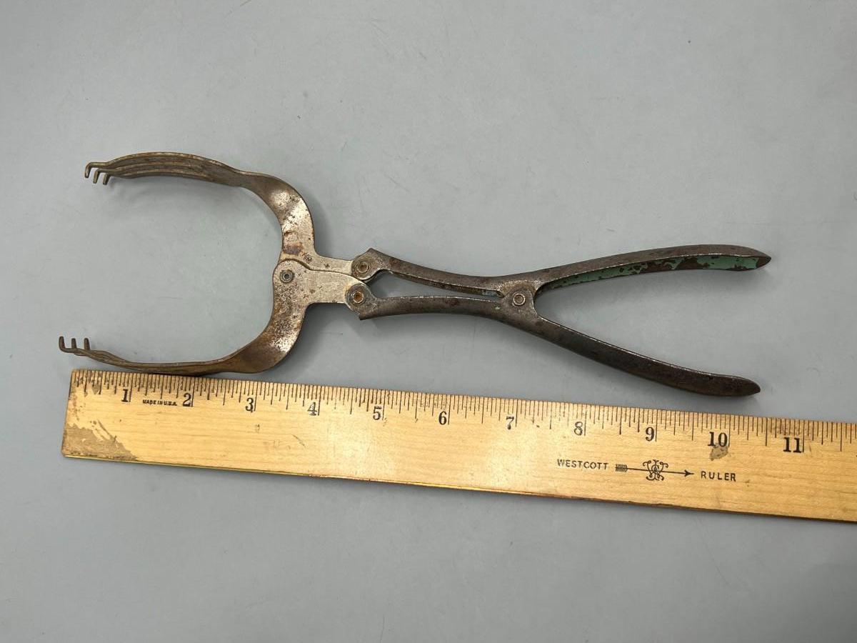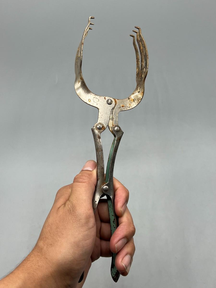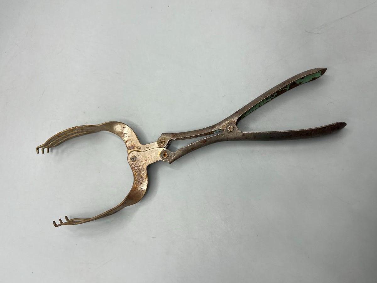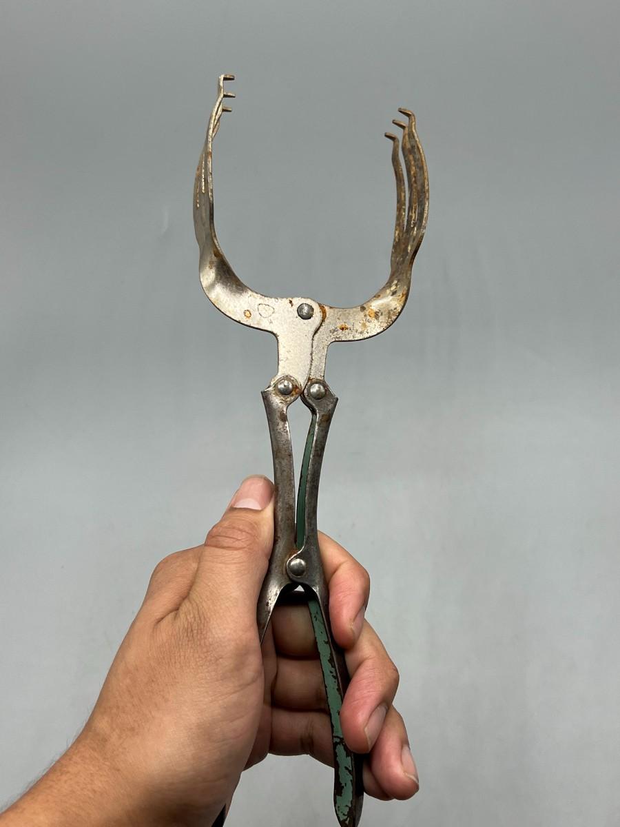 There is noticeable rust and patina to the serving tongs, but there is no significant damage and is in overall good collectible condition. The tongs open and close seamlessly.