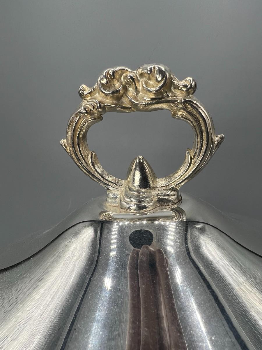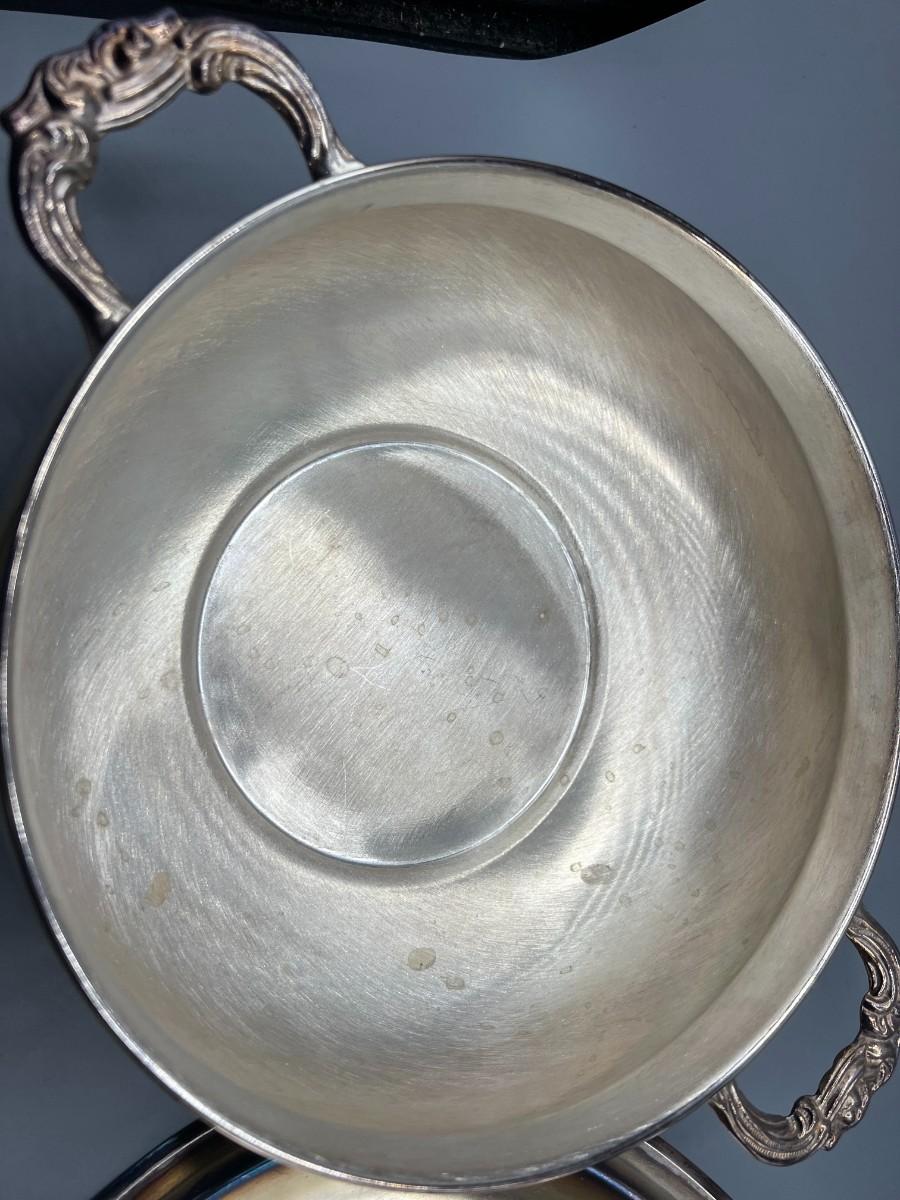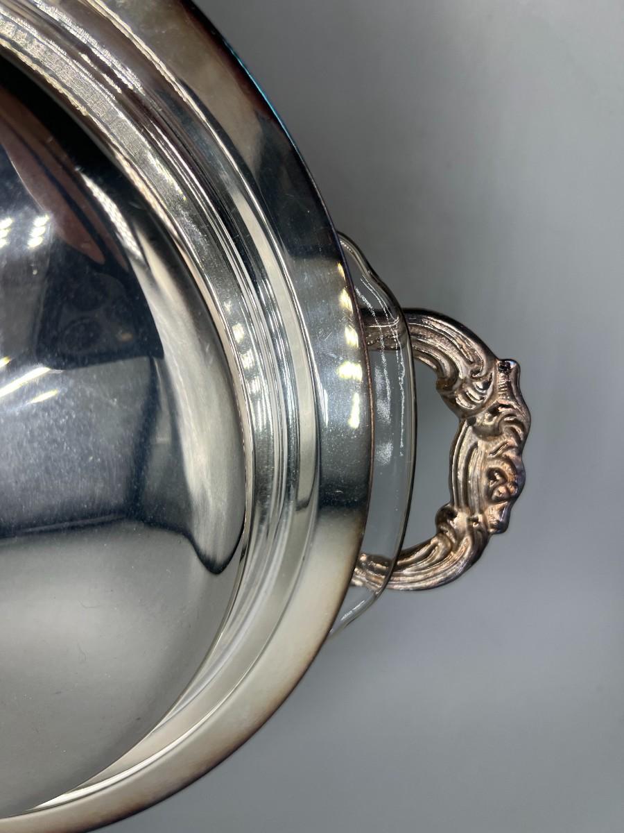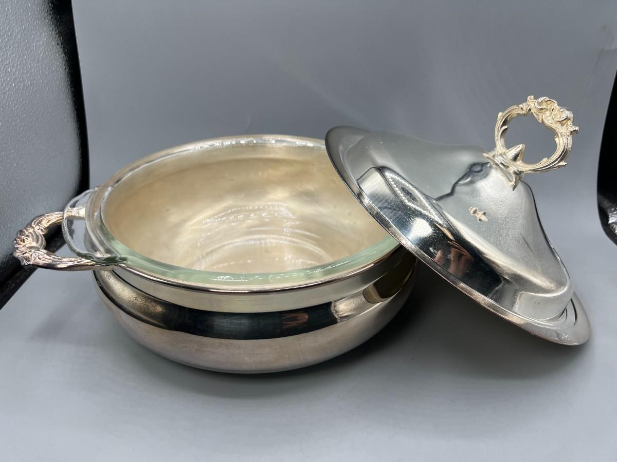 Vintage Silver Plate Lidded Casserole Soup Tureen Serving Dish with Glass Fire King Bakeware Bowl. In good condition.