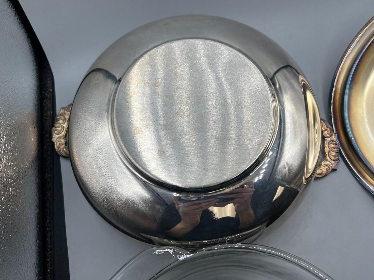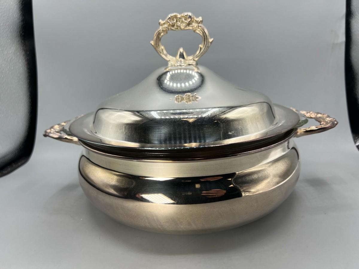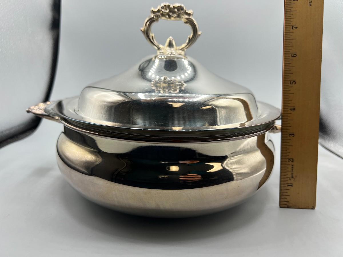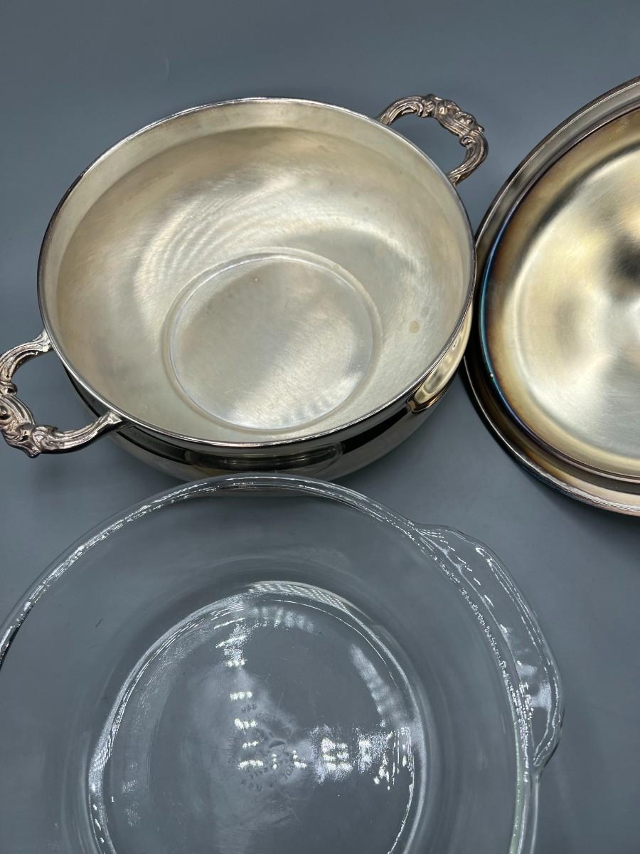 Vintage Silver Plate Stainless Lidded Casserole Soup Tureen Serving Dish with Glass Fire King Bakeware Bowl