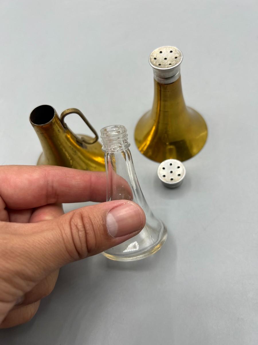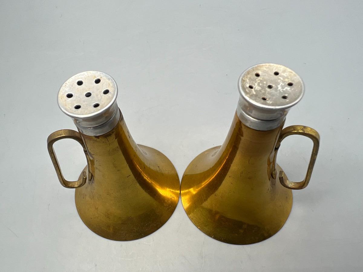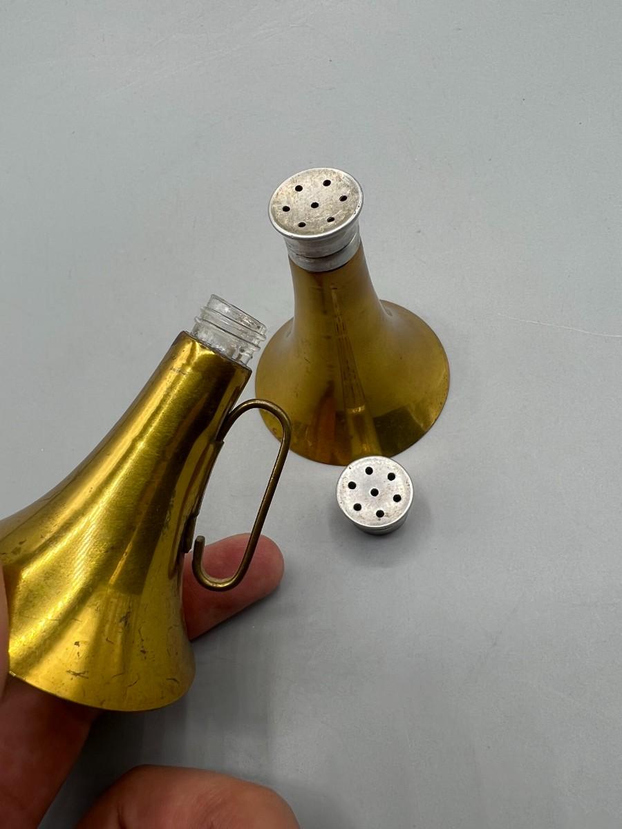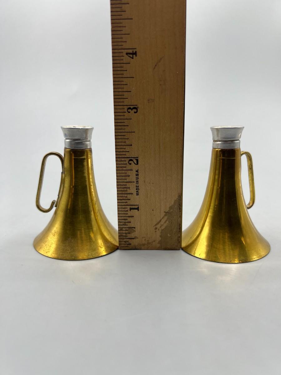 Vintage Brass Horn Megaphone Shaped Glass Container Salt & Pepper Shakers