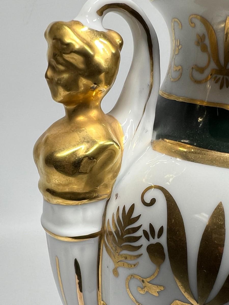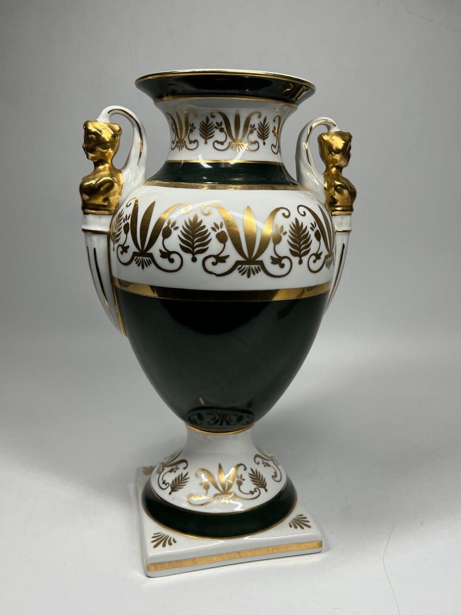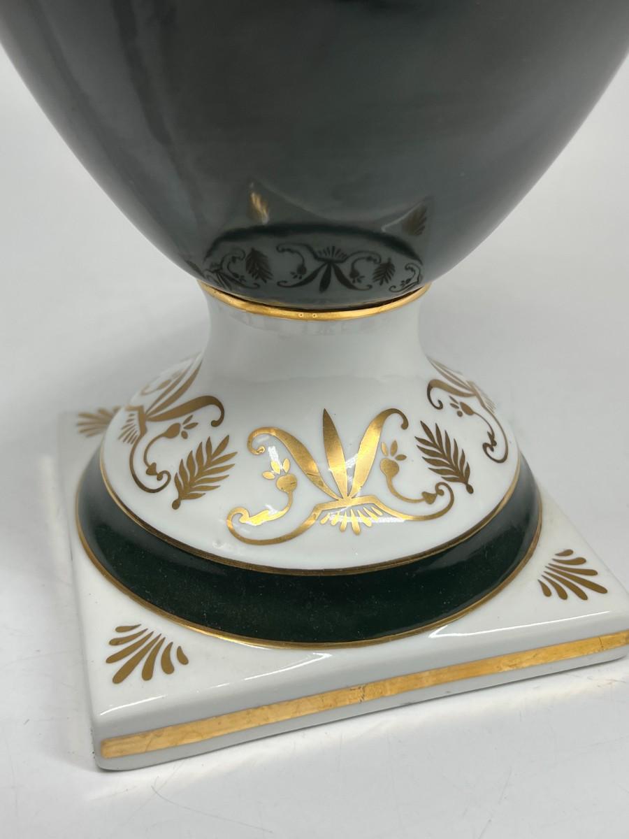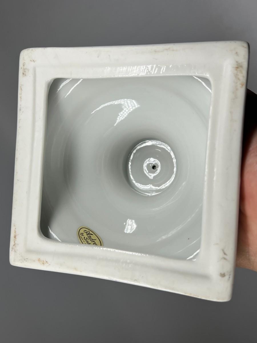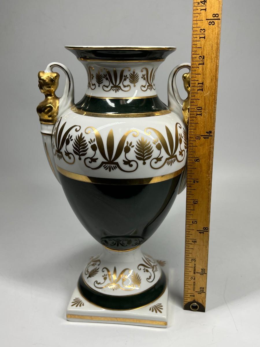 Porcelain Andrea by Sadek Vase #6492 12.5" tall handled pedestal black white gold