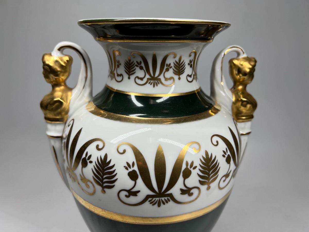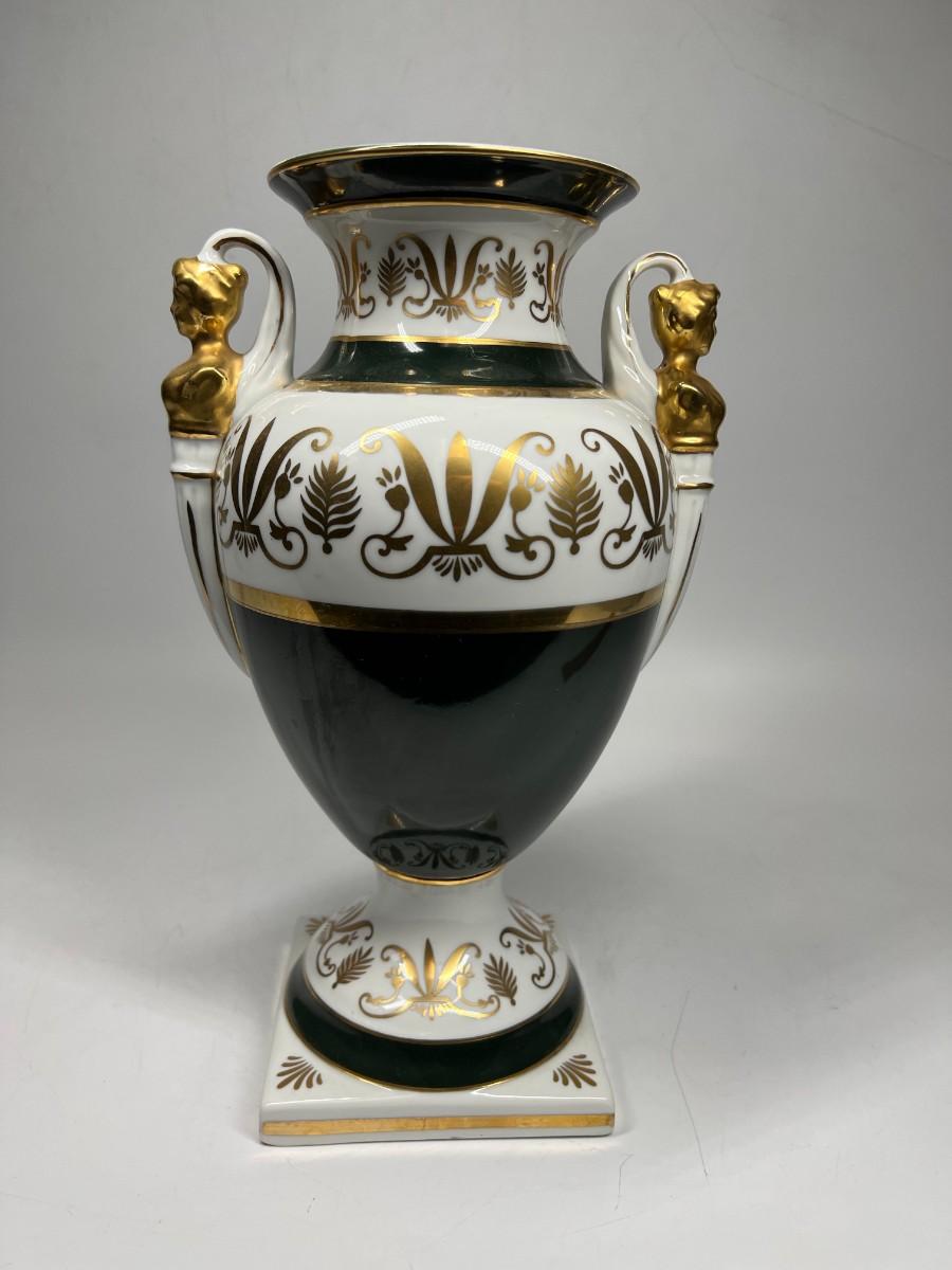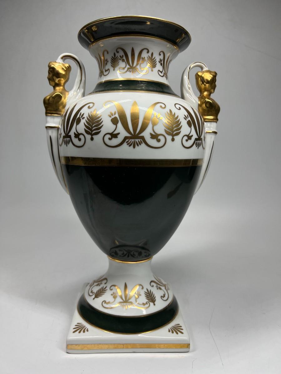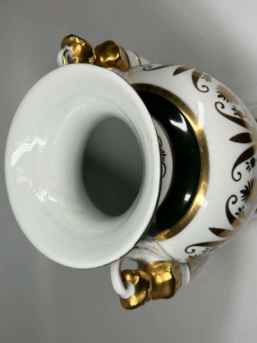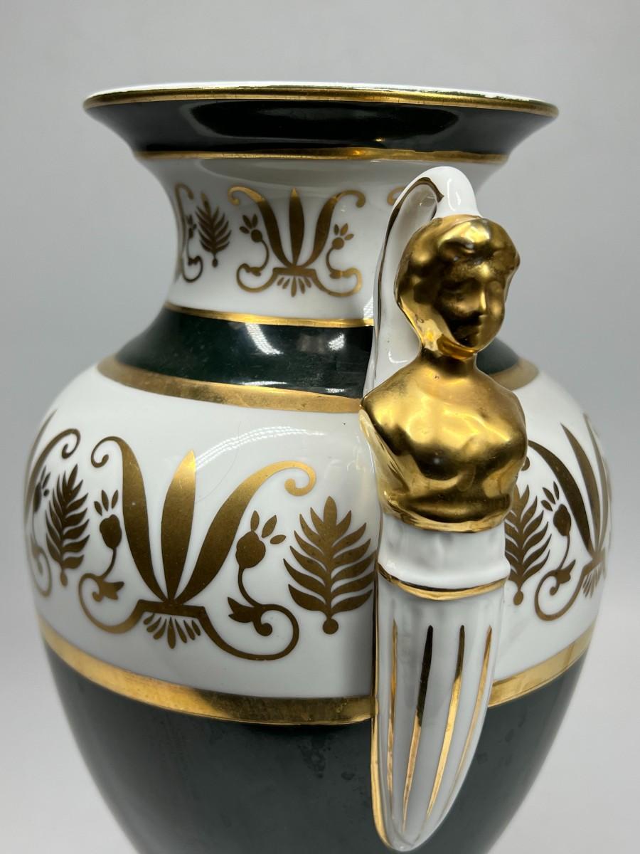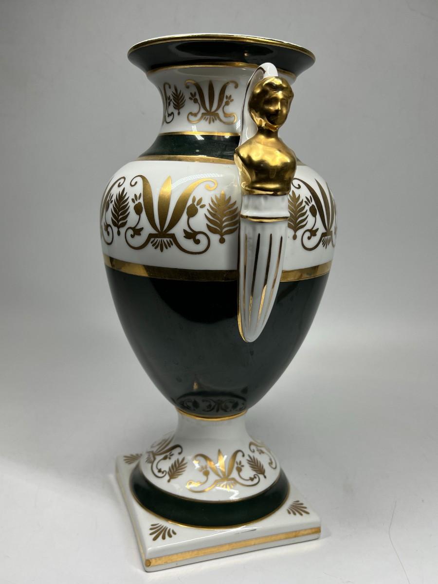 Porcelain Andrea by Sadek Vase #6492 12.5" tall handled pedestal black white gold
