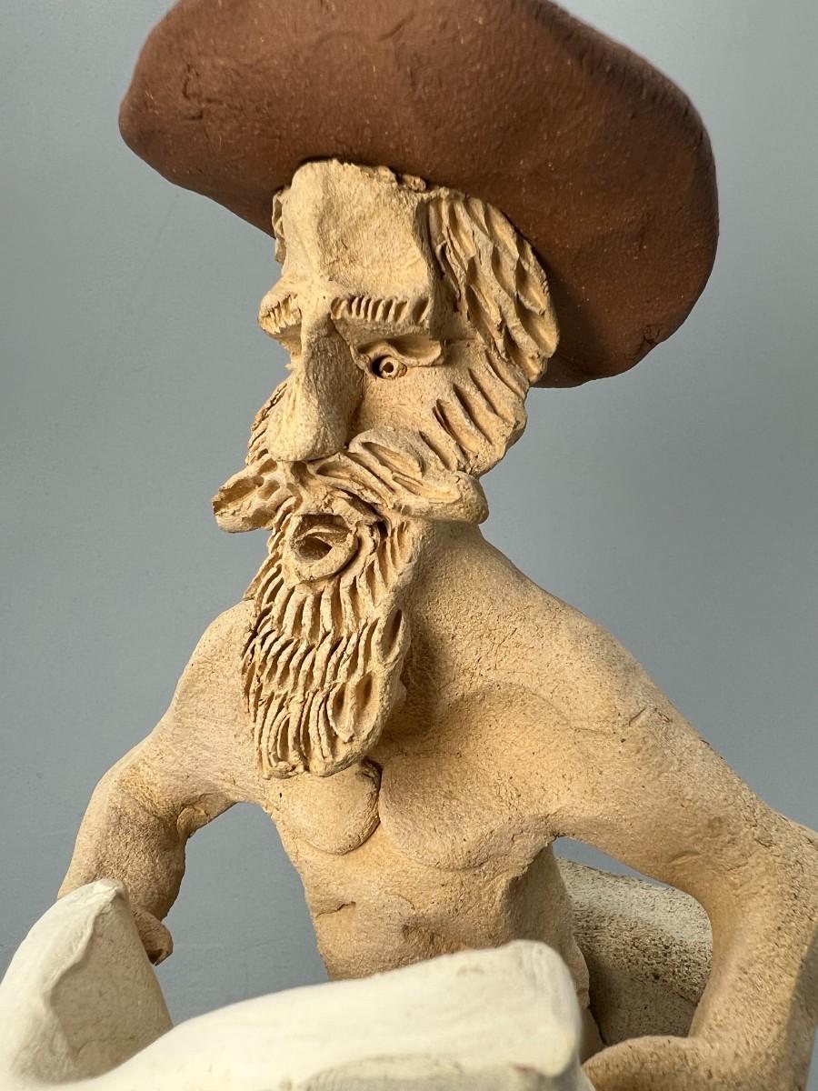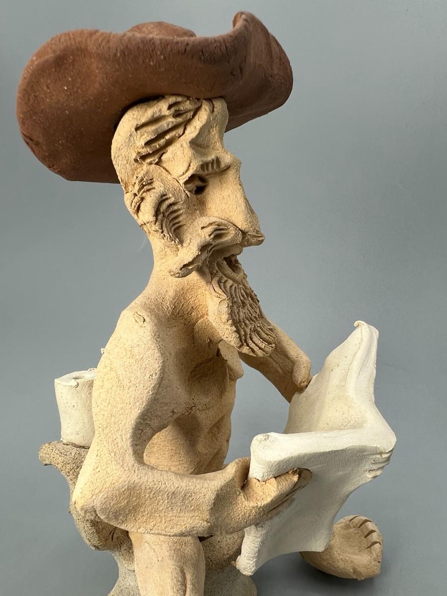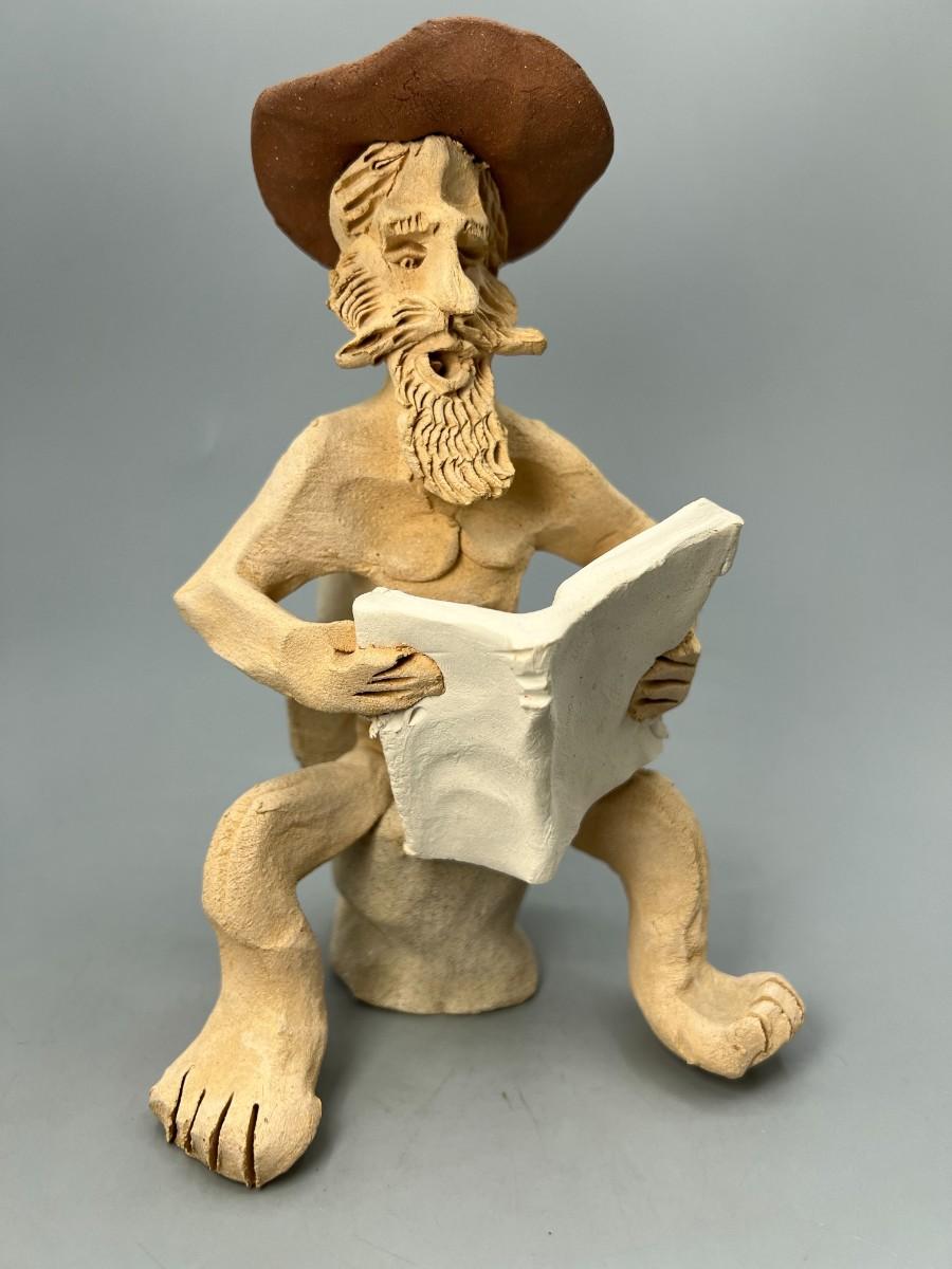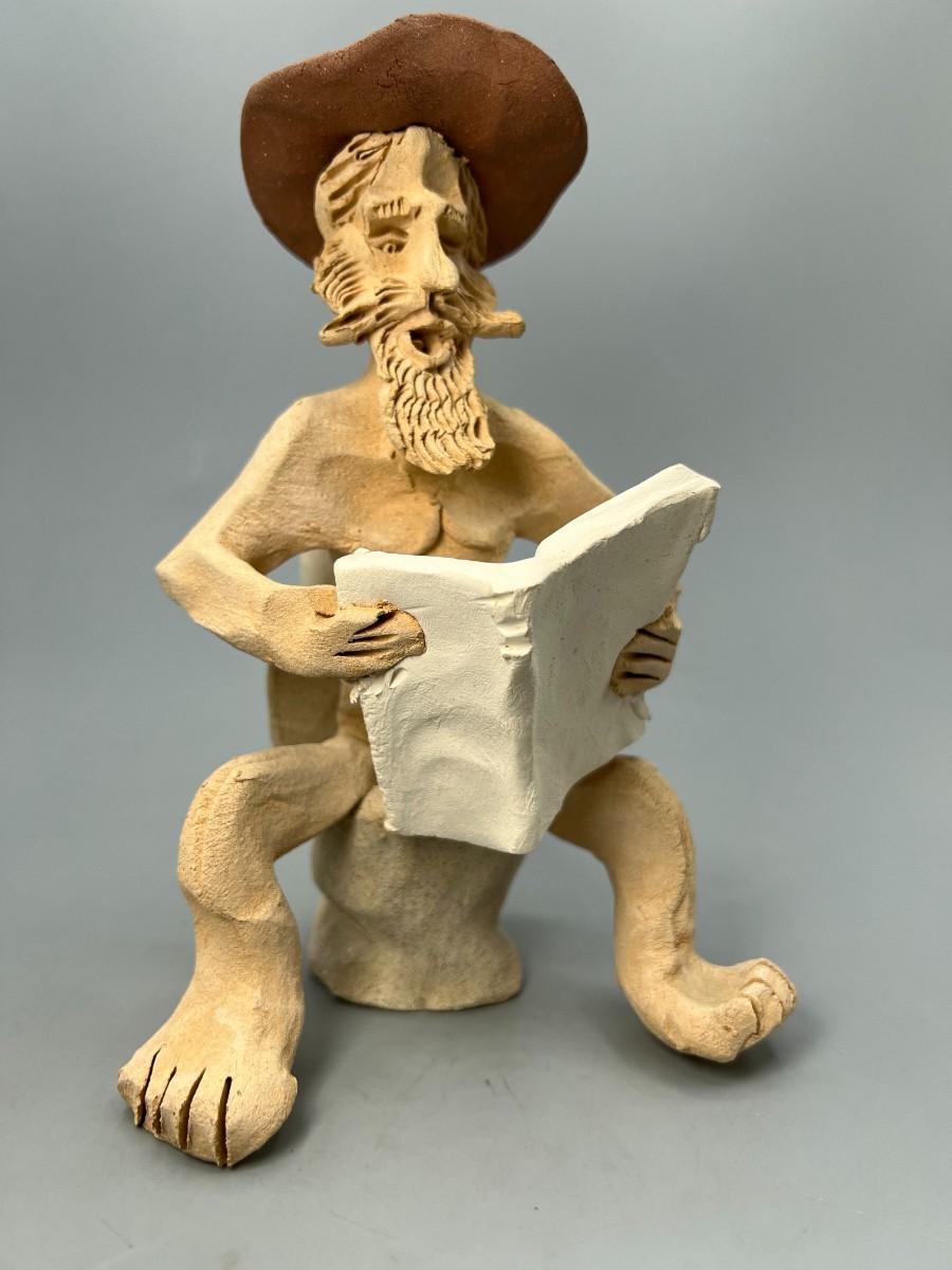 Handmade Crafted Molded Clay Bearded Man on Toilet Reading Newspaper