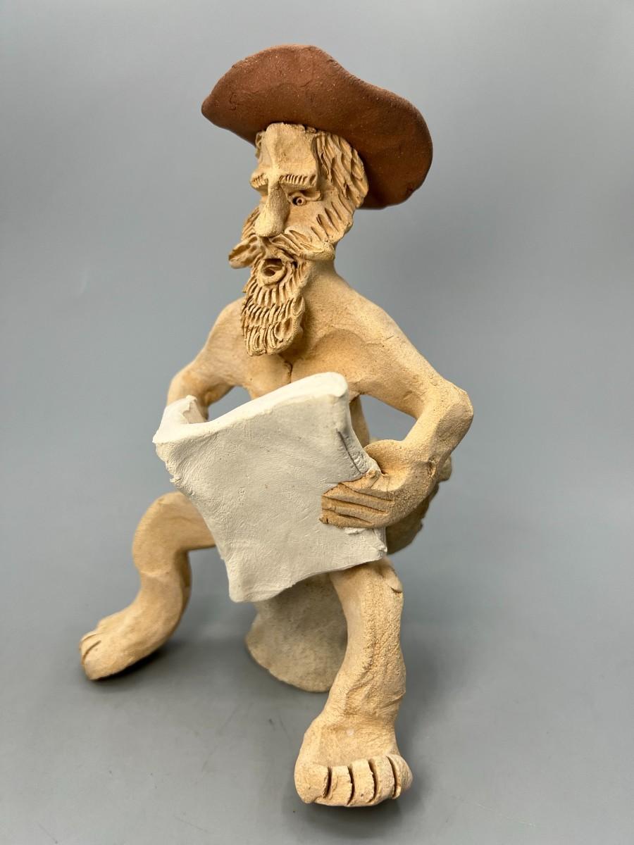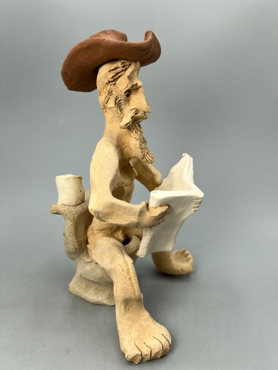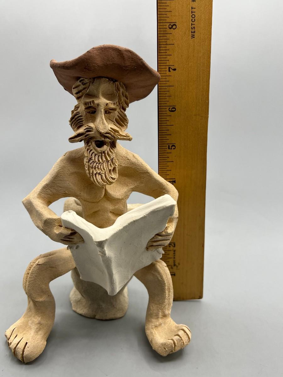 Handmade Crafted Molded Clay Bearded Man on Toilet Reading Newspaper. In good handmade condition.
