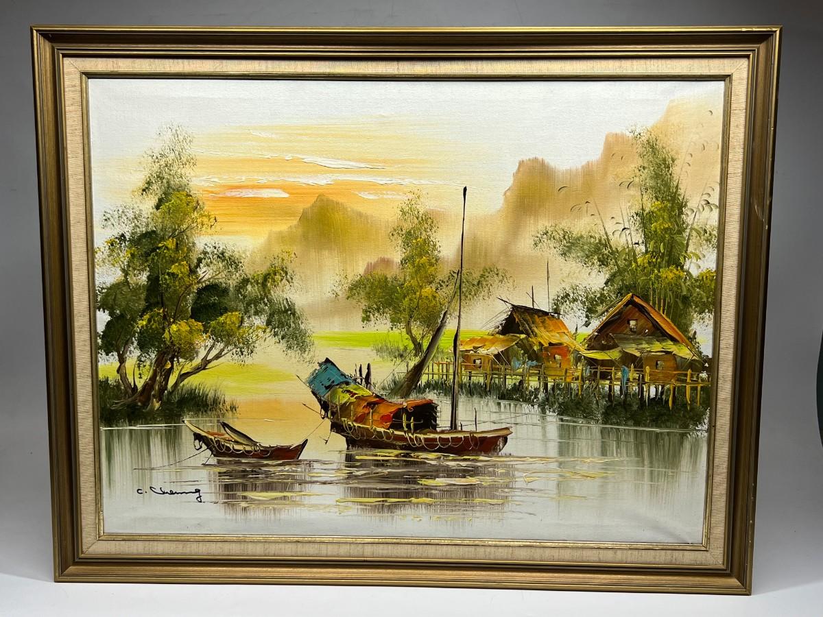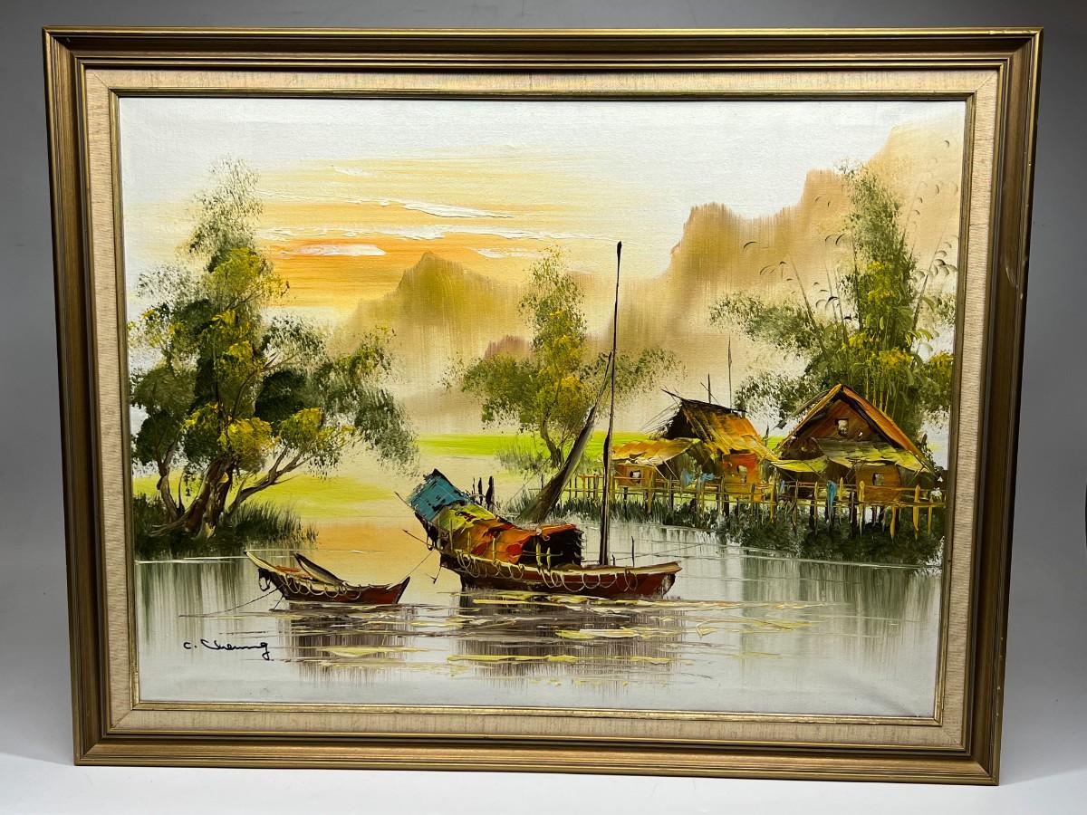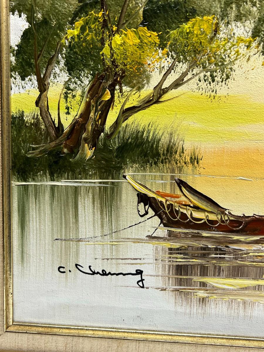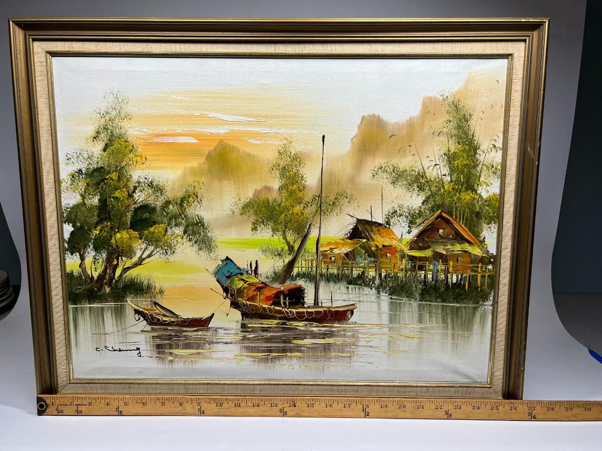 Vintage Midcentury Asian Oriental Fishing Boat Junk Ship on Water Painting Signed. In good condition. Looks to be signed by artist C. Cheung or C. Cheing, see signature. Nicely painted, striking color palette.