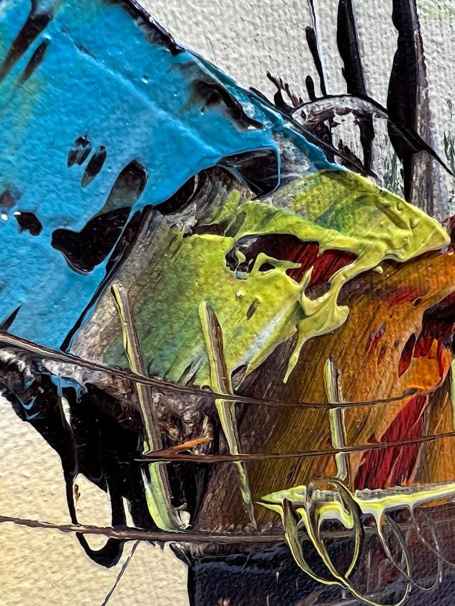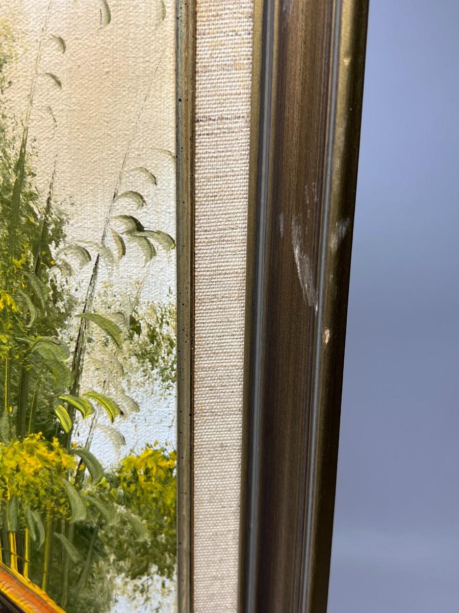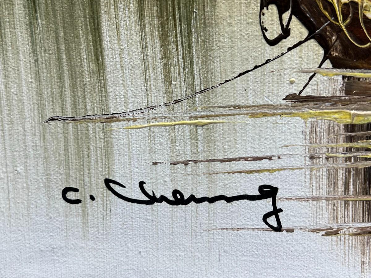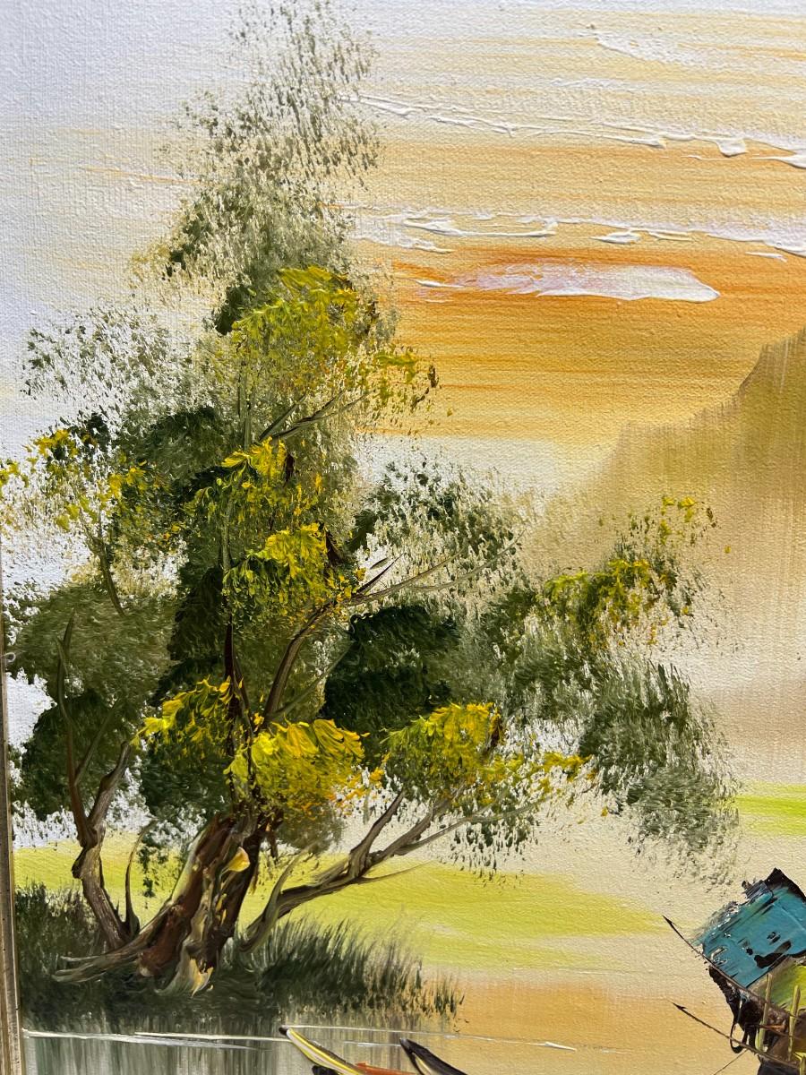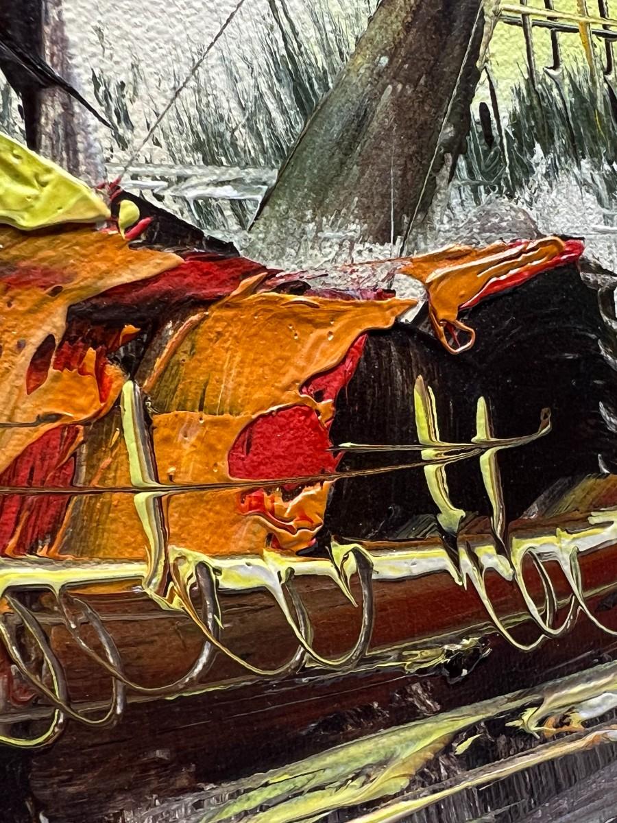 Vintage Midcentury Asian Oriental Fishing Boat Junk Ship on Water Painting Signed. In good condition. Looks to be signed by artist C. Cheung or C. Cheing, see signature. Nicely painted, striking color palette.