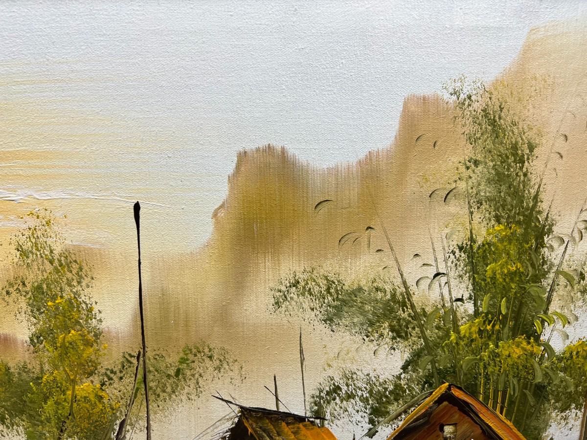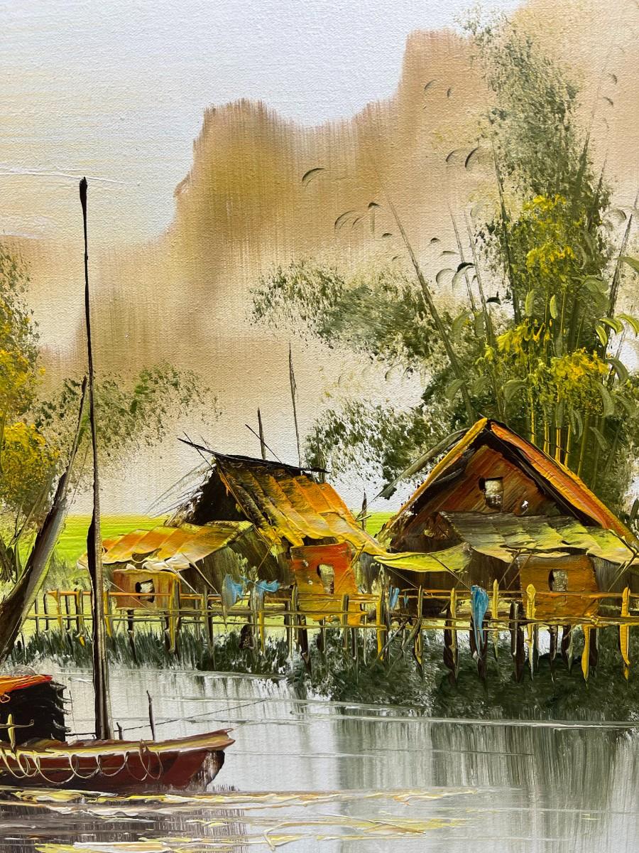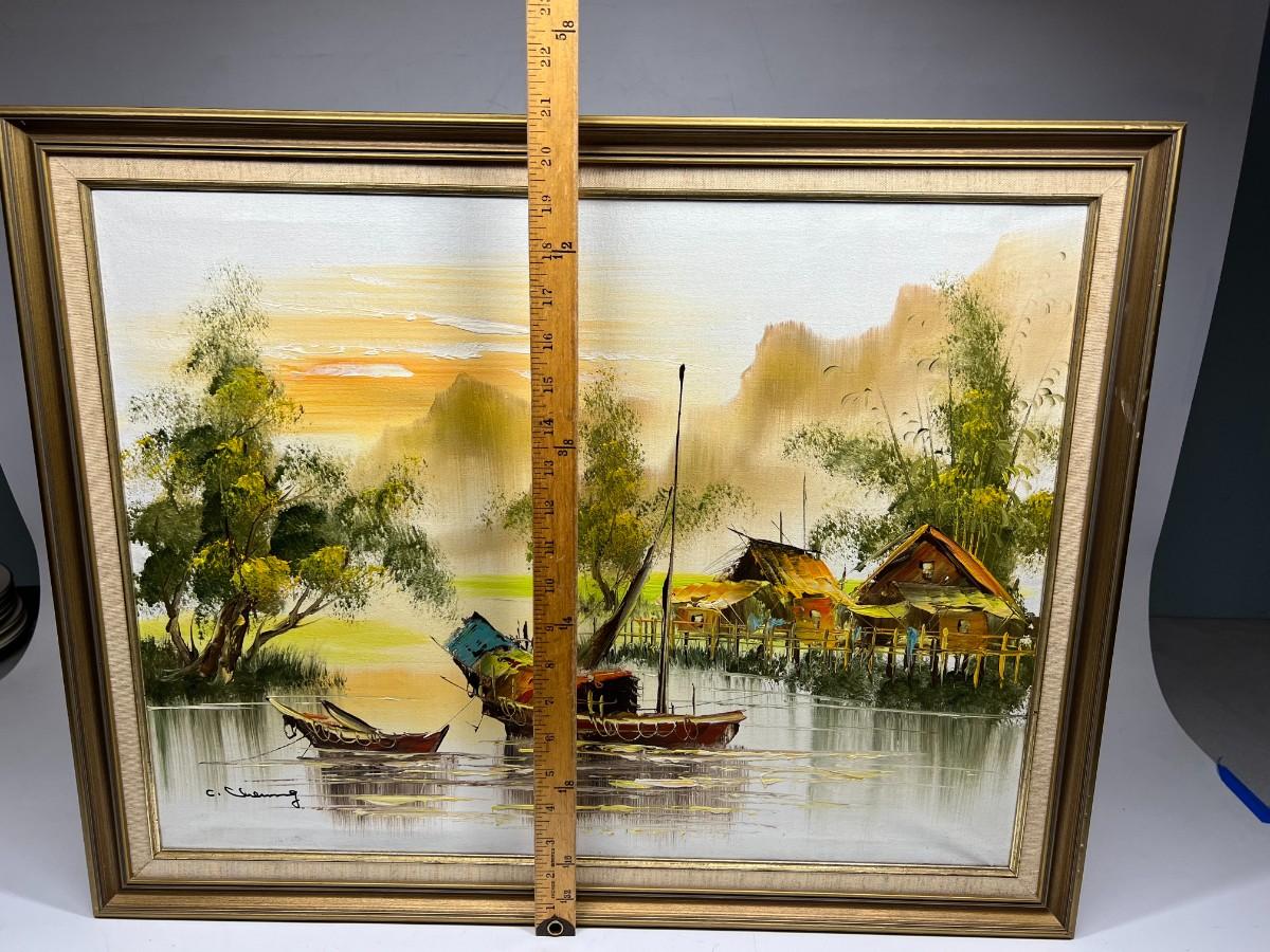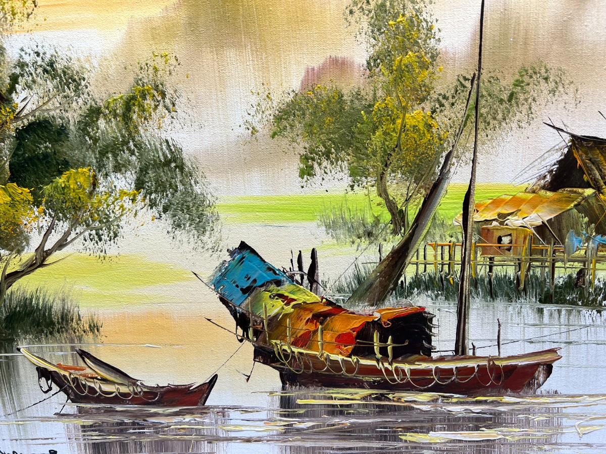 Vintage Midcentury Asian Oriental Fishing Boat Junk Ship on Water Painting Signed
