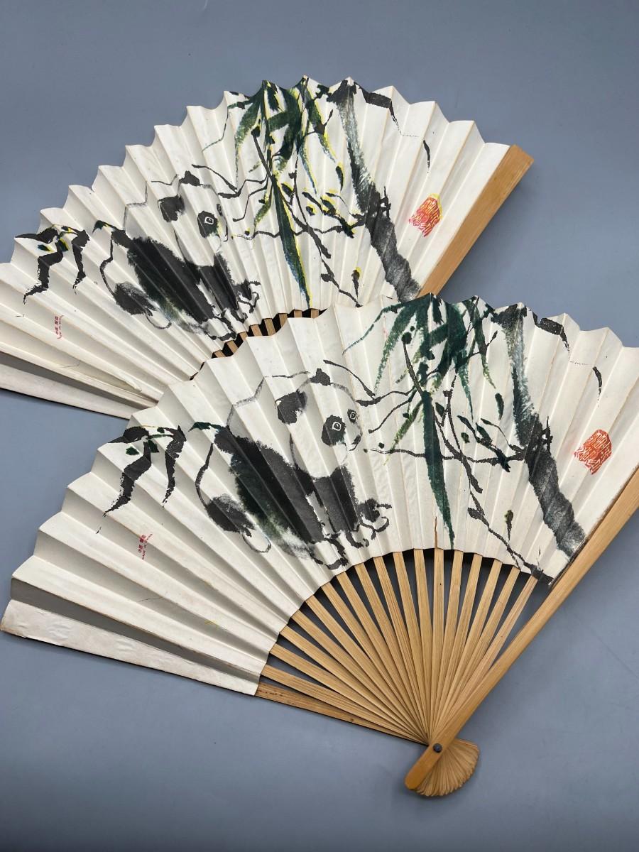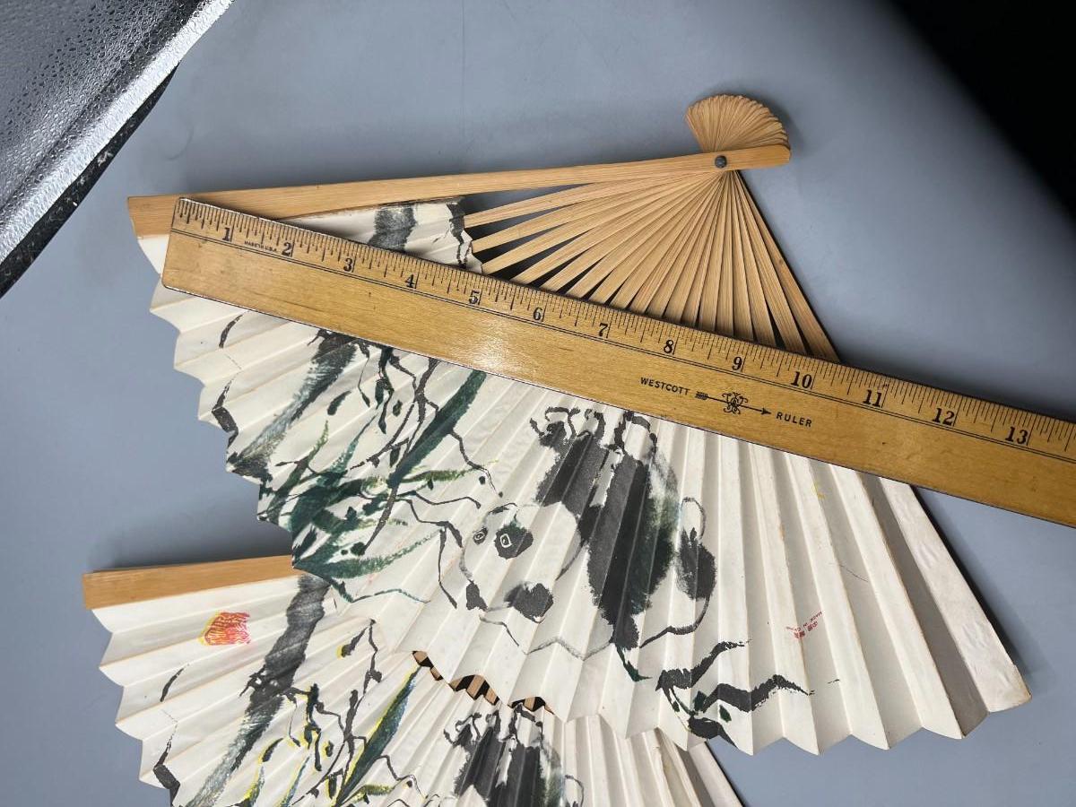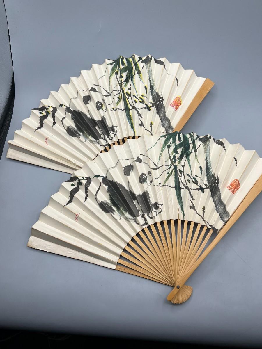Vintage Pair of Panda Chinese Bamboo Wooden Folding Fans