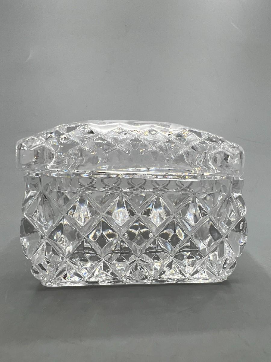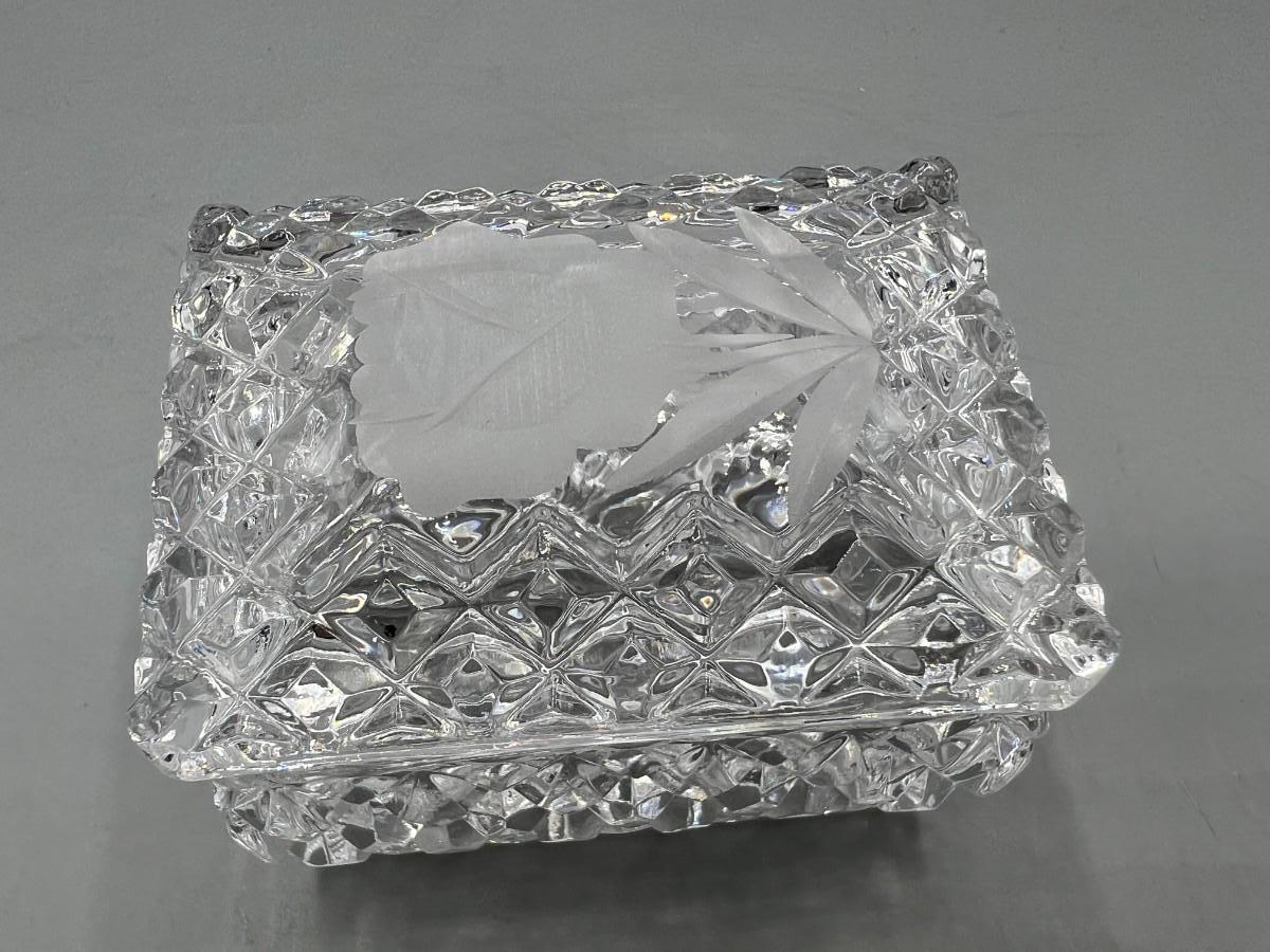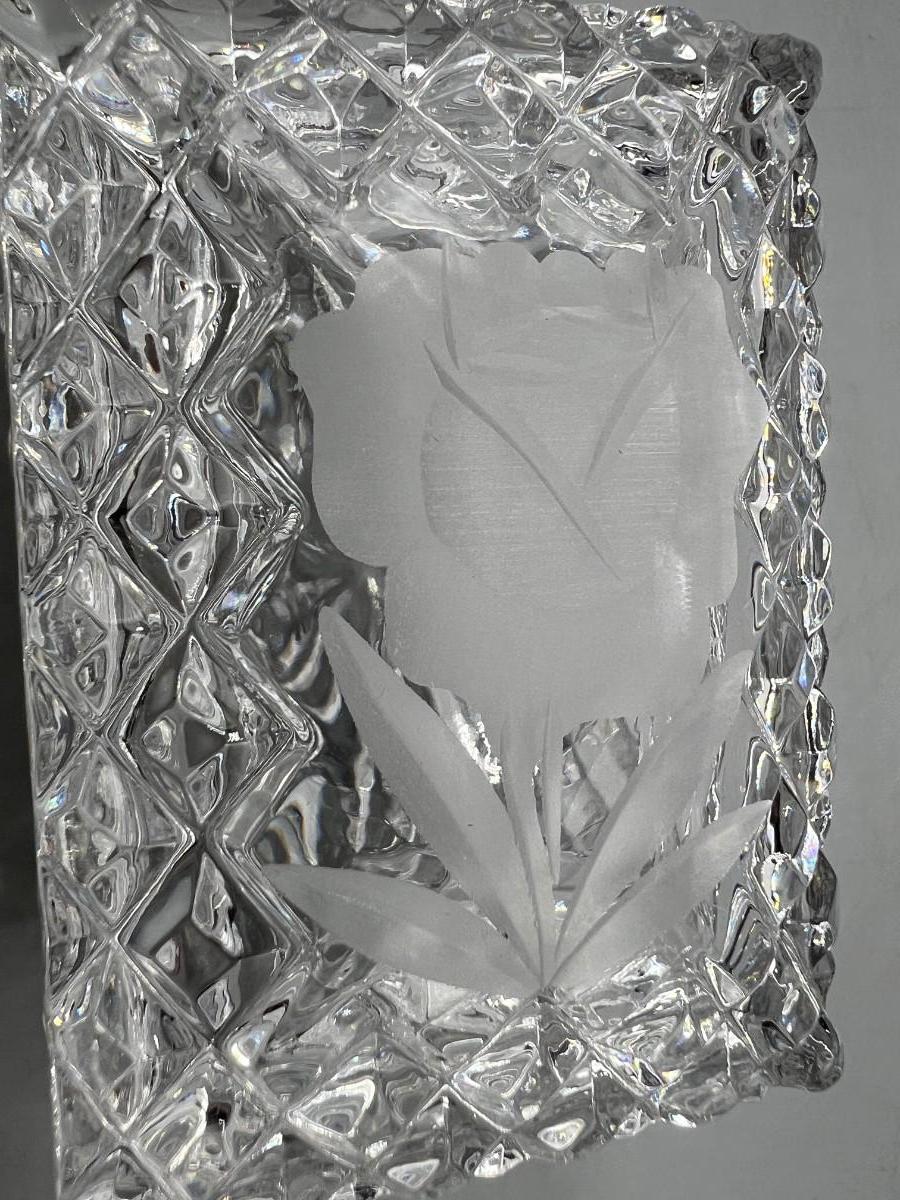 Vintage Diamond Cut Frosted Rose Crystal Glass Lidded Trinket Dish Jewelry Box. In good condition.