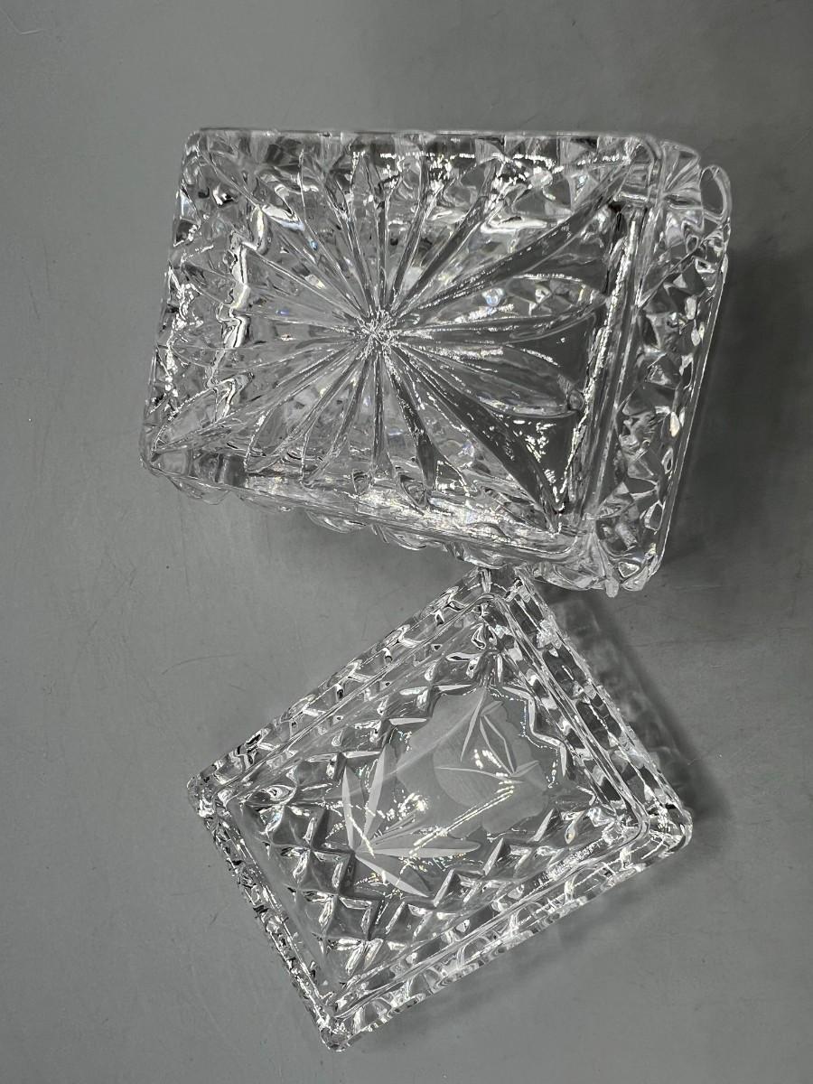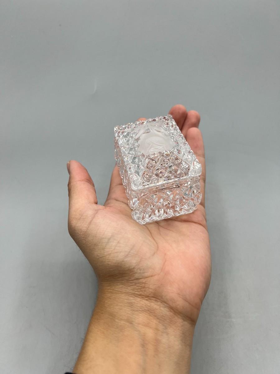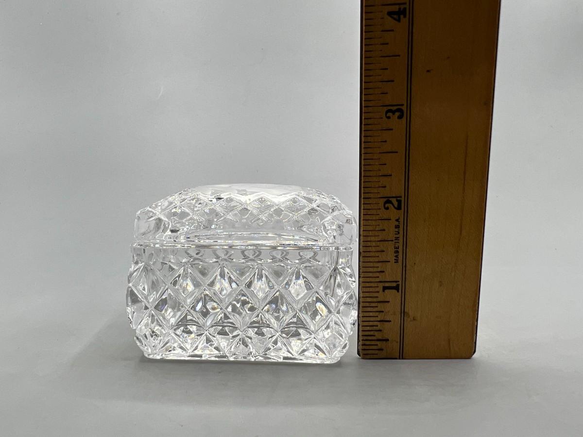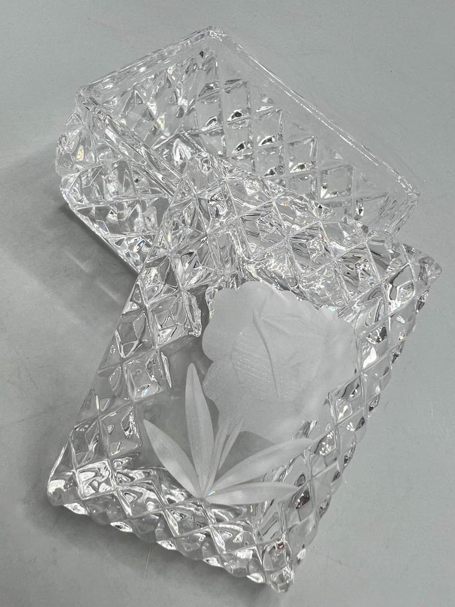 Vintage Diamond Cut Frosted Rose Crystal Glass Lidded Trinket Dish Jewelry Box. In good condition.