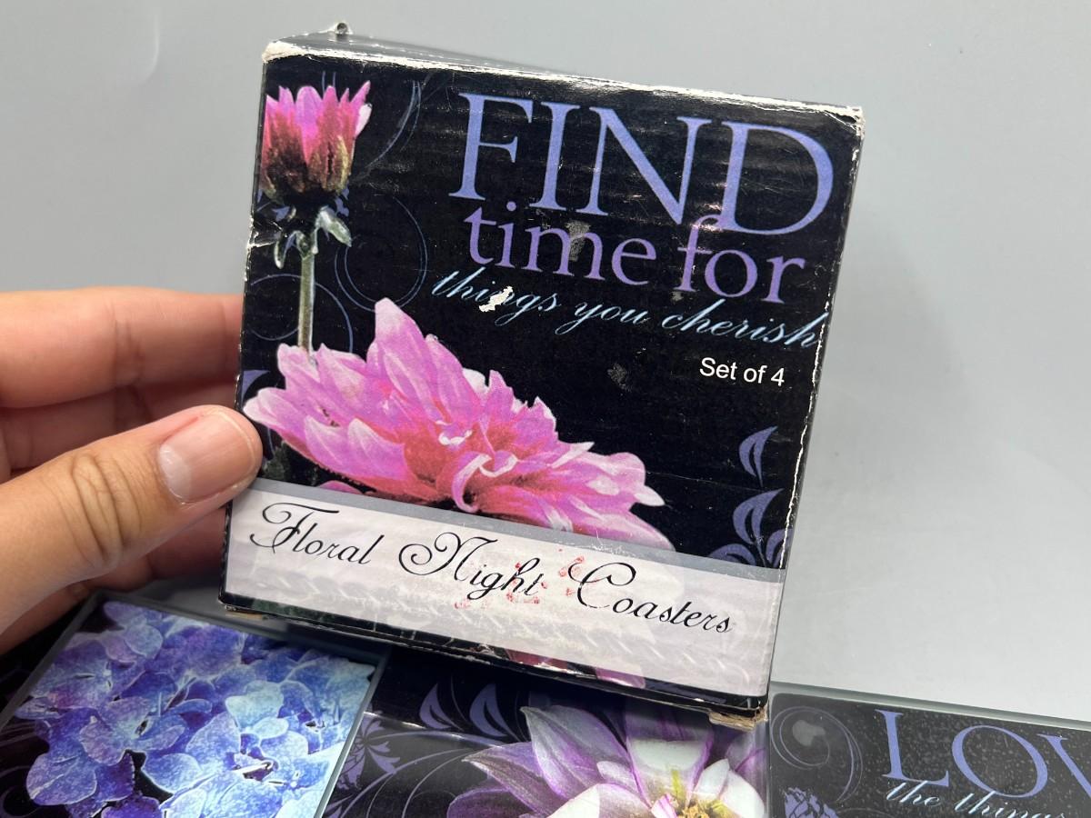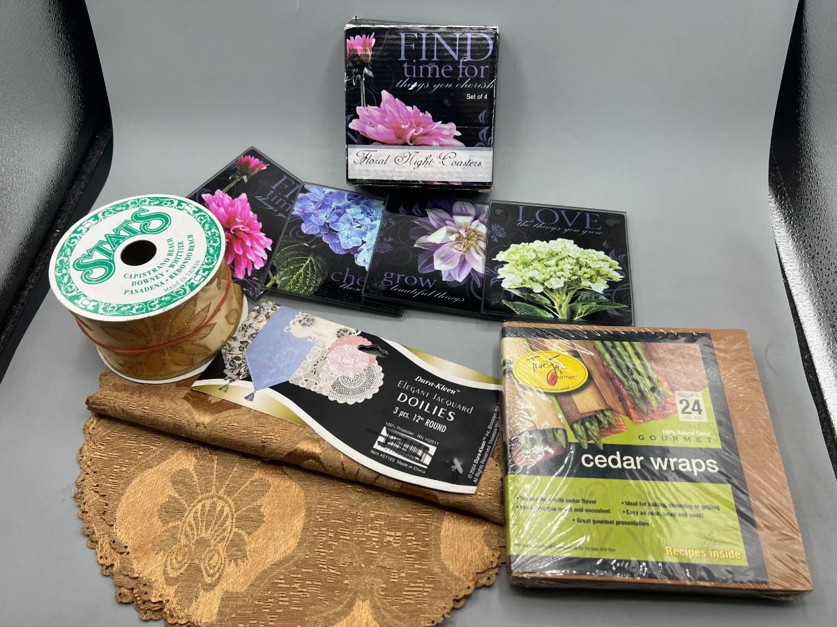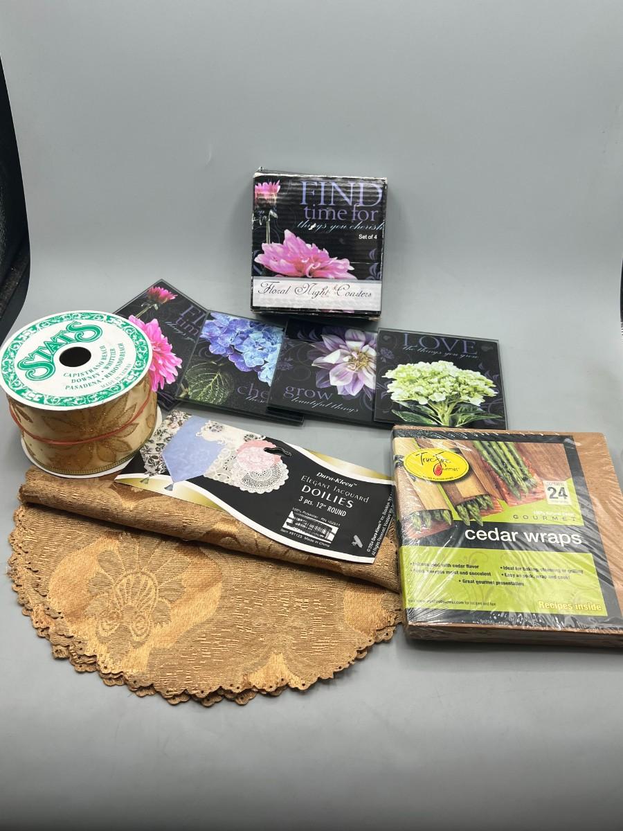 Lot of Dinnerware Craft Lot Cedar Wraps, Floral Night Glass Coasters, Doilies & More