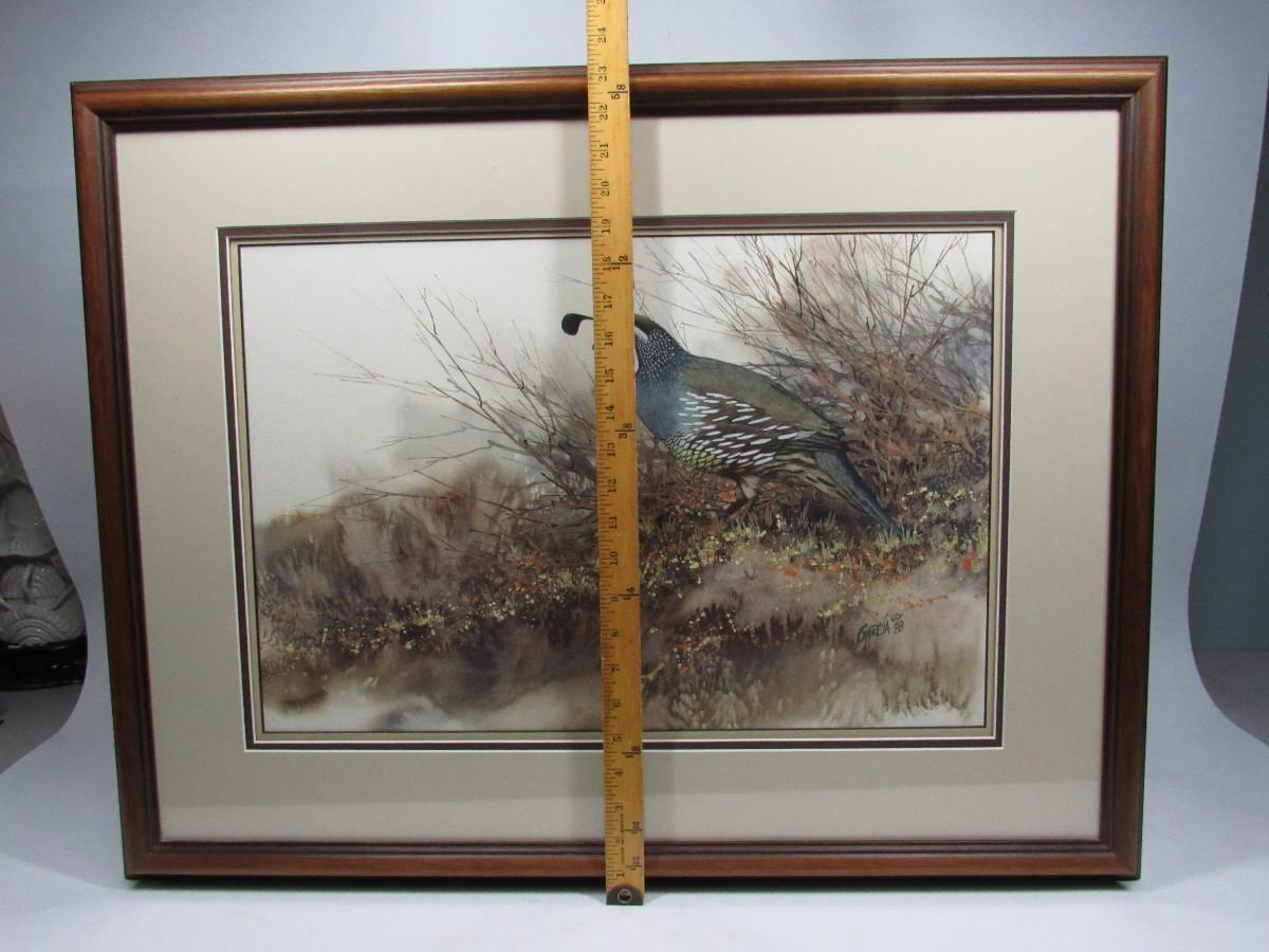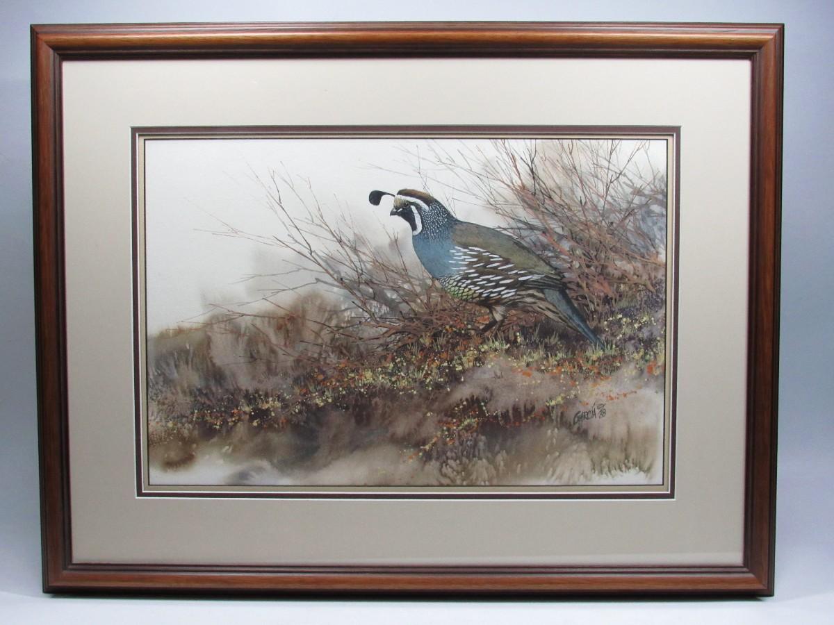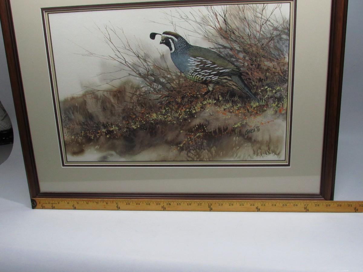 Vintage Framed Wild Quail Watercolor Nature Art Print by Artist Garcia