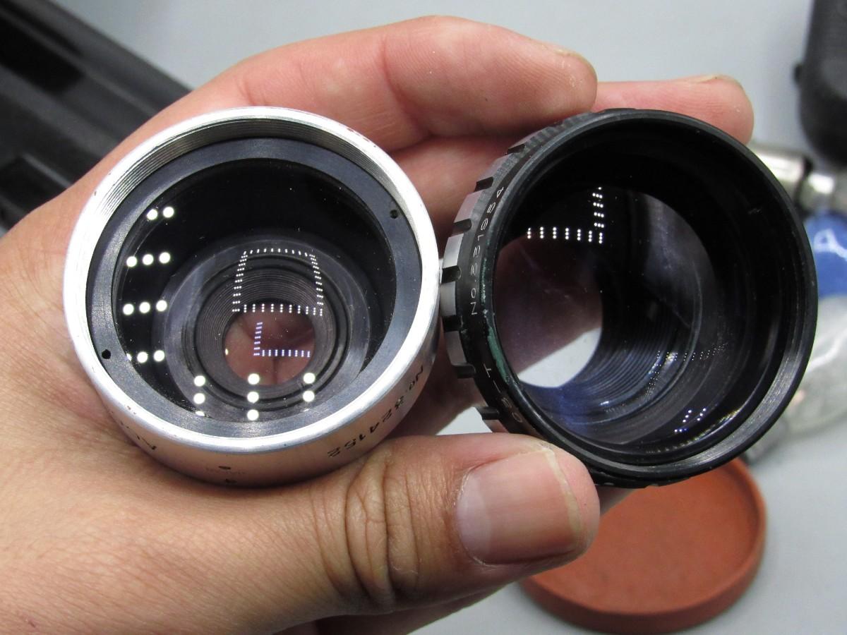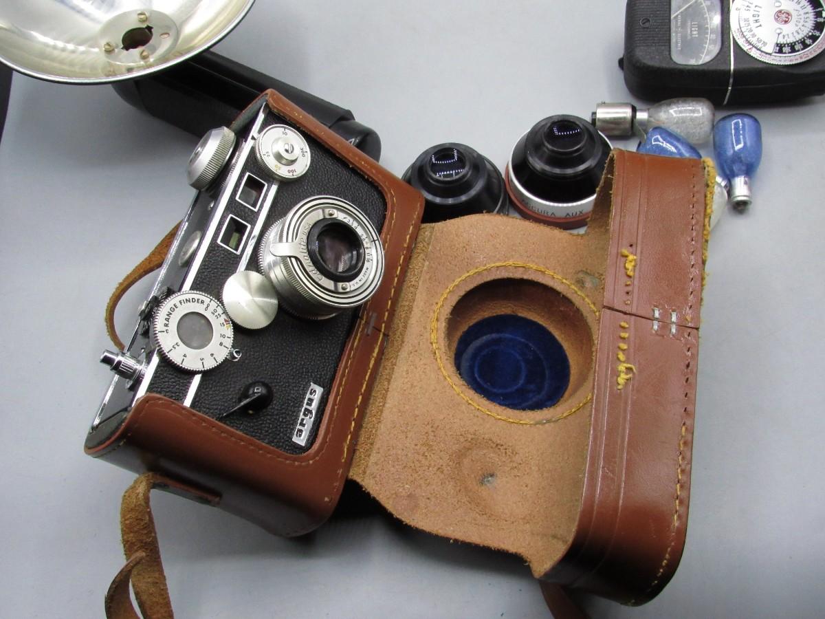 There is no significant damage to the camera, bulbs, lenses or light meter. There is wear to the leather cases and to the flash attachment. Check pictures for details and for what comes in the lot
