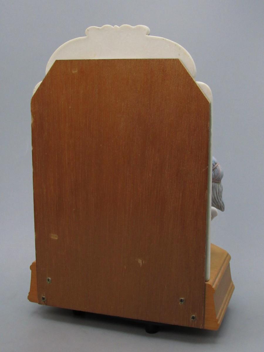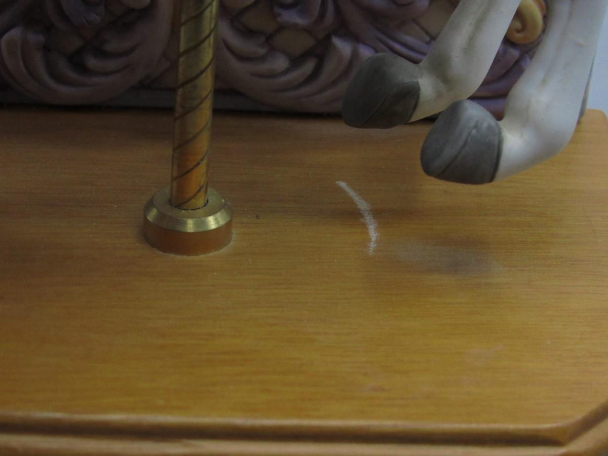 The horse does not go up or down, only plays the music when wound up. There are some scrapping marks on the wood, check pictures for more details.