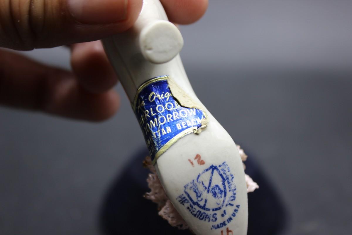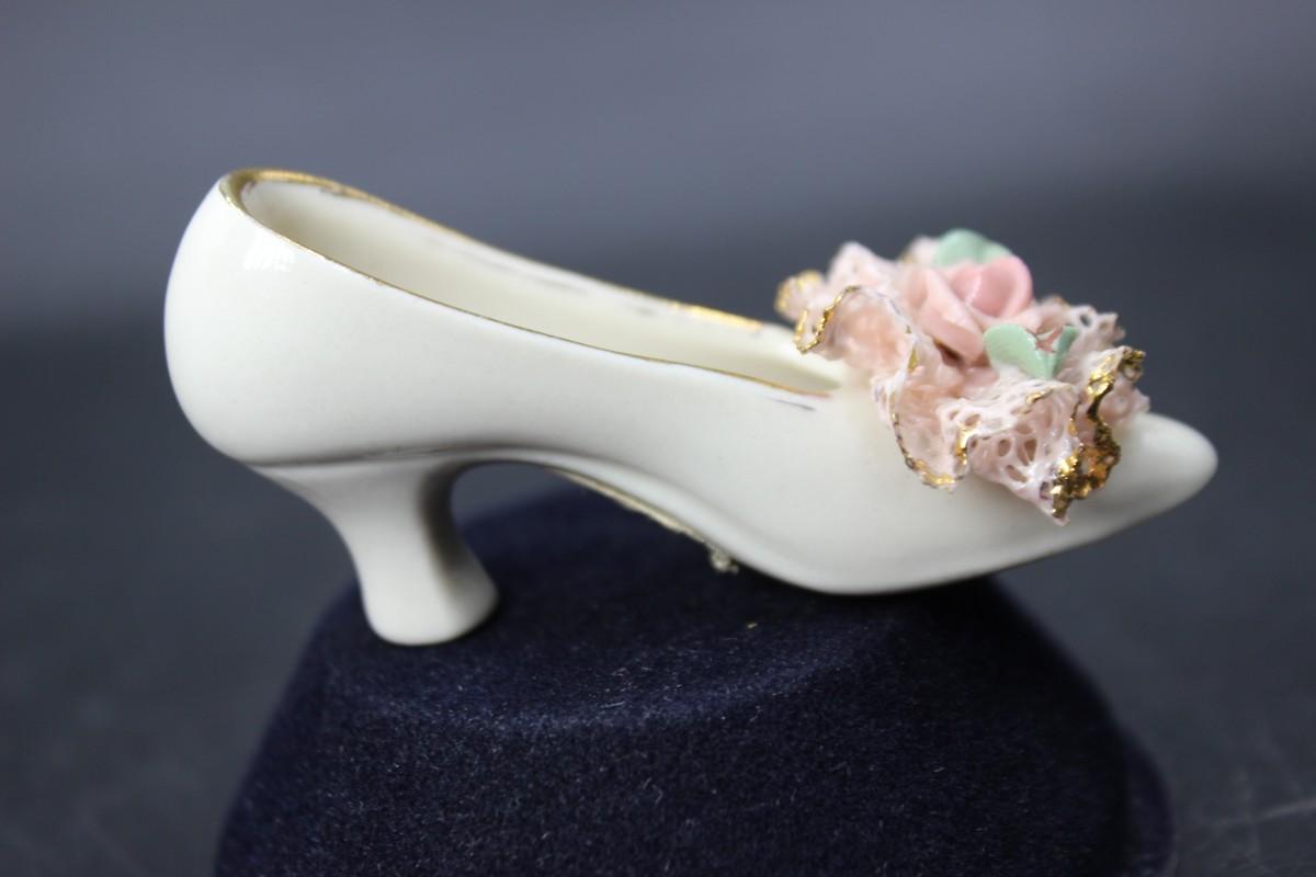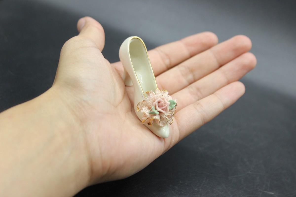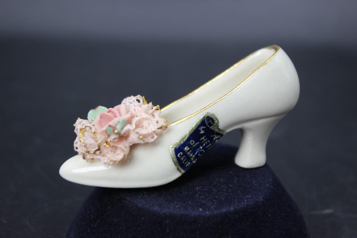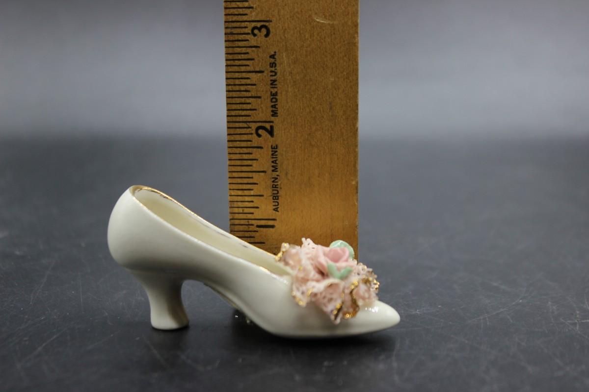 Vintage Miniature Porcelain Ceramic Flower Adorn Slipper Heel Shoe Heirloom of Tomorrow USA. In good vintage condition. Has flower and porcelain lace on the toe. Original sticker and stamp on the underside. Under 2" size. May have a flea bite chip in lace.