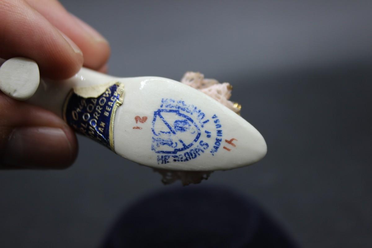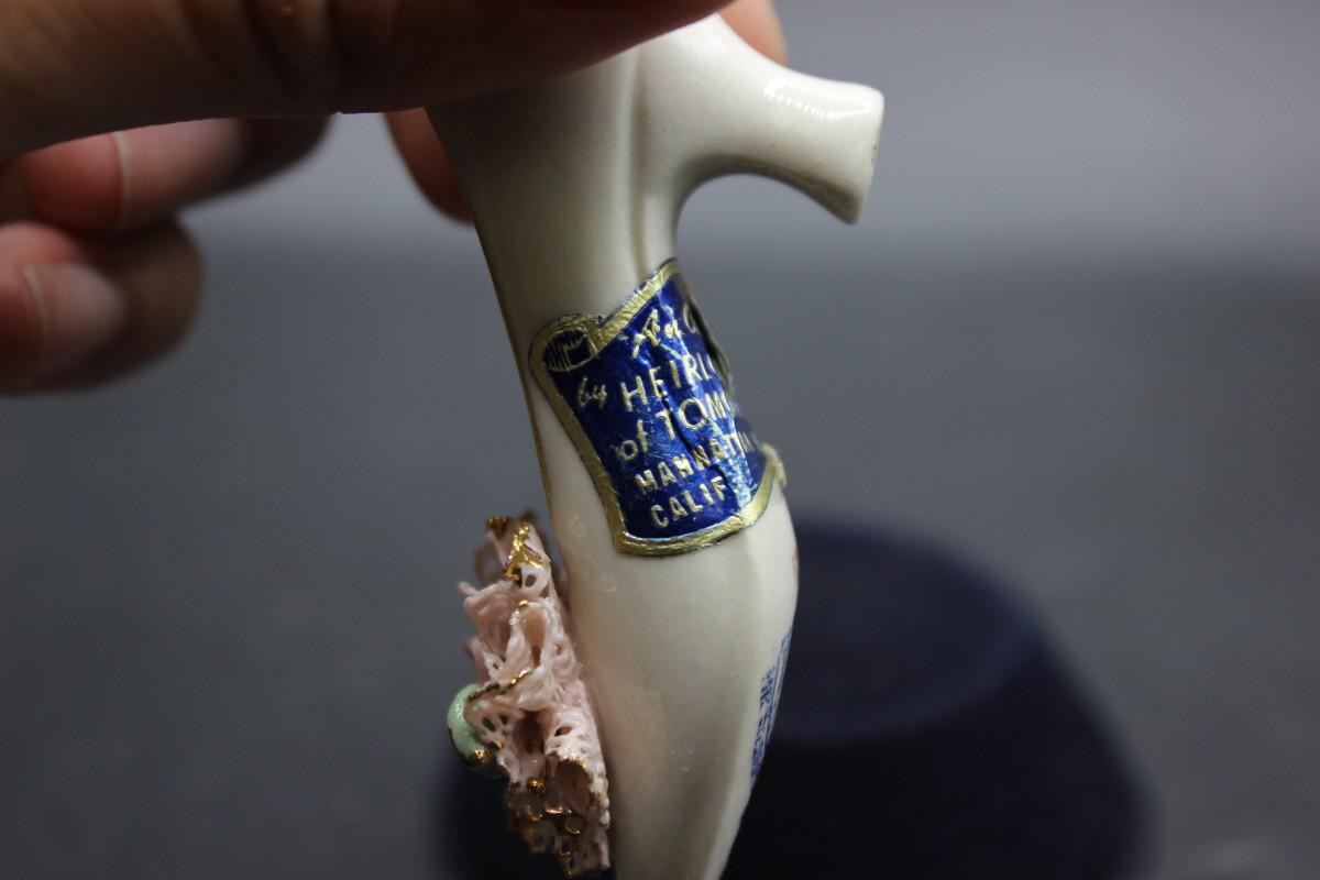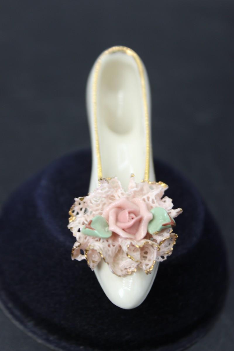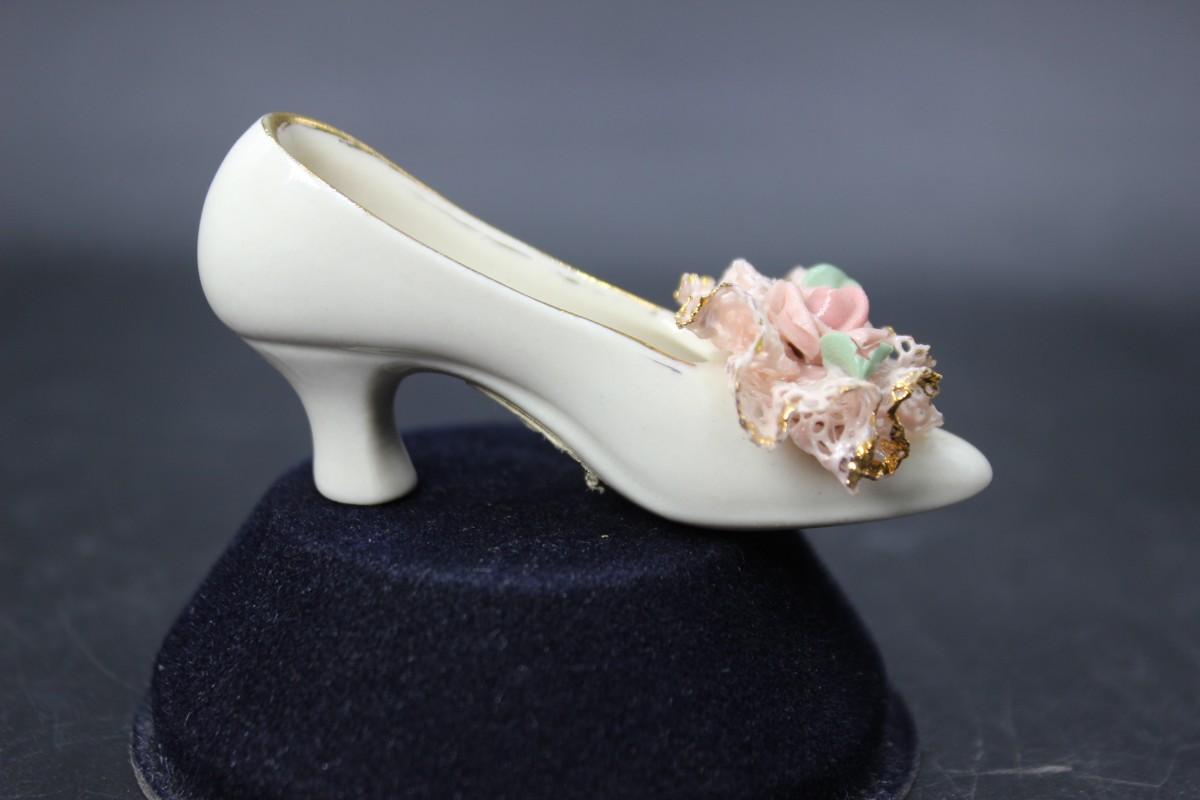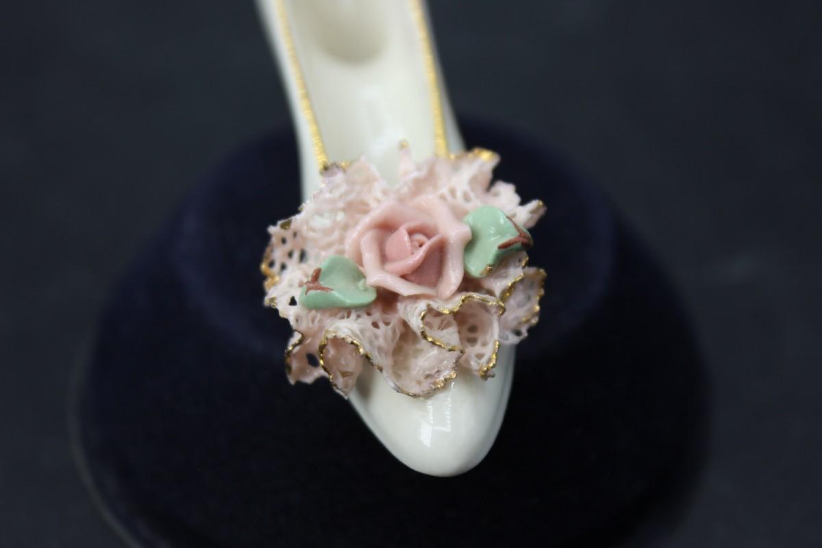 Vintage Miniature Porcelain Ceramic Flower Adorn Slipper Heel Shoe Heirloom of Tomorrow USA. In good vintage condition. Has flower and porcelain lace on the toe. Original sticker and stamp on the underside. Under 2" size. May have a flea bite chip in lace.